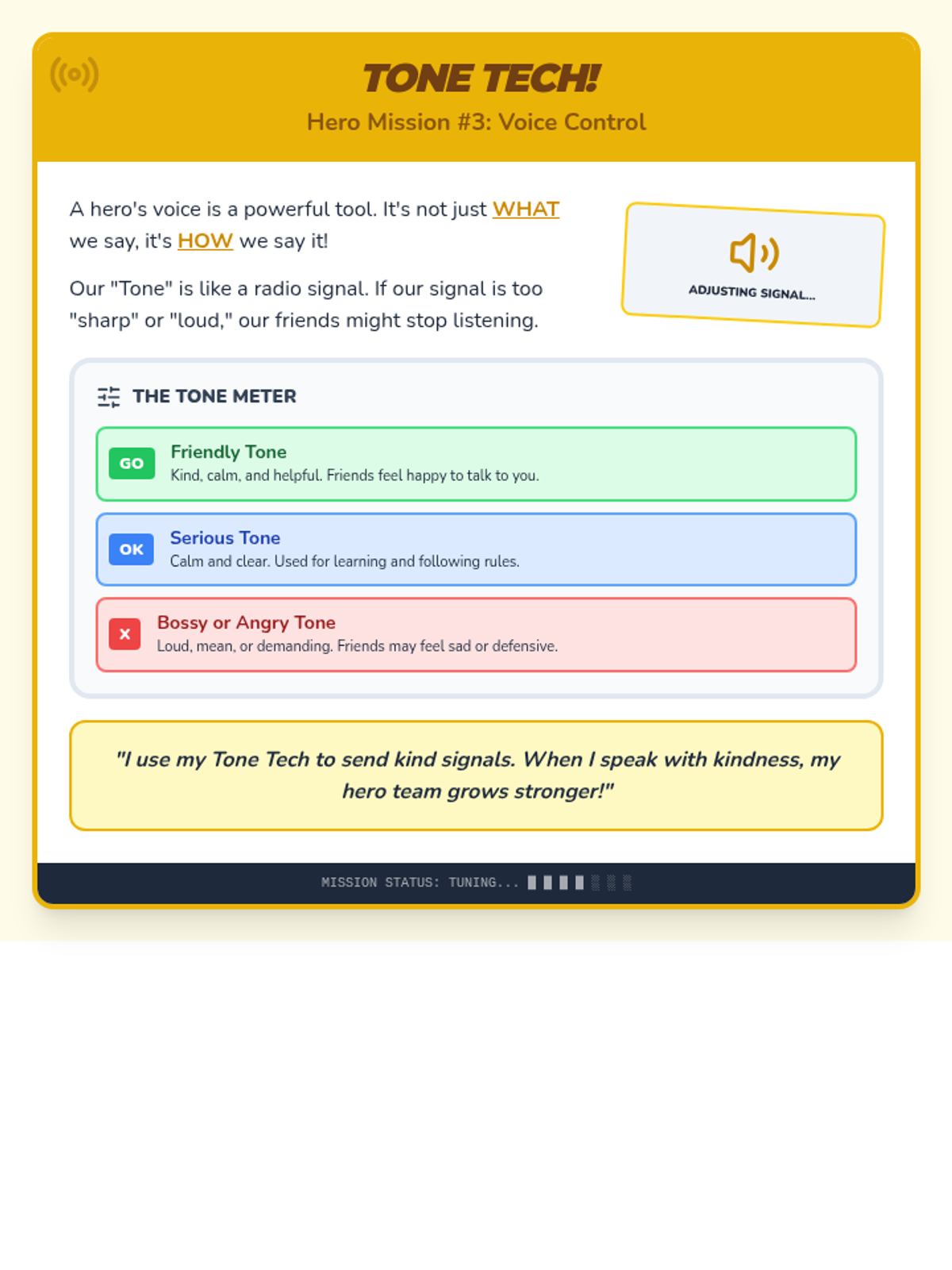 Focusing on 'Tone Tech' - learning how the way we say words matters as much as the words themselves. Students practice identifying 'Friendly', 'Angry', and 'Bossy' tones.