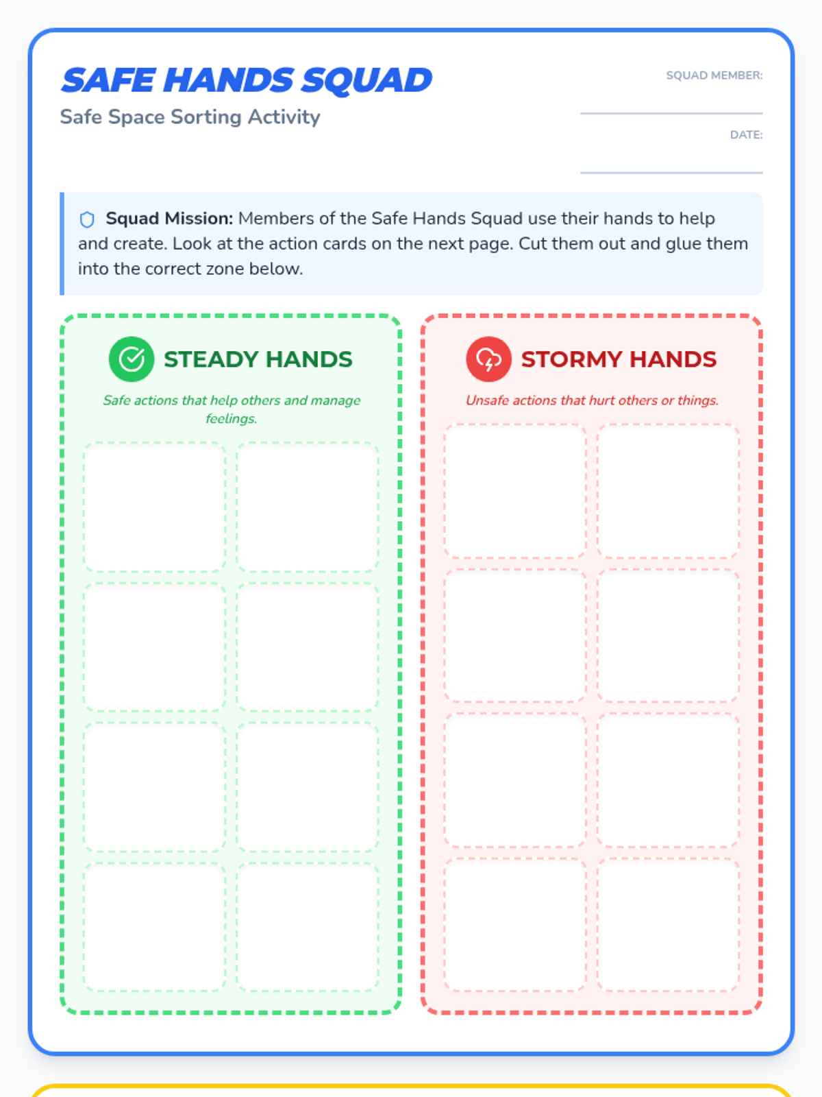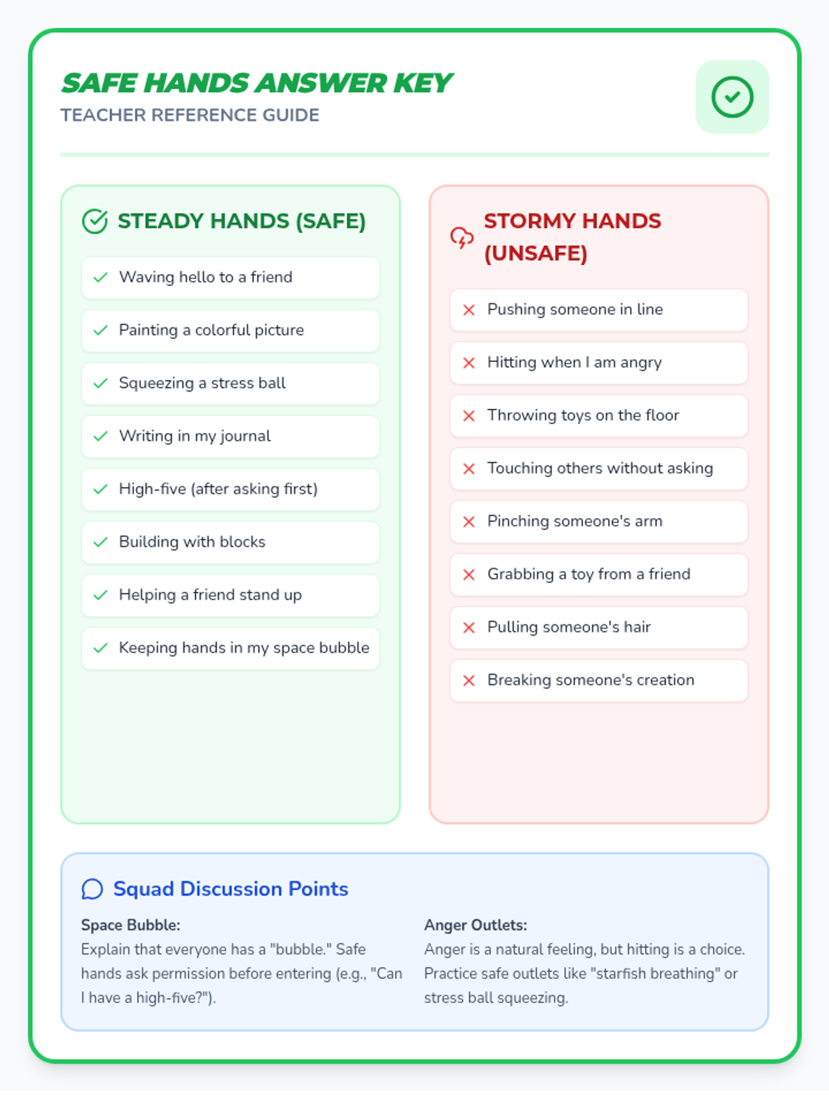 A lesson focused on teaching students how to use their hands safely, respect personal boundaries, and manage strong emotions like anger through a hands-on sorting activity.
