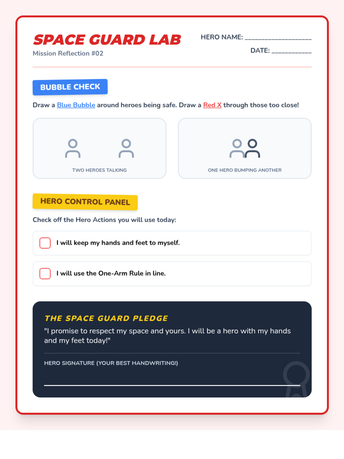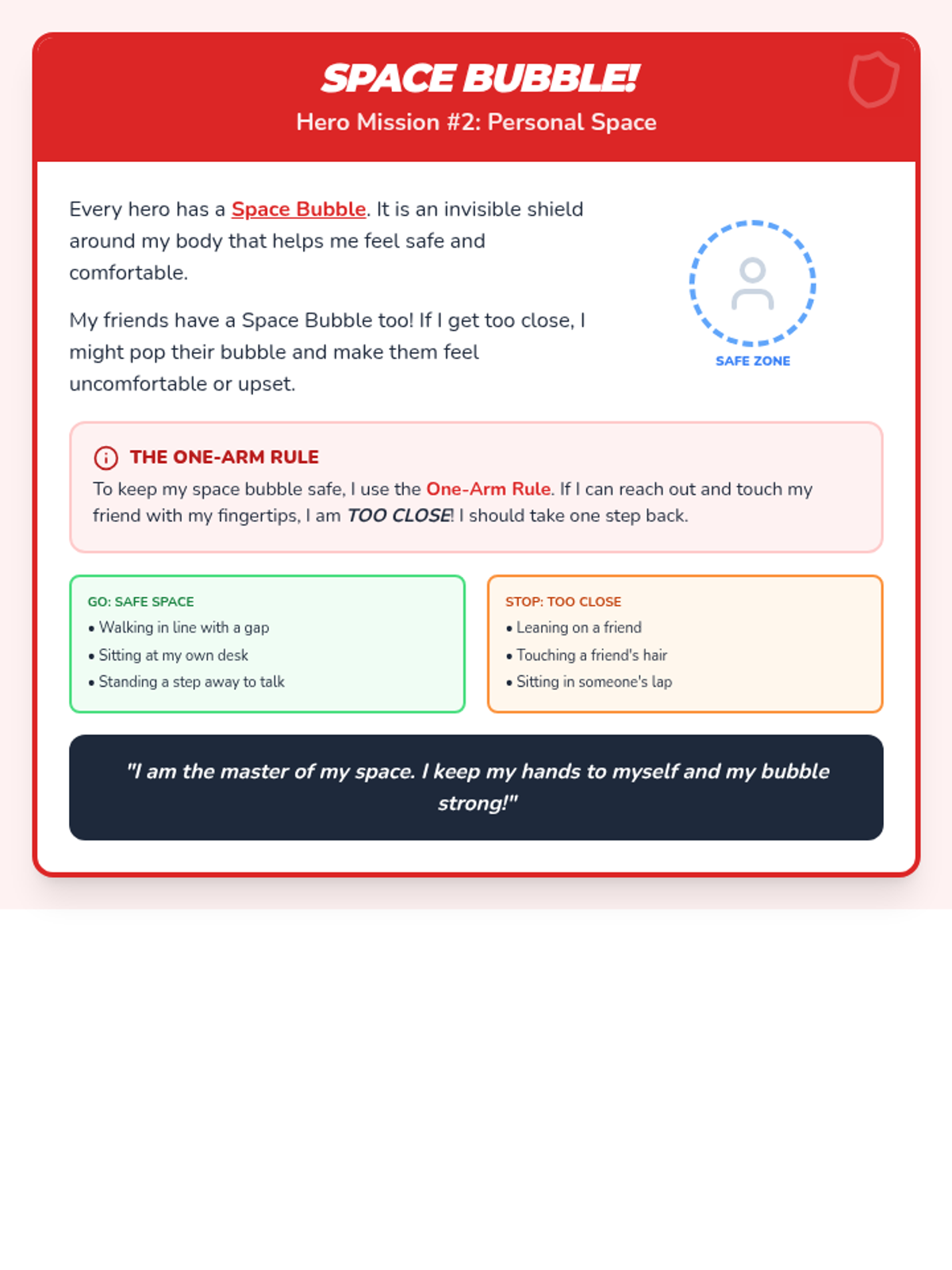 Introduction to 'The Space Bubble' - understanding personal boundaries and the 'One-Arm Rule' to keep themselves and others comfortable. Students practice identifying when they are too close to a friend.
