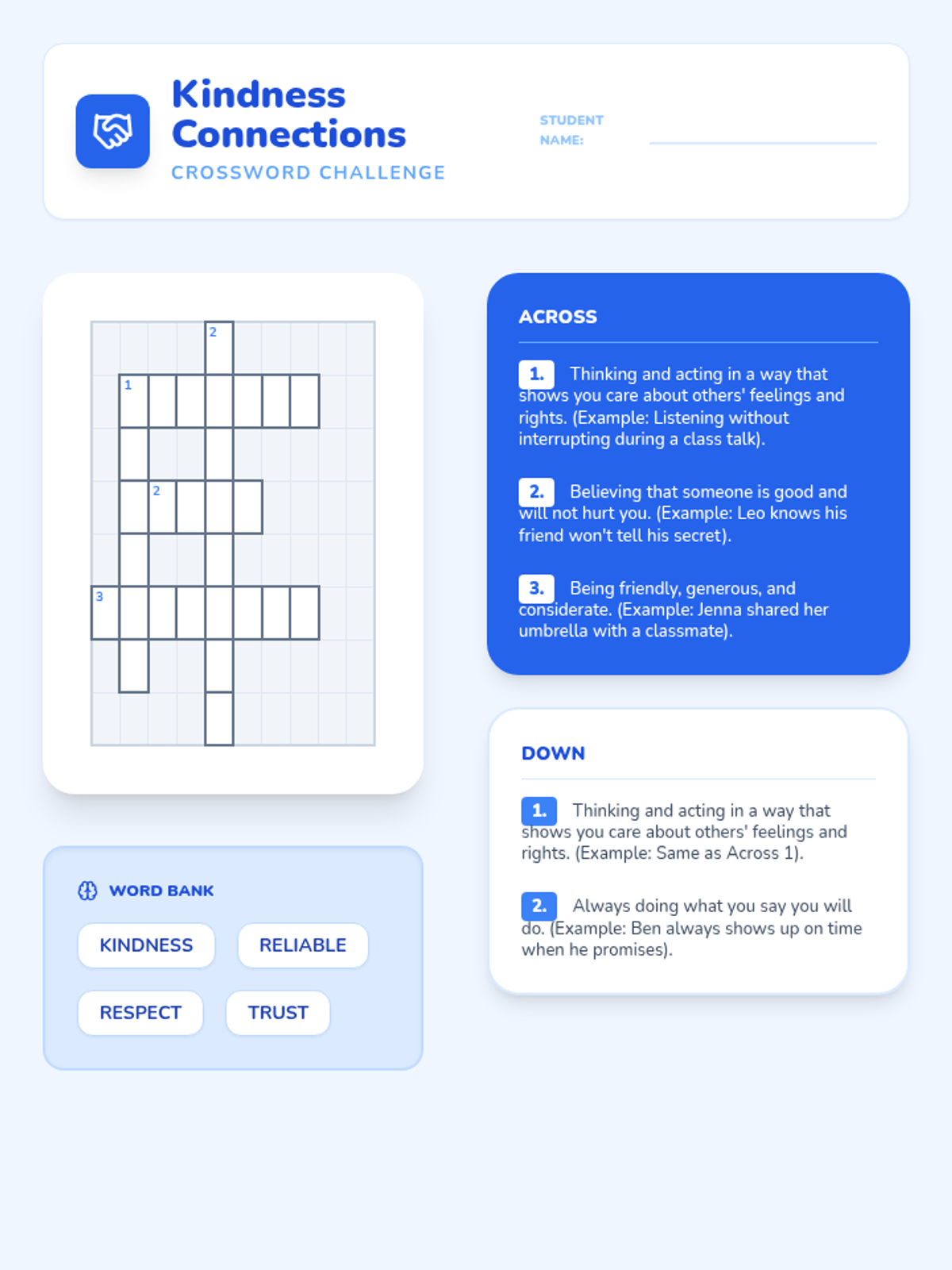 A lesson focused on understanding and applying positive character traits and friendship values through situational practice. Students explore vocabulary words like empathy, honesty, and cooperation through a crossword puzzle and interactive discussion.
