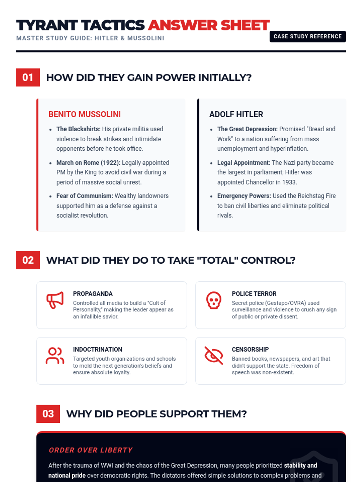 This lesson explores the methods used by Benito Mussolini and Adolf Hitler to establish totalitarian regimes in Italy and Germany. Students will analyze tactics such as propaganda, terror, economic manipulation, and cults of personality to understand how 'total' control was achieved.