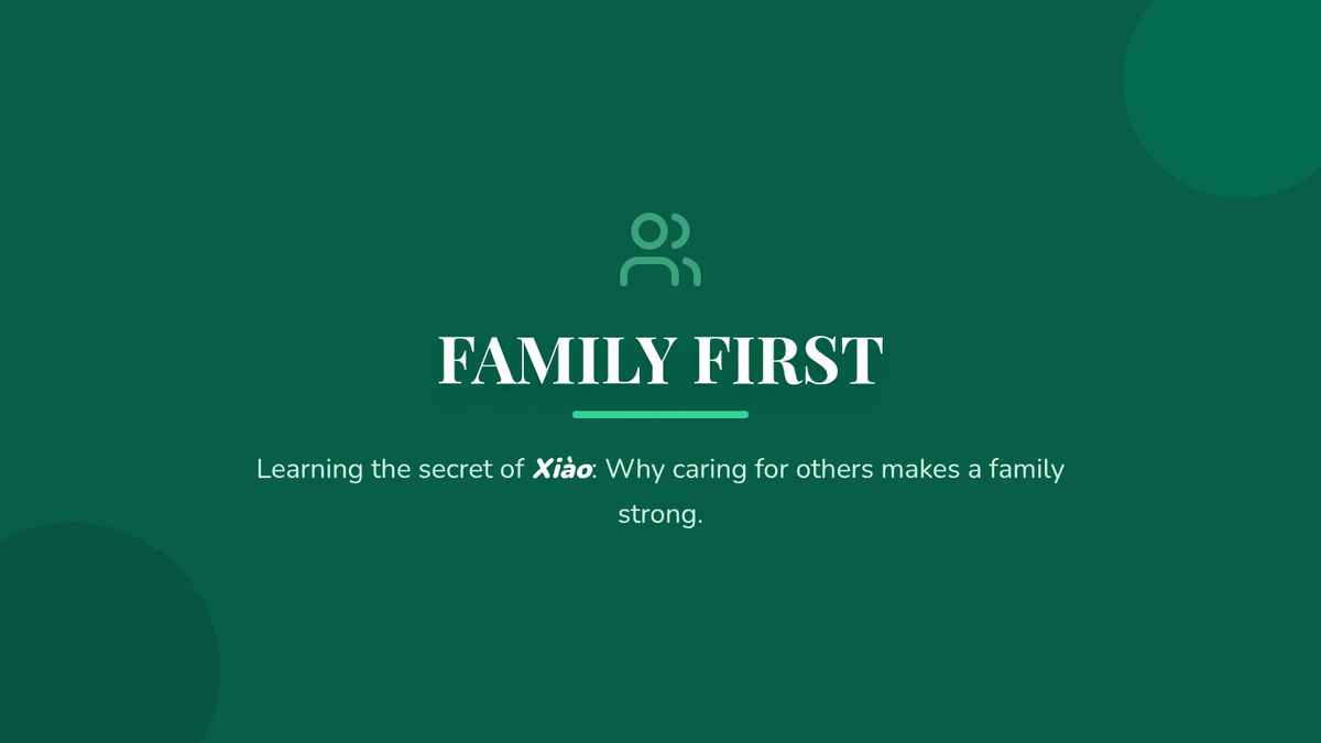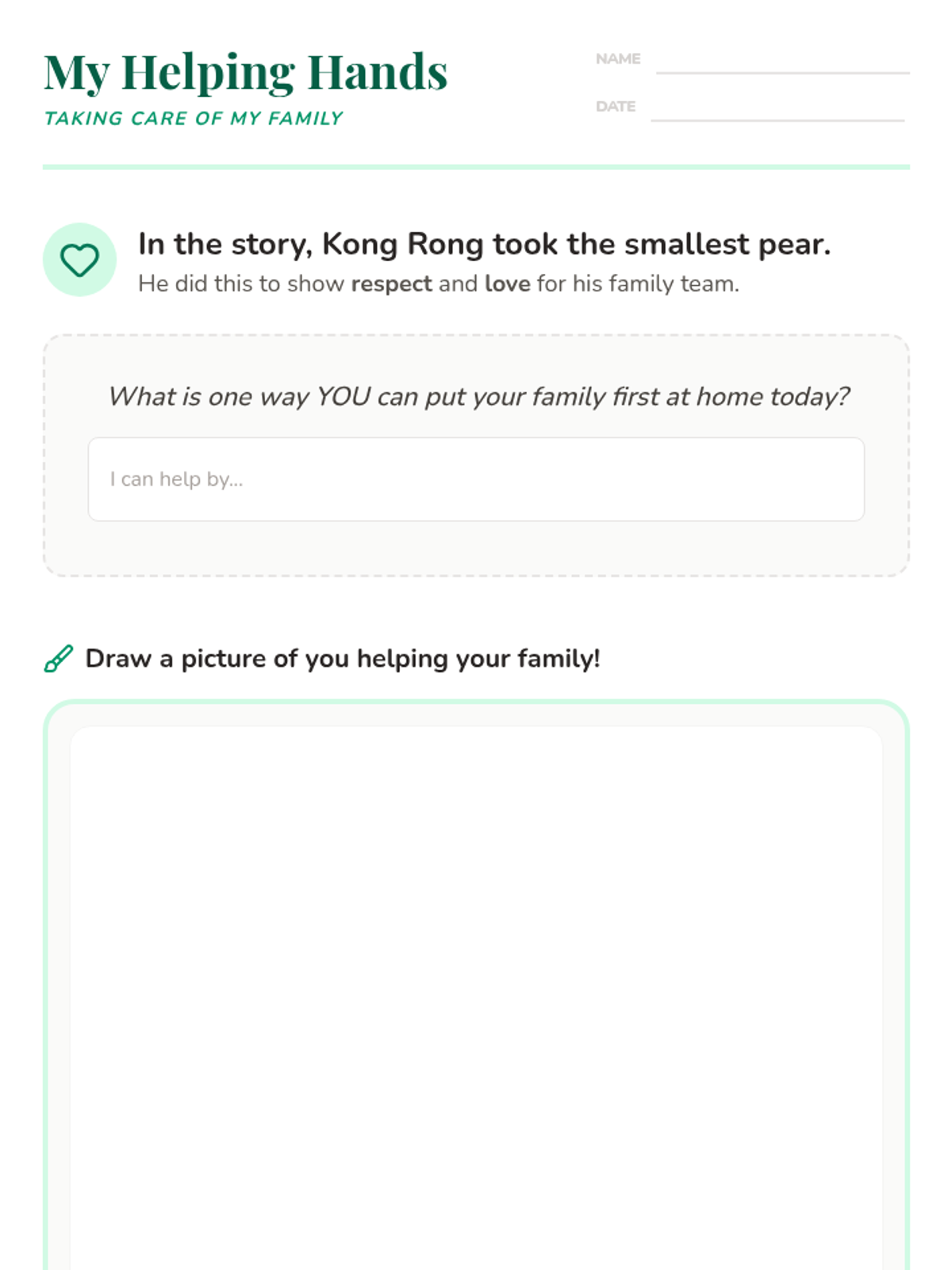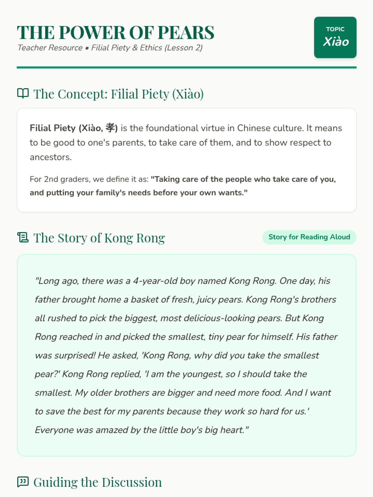 Using age-appropriate stories like 'Kong Rong Giving Up Pears', students discuss putting family first and caring for parents through the concept of filial piety.