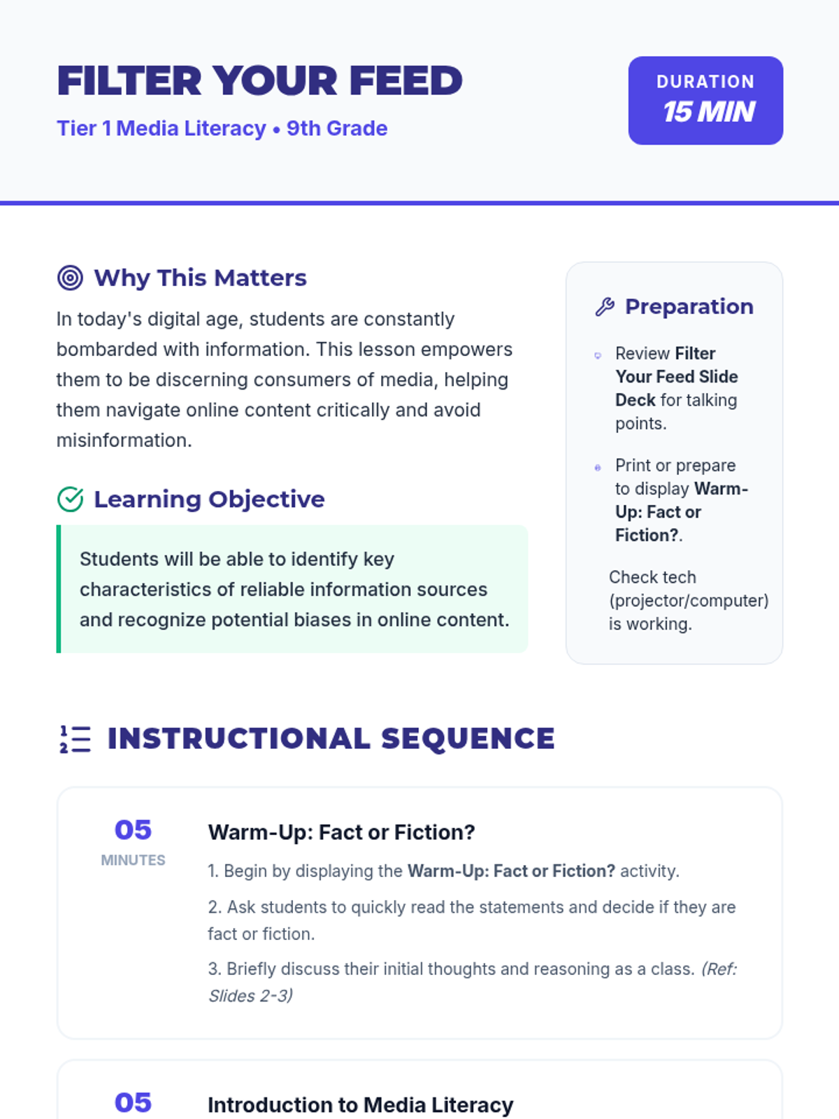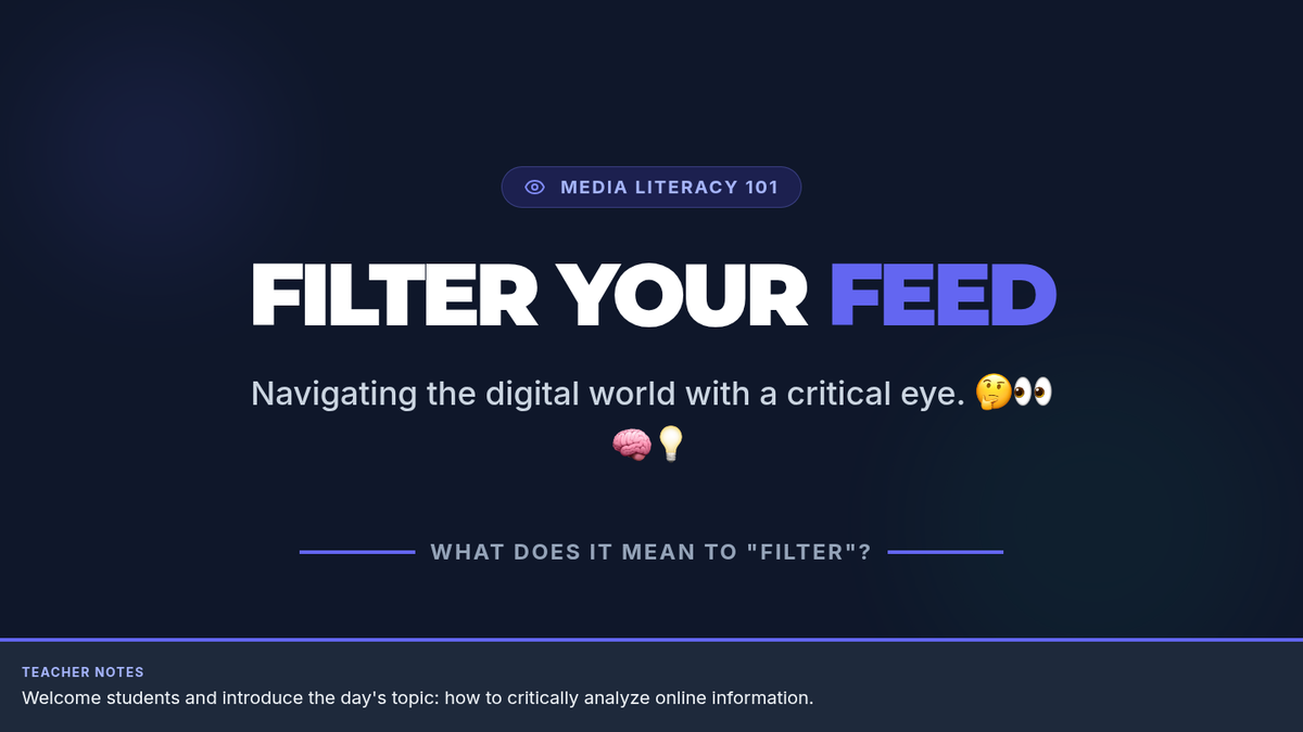 A 15-minute media literacy lesson for 9th graders designed to help them critically analyze online information, identify bias, and filter their digital feeds effectively.