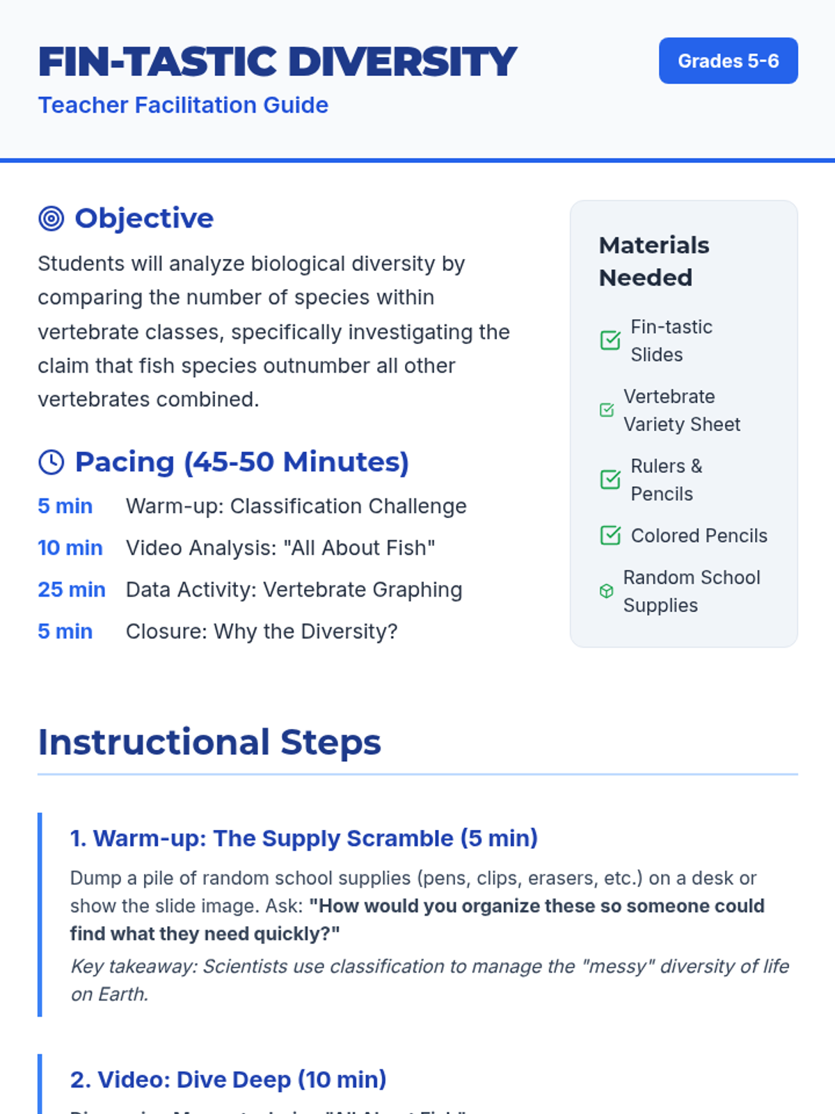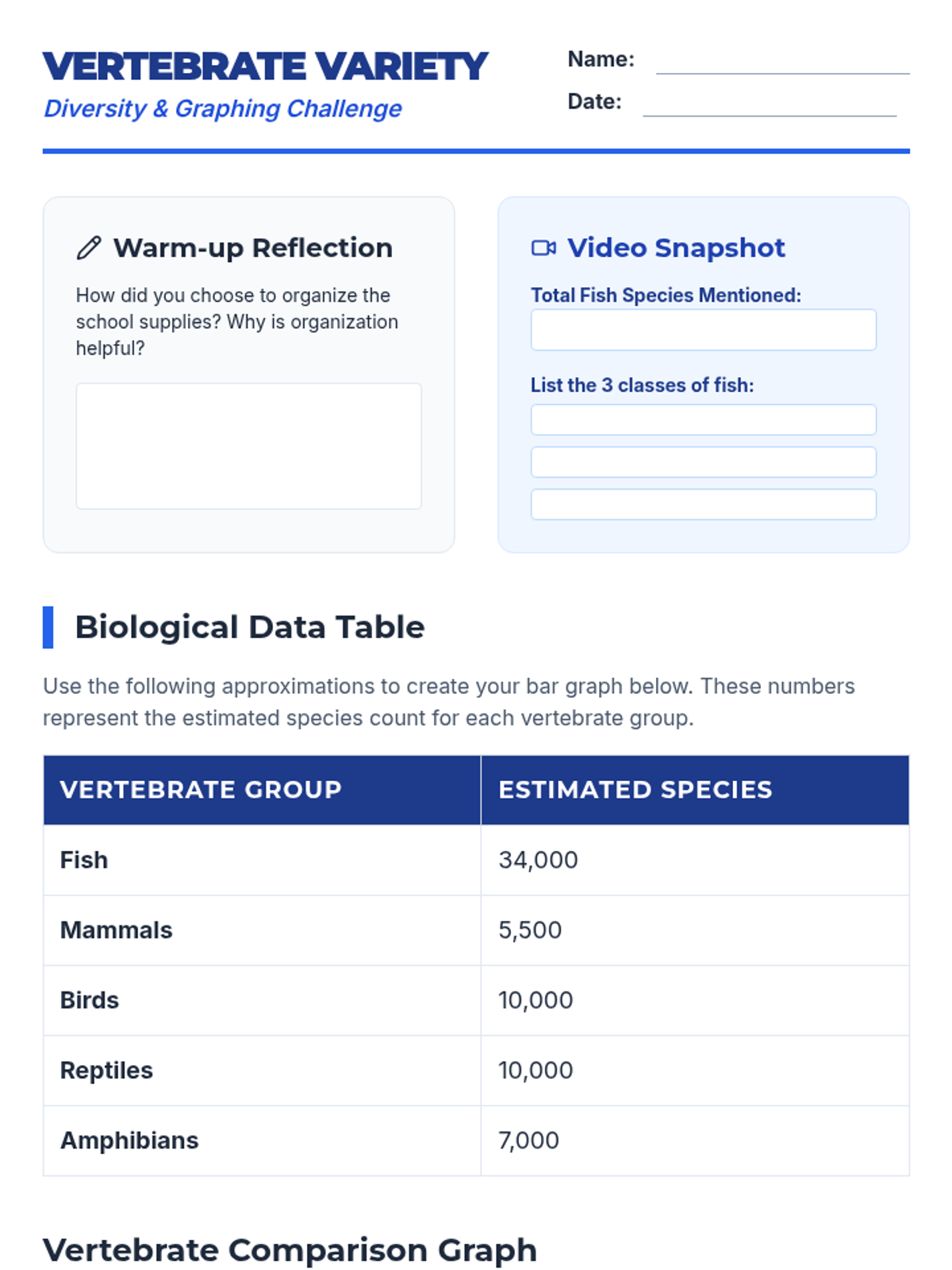 A comprehensive lesson exploring biological diversity and vertebrate classification, focusing on the staggering variety of fish compared to other animal groups through graphing and video analysis.