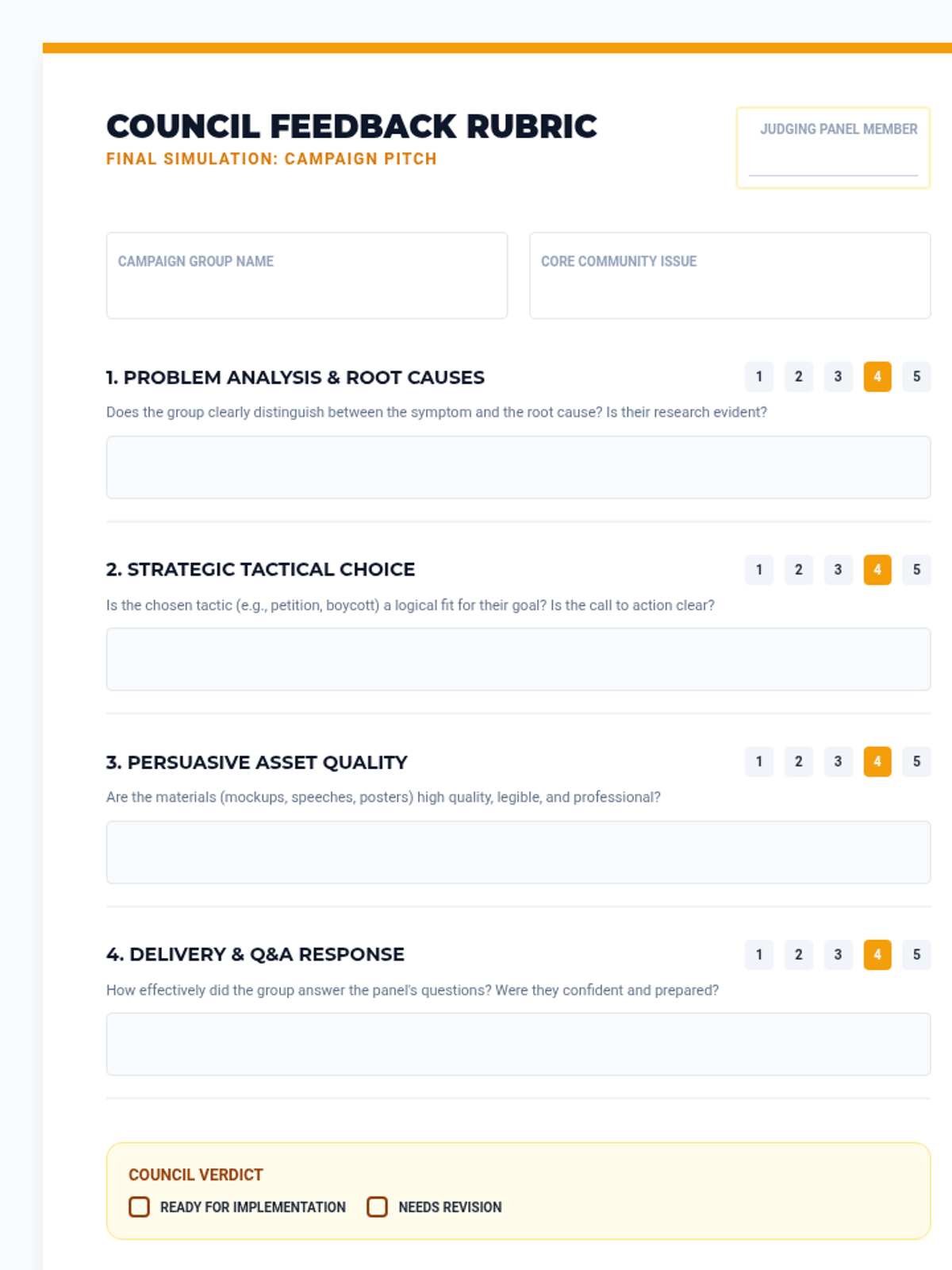 Students pitch their advocacy strategies to a mock community panel and reflect on the challenges and importance of civic engagement.
