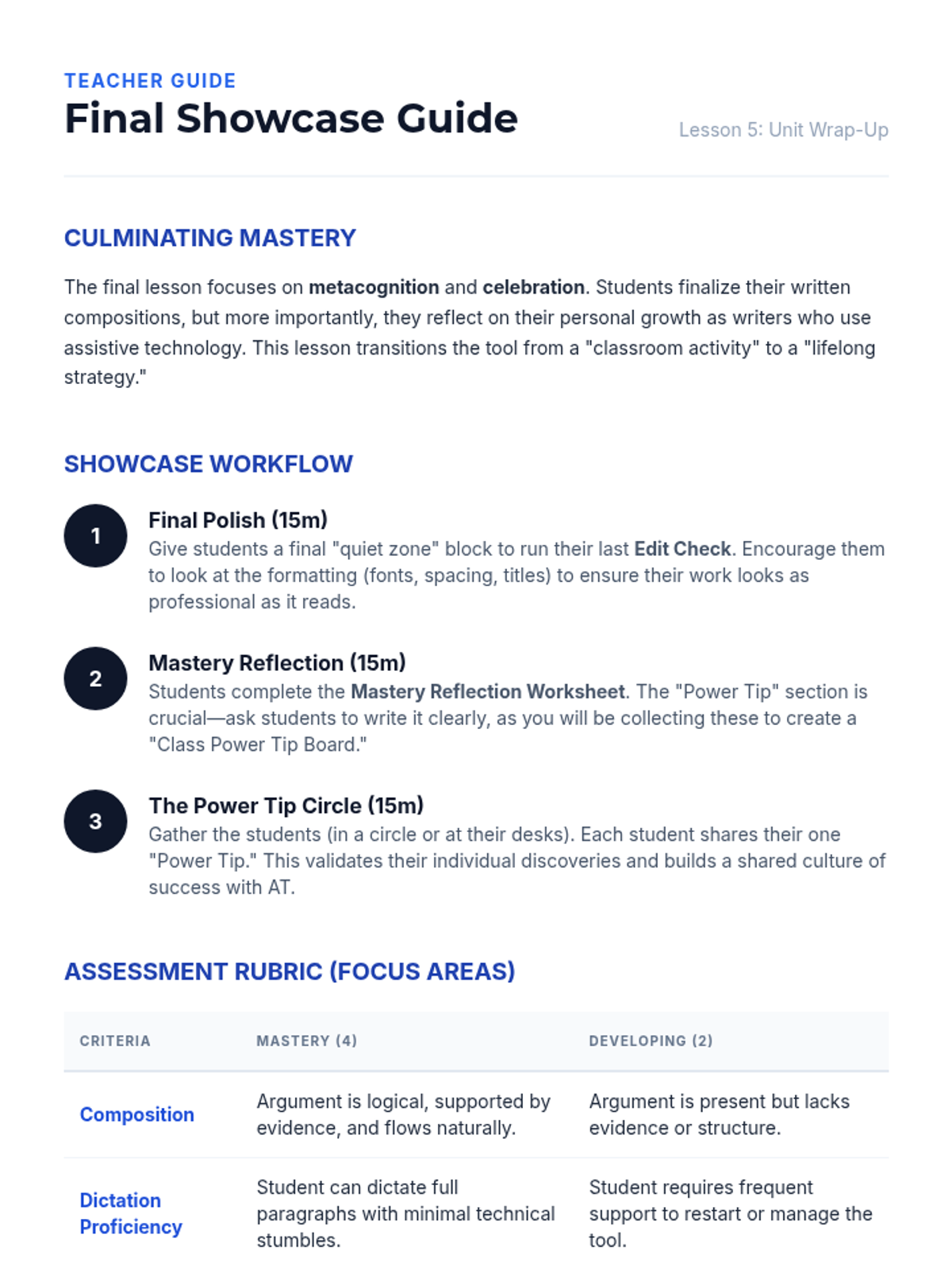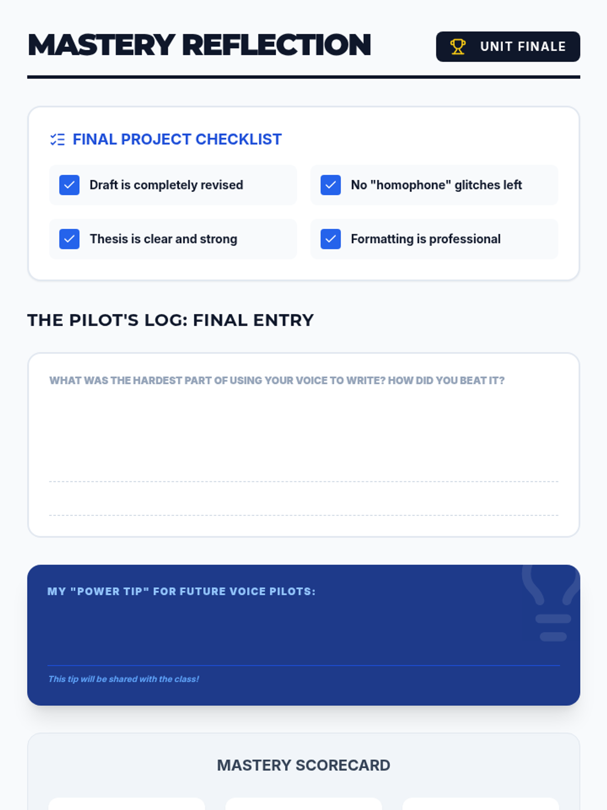 The culmination of the project where students finalize their work and share their personal 'power tips' for using speech recognition.