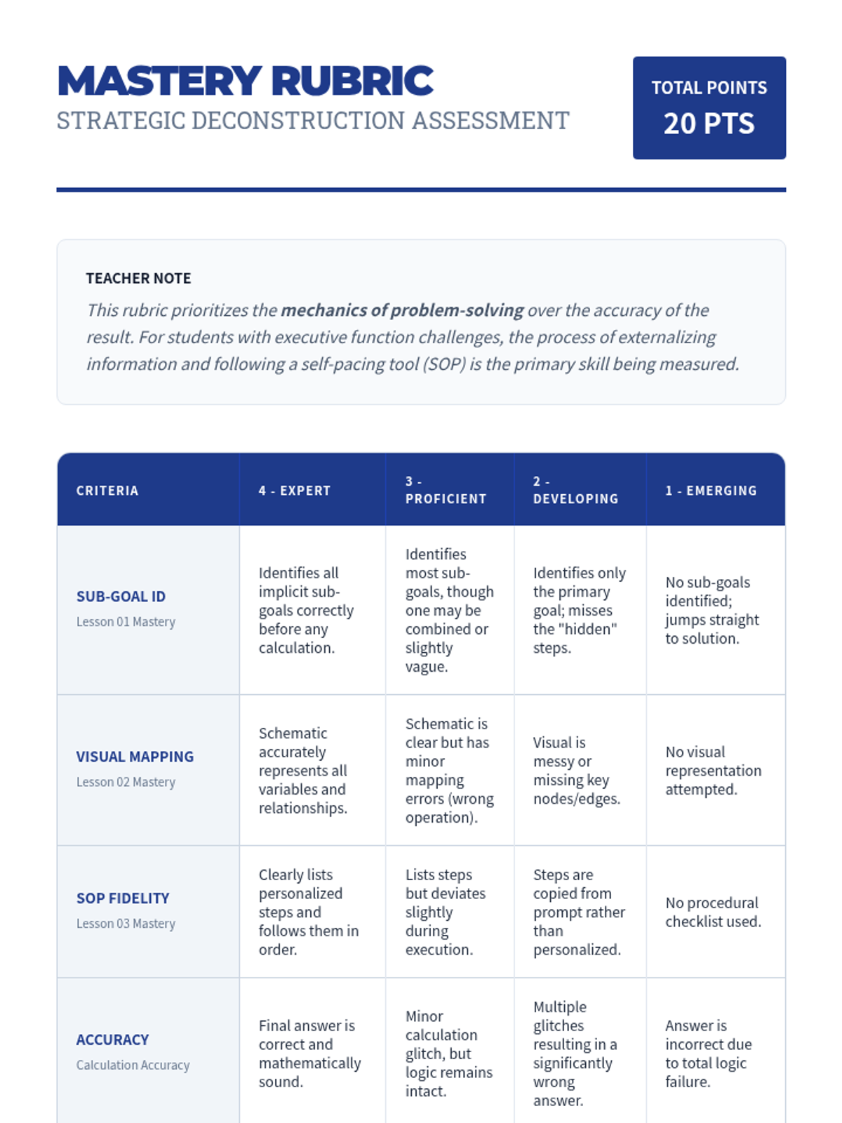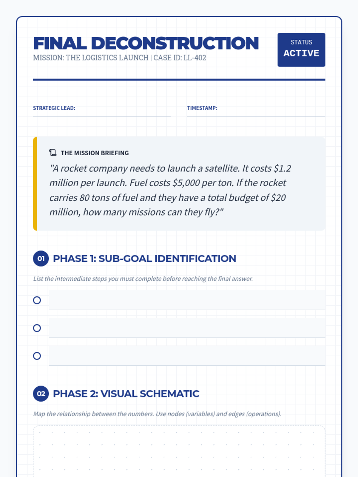 In this culminating workshop, students apply their full toolkit—sub-goal identification, visual mapping, and checklists—to a set of high-complexity, real-world math scenarios. Students must document their 'plan of attack' prior to calculating, demonstrating independent self-scaffolding.