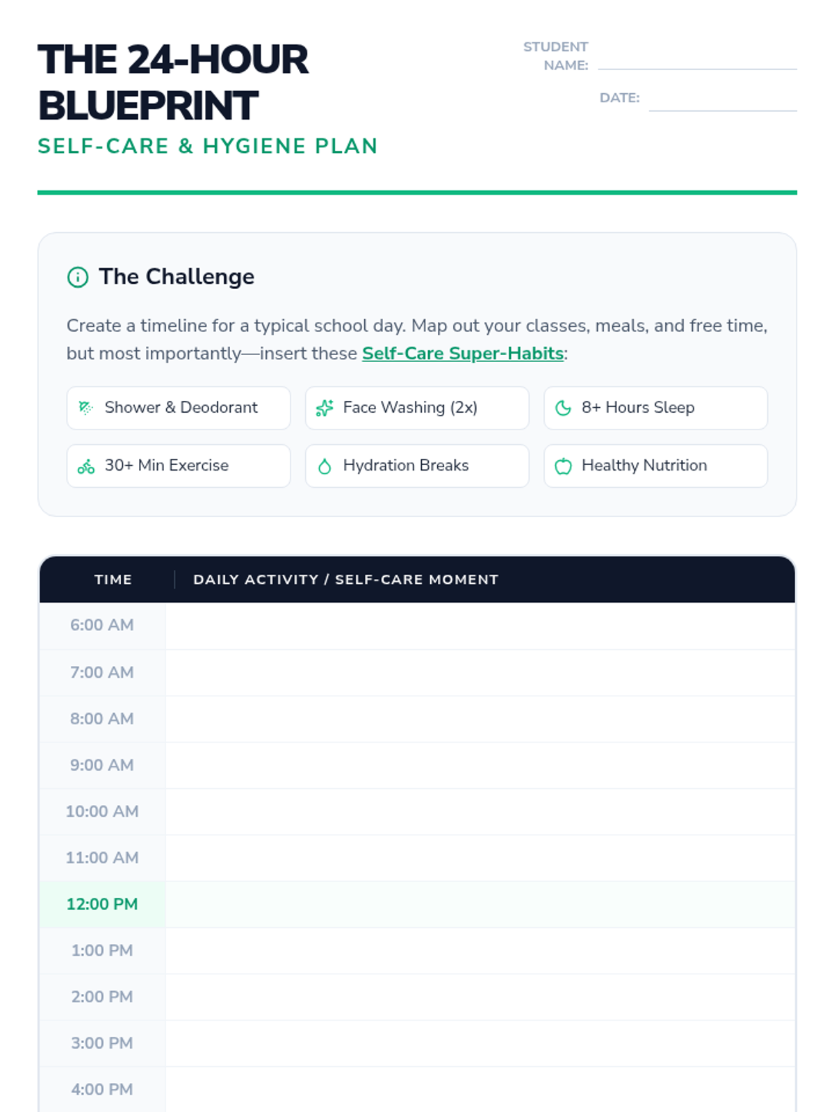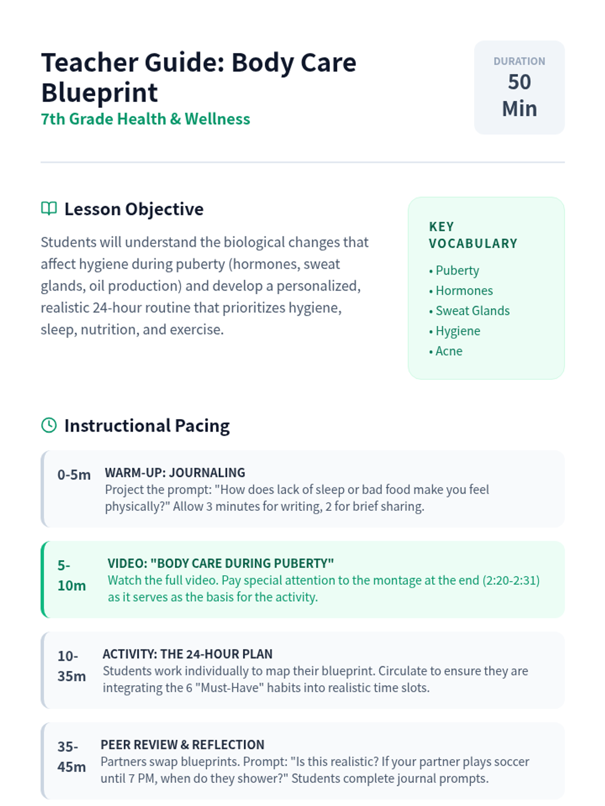 This lesson focuses on personal hygiene, sleep, and nutrition during puberty. Students watch an informative video and then design a realistic 24-hour self-care routine, incorporating essential habits like skin care, exercise, and adequate rest.