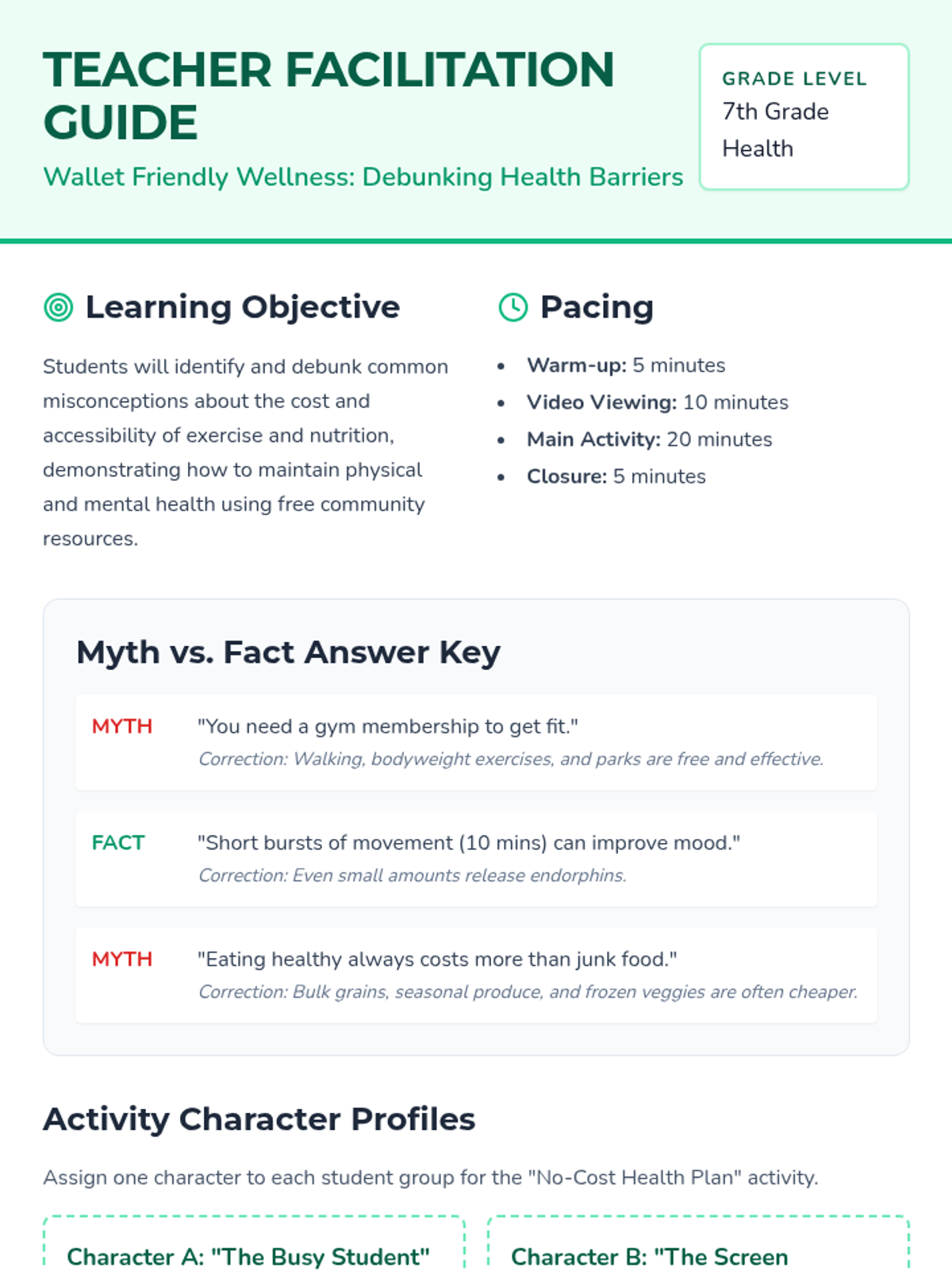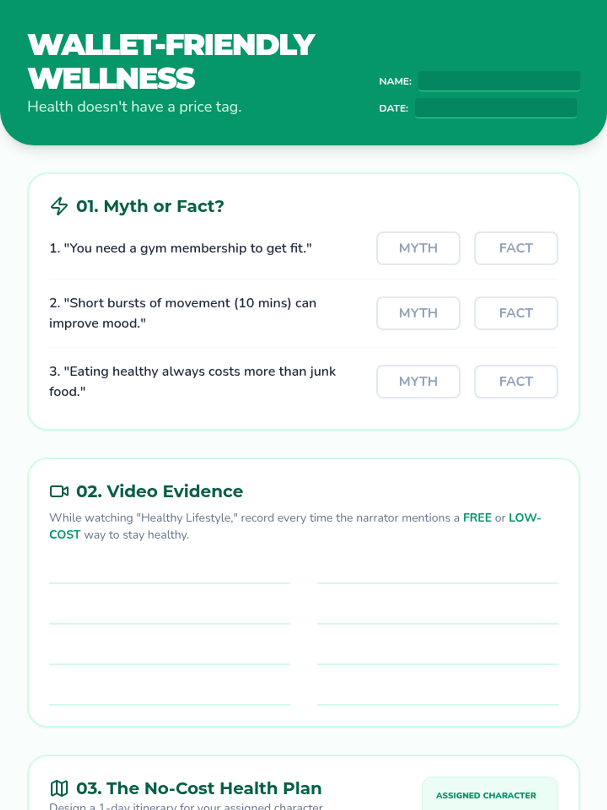 Students will debunk health myths related to cost and access while designing a 1-day itinerary using only free or low-cost resources. The lesson centers on a video about the body-mind connection and the accessibility of healthy habits.