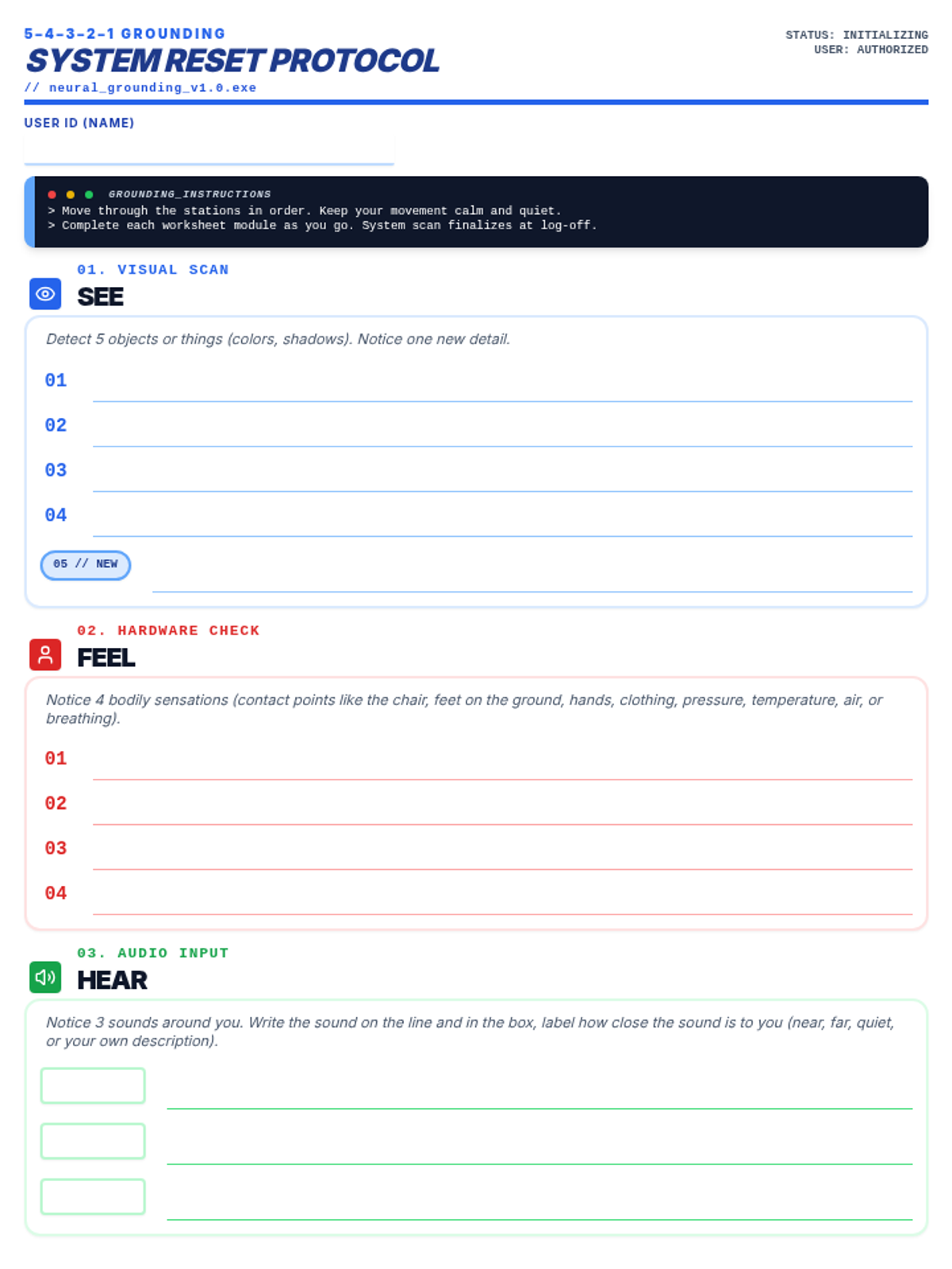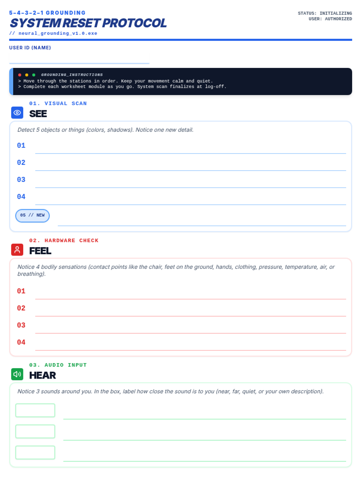 A lesson teaching students how to use the 5-4-3-2-1 grounding technique to manage stress and anxiety, framed through a technical 'system reset' metaphor. Students learn to recognize the 'spinning' state of anxiety and intercept it using sensory inputs.