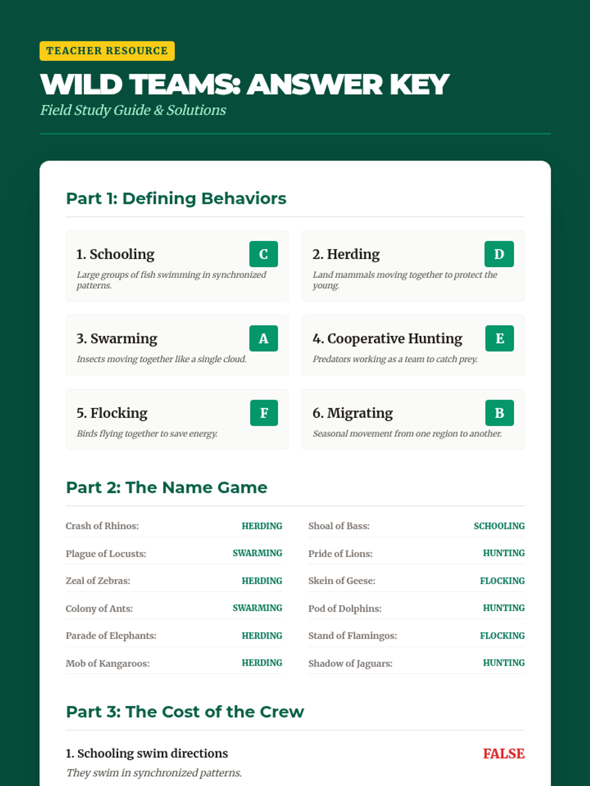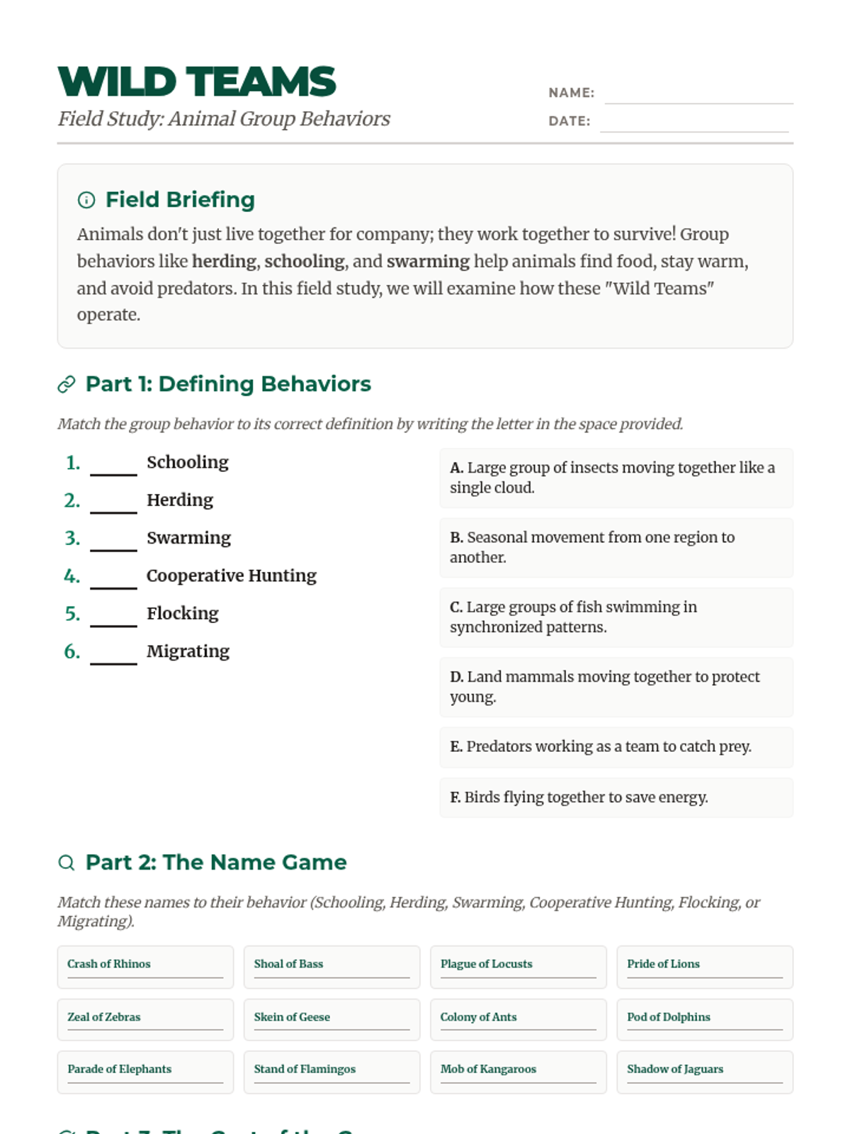 This lesson explores the various ways animals interact and survive in groups, focusing on specific behaviors like schooling, herding, and cooperative hunting, while introducing students to the creative collective nouns used to describe these groups.