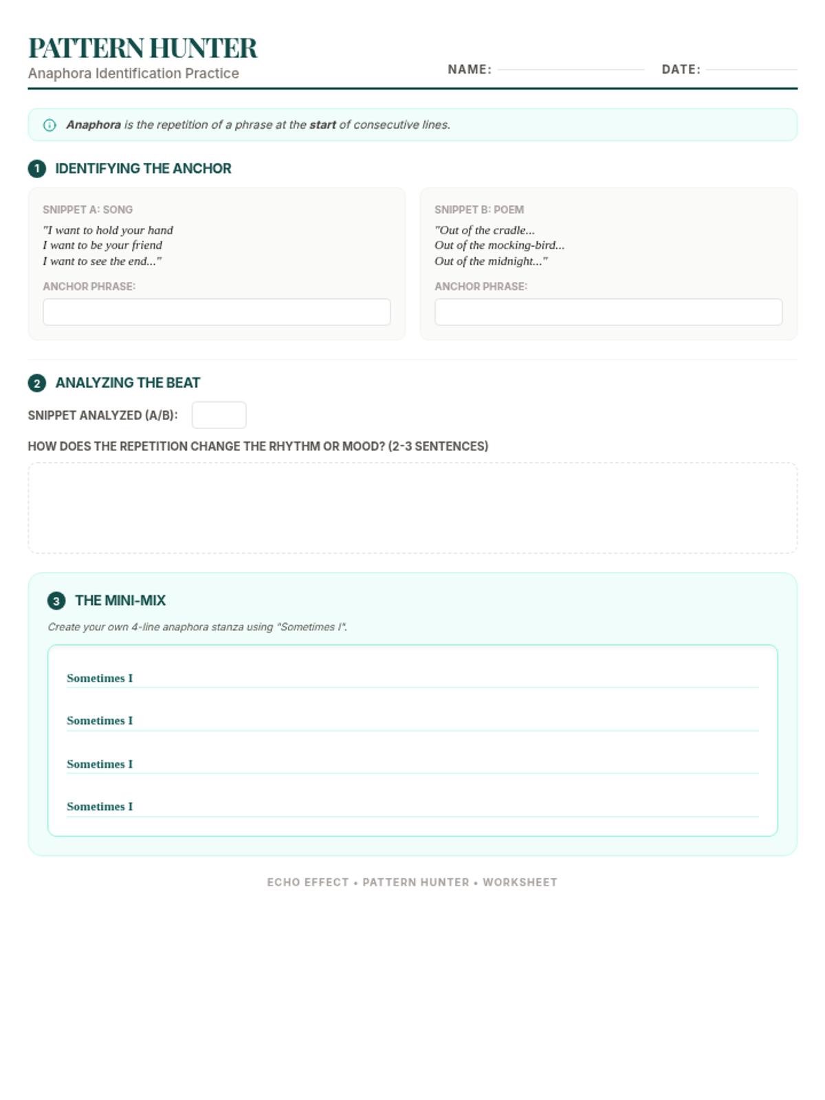 A creative workshop where students apply their knowledge to craft original anaphora poems, using structured prompts and a peer-review checklist.