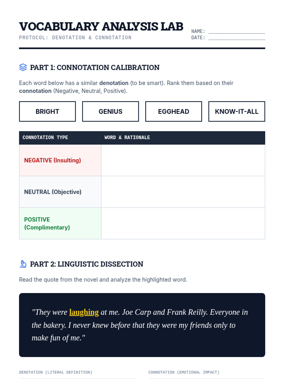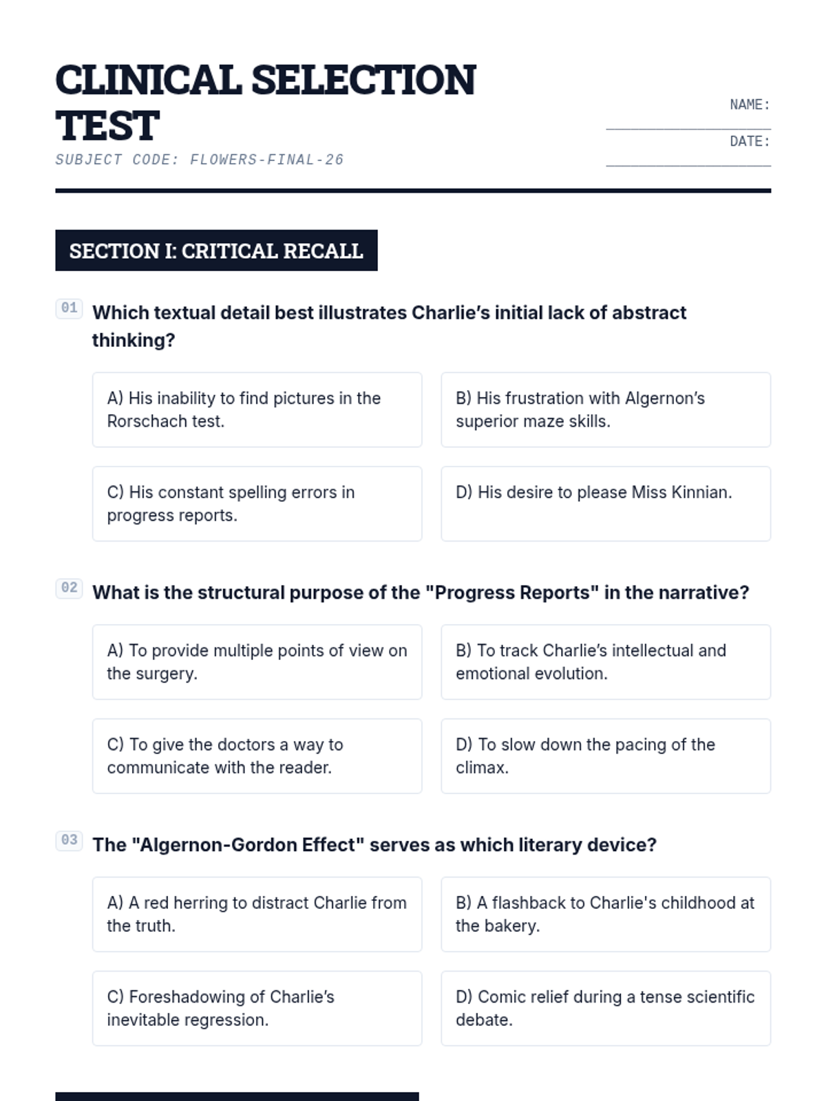 A comprehensive lesson focusing on the final reports of 'Flowers for Algernon' with a specific literary focus on Denotation vs. Connotation. Includes a visually immersive slide deck, a Word Splash Quiz Bee, and video-based analysis.