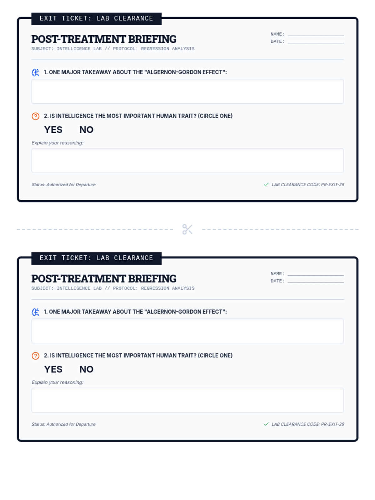 A session focused on summarizing the narrative arc of Charlie Gordon and debating the ethical implications of the surgery and his changing relationships.