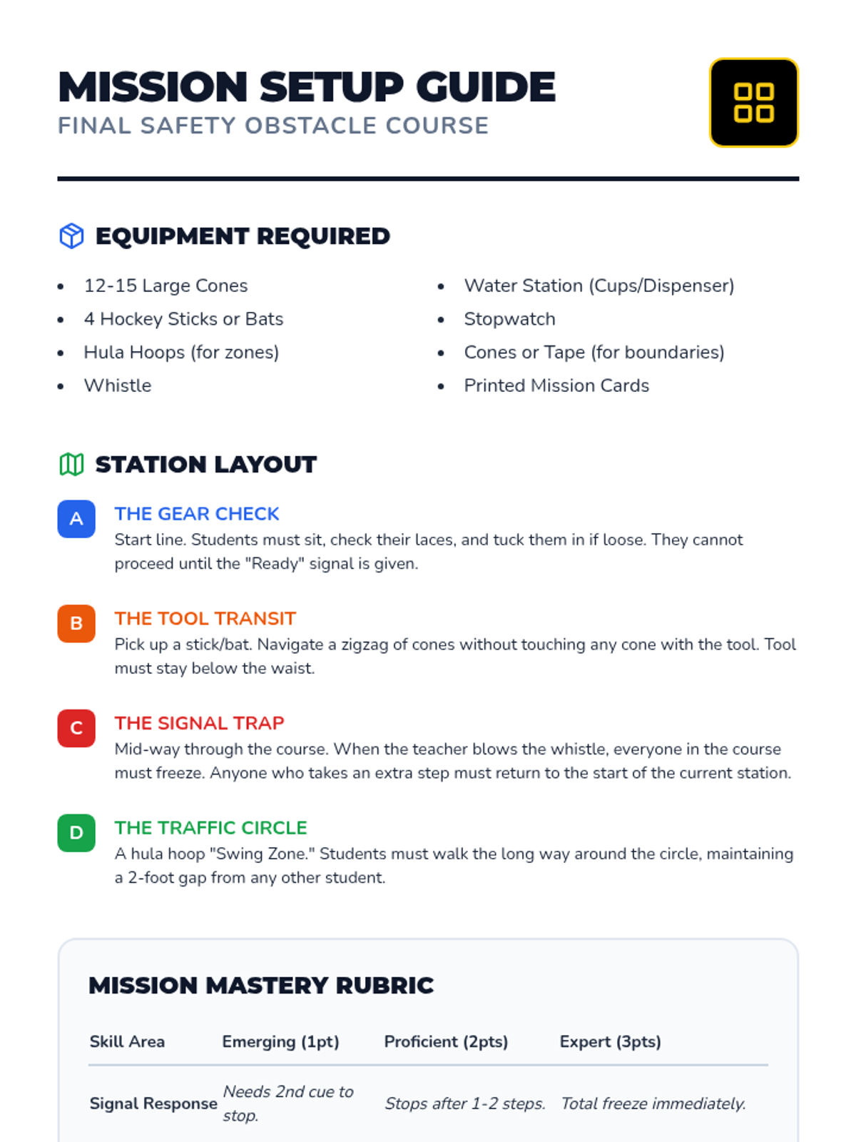 A cumulative simulation where students apply all learned safety protocols to complete a structured physical challenge.