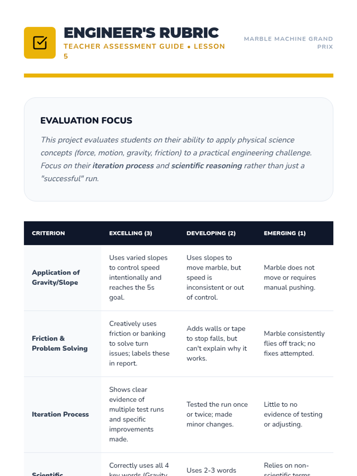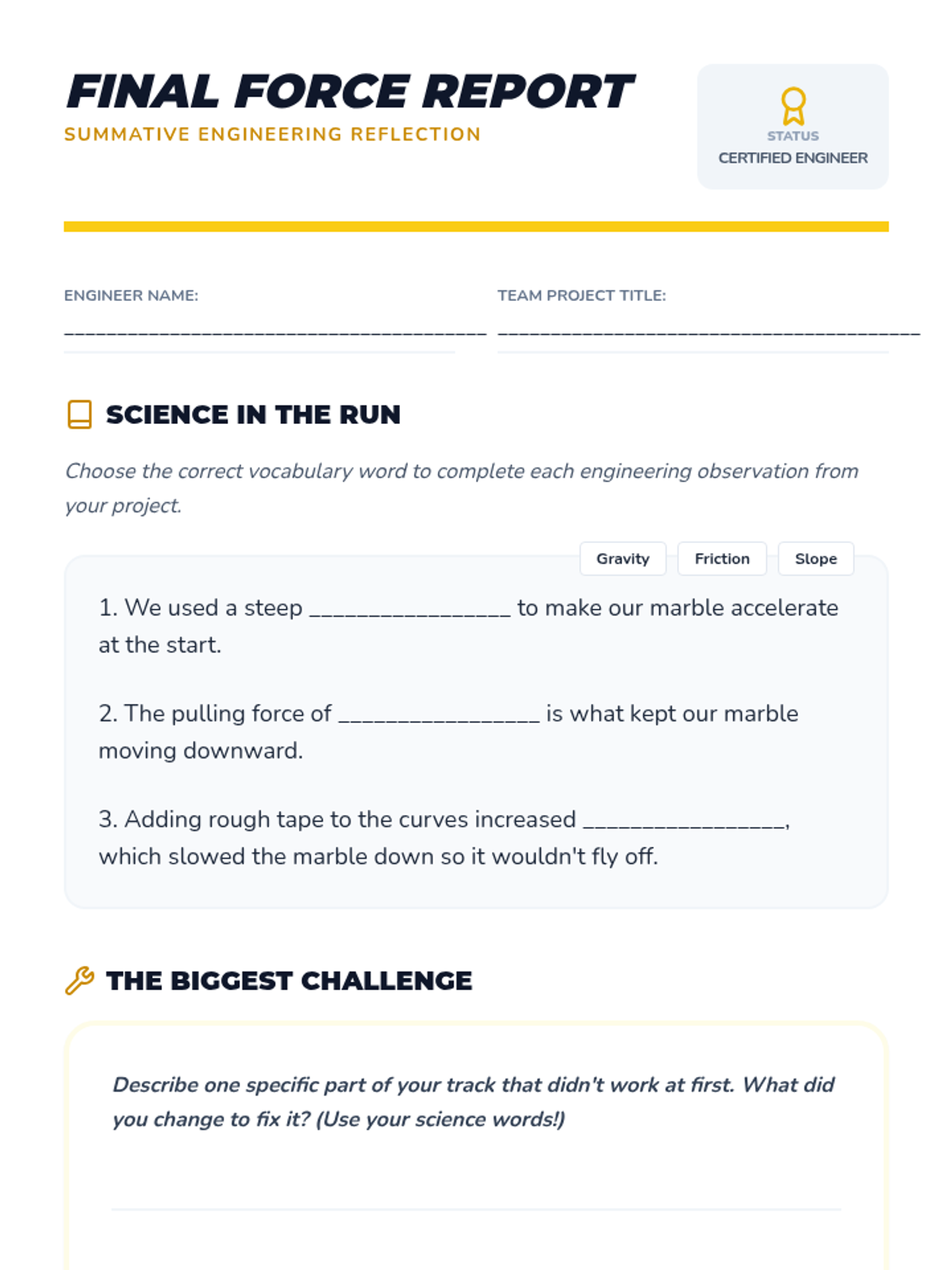 Students showcase their final runs and explain their design choices using scientific vocabulary related to force and motion.