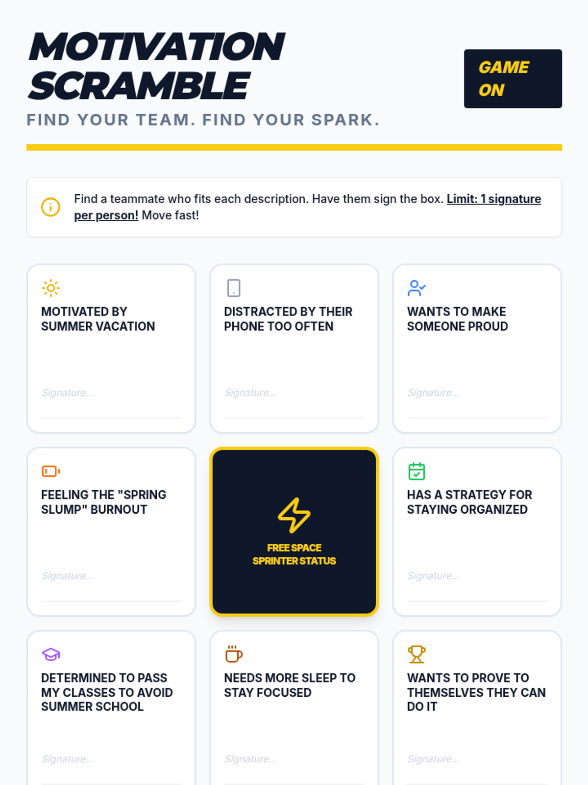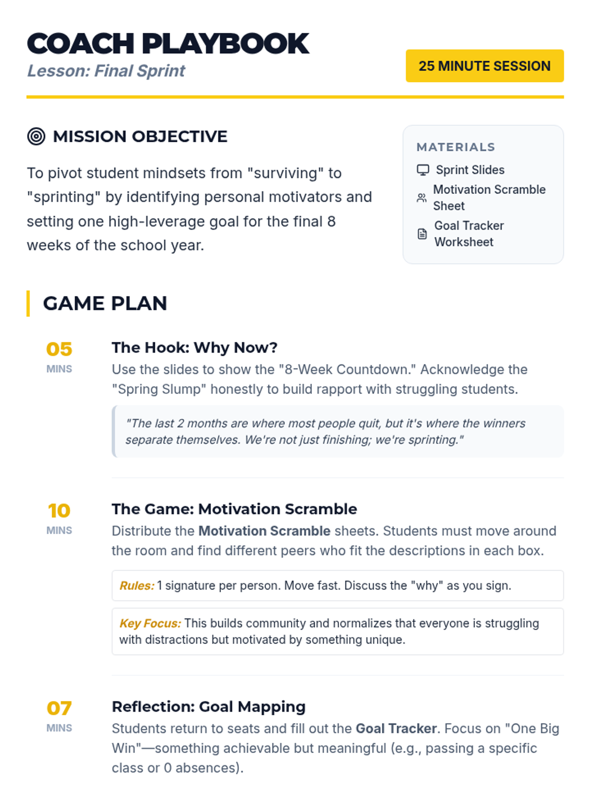 A high-energy, 25-minute session designed to re-engage 9th-grade students for the final stretch of the school year through movement-based reflection and concrete goal mapping.