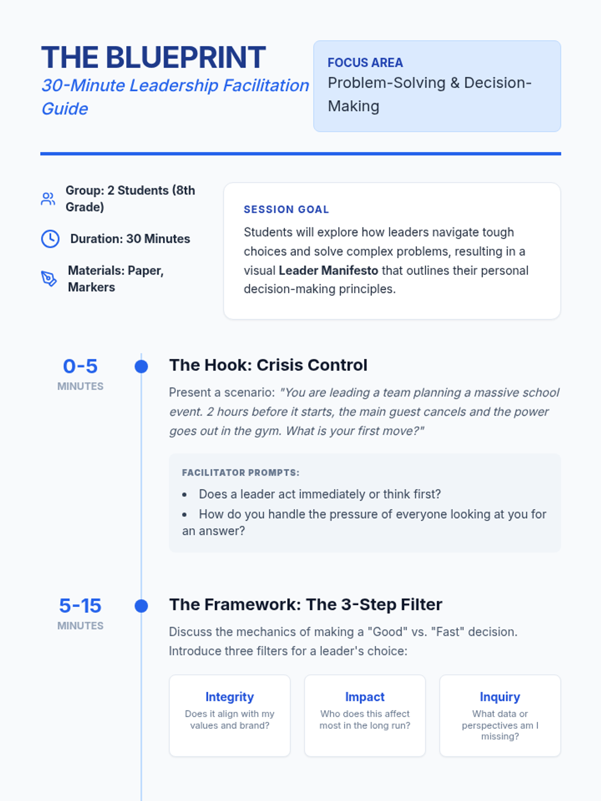 A high-impact 30-minute session focused on developing problem-solving and decision-making skills in young leaders, culminating in the creation of personal 'Leader Manifestos'.