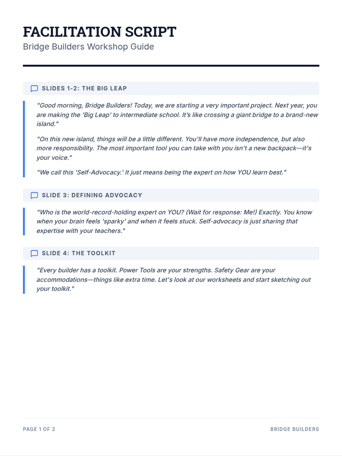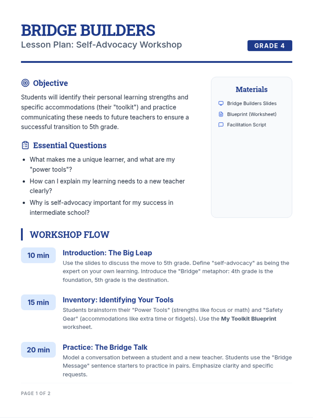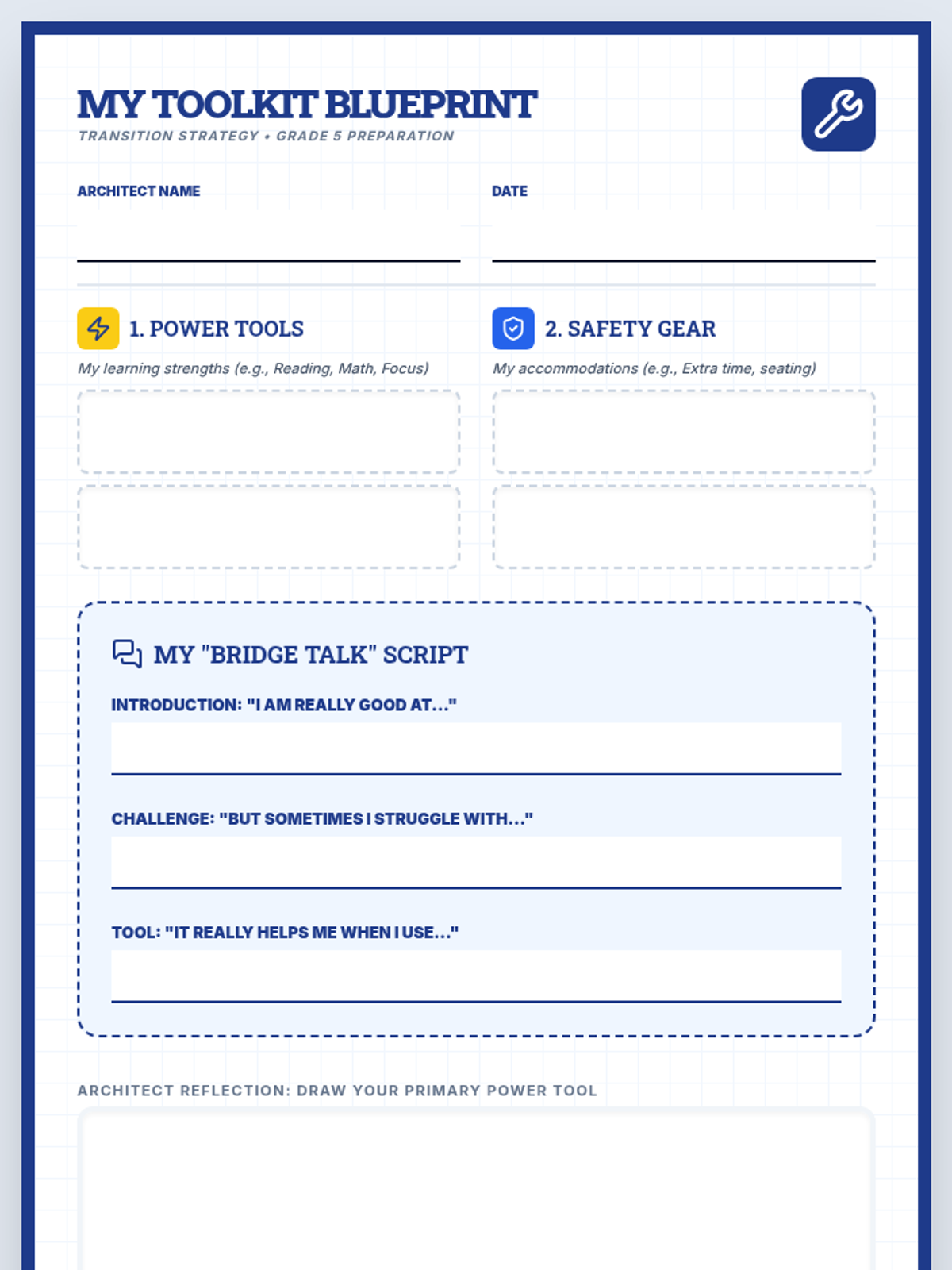 A comprehensive workshop designed for 4th-grade students to build self-advocacy skills as they transition to intermediate school. Students identify their personal strengths and necessary learning accommodations, then practice communicating these needs to future teachers using a toolkit metaphor.