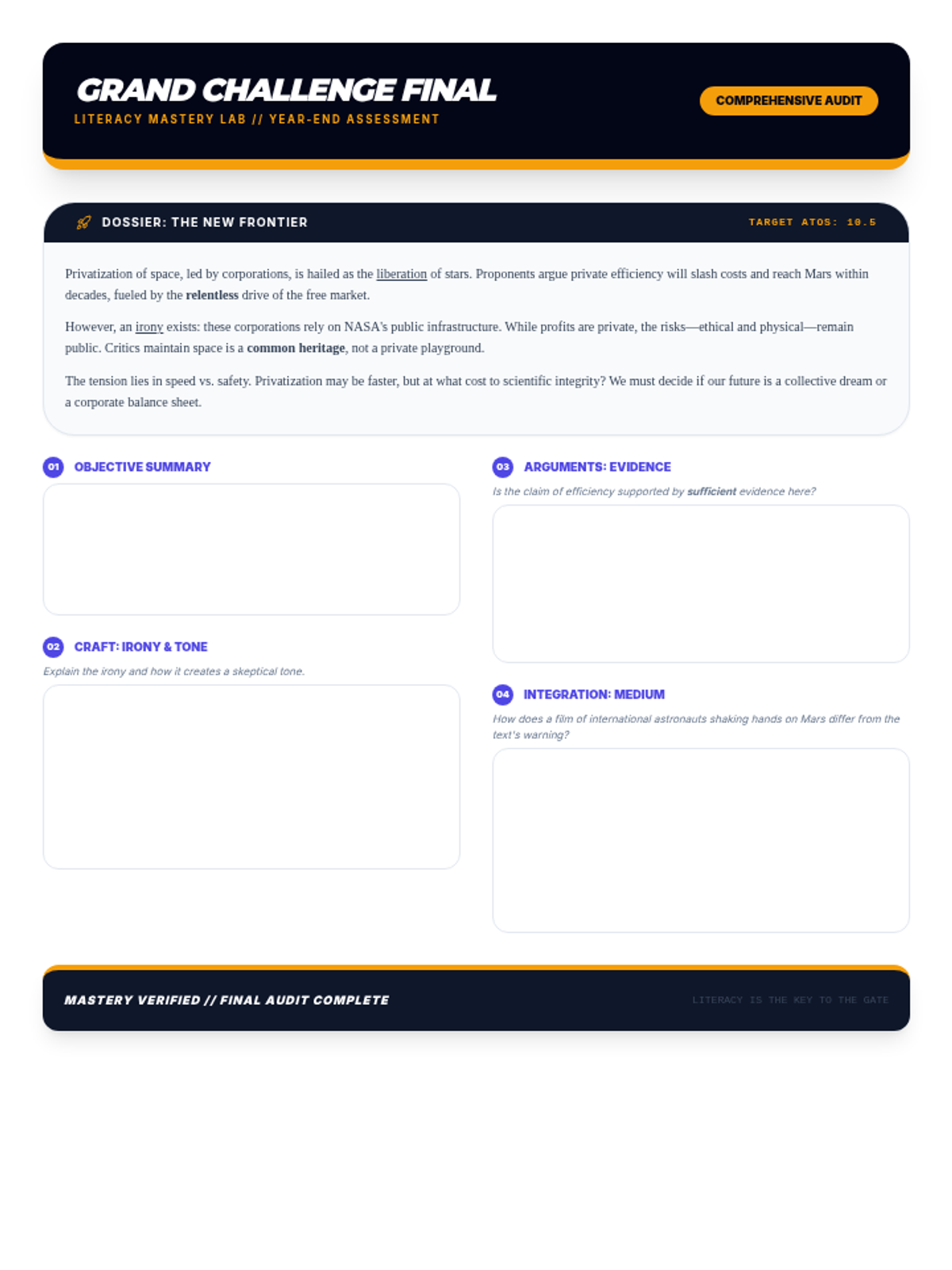 Synthesizes all skills through complex grade-level texts to prepare for end-of-year assessments.