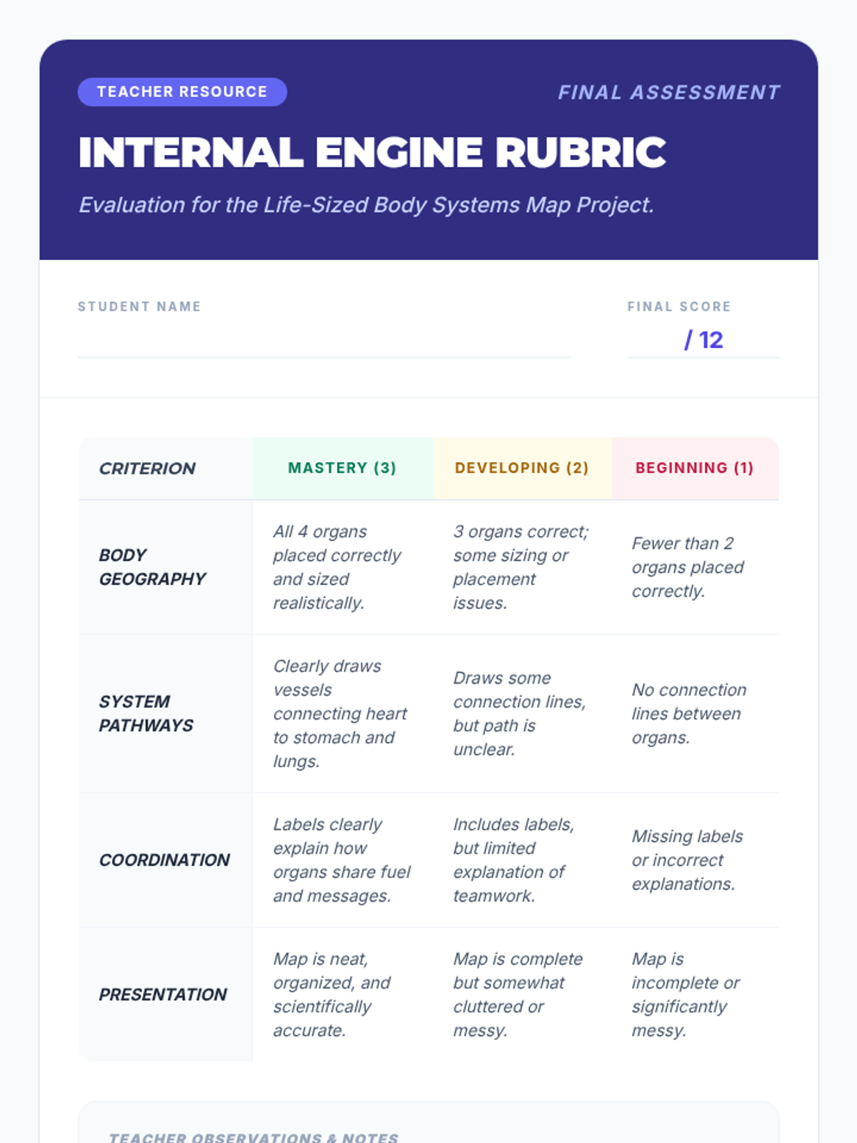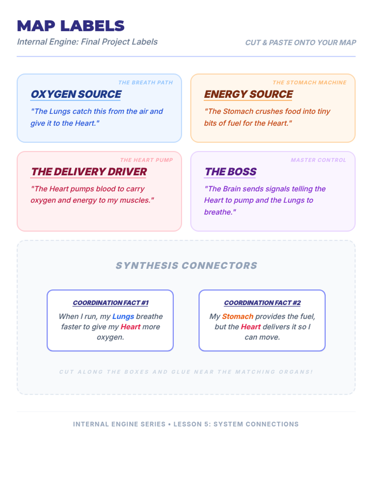 Students synthesize their learning by connecting the organs on their body maps, illustrating how the systems work together to keep the body alive.