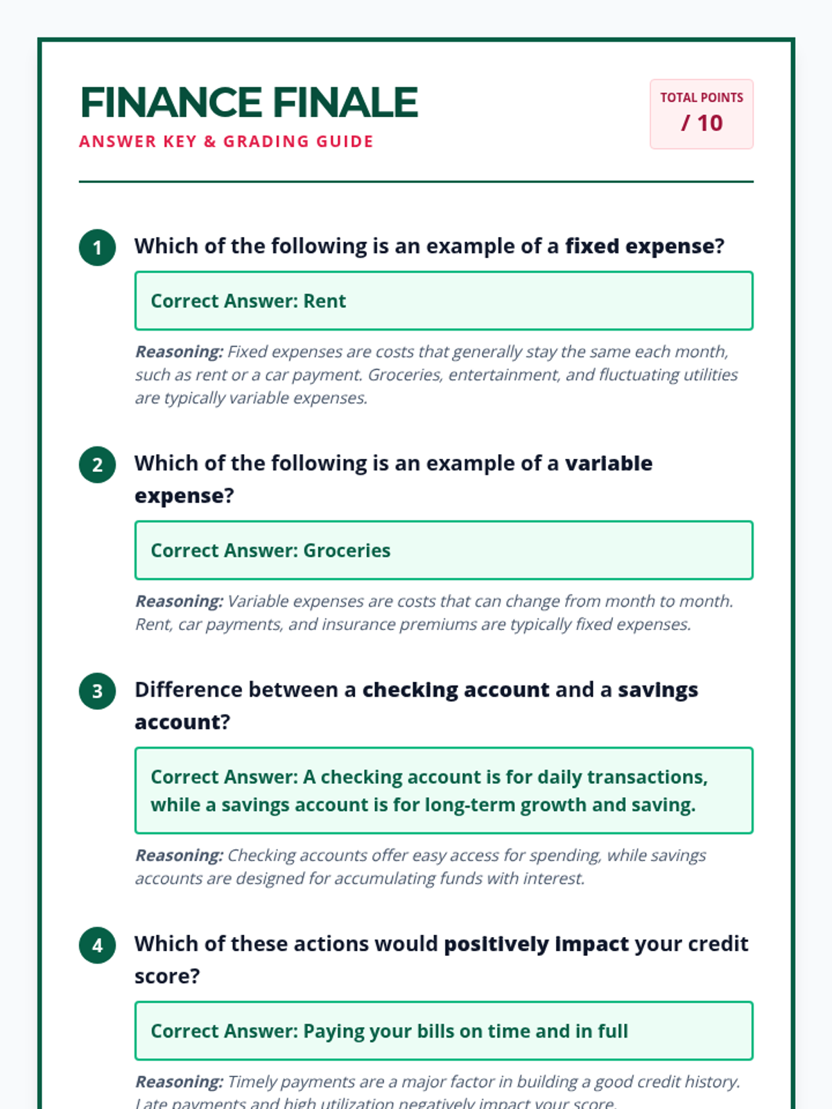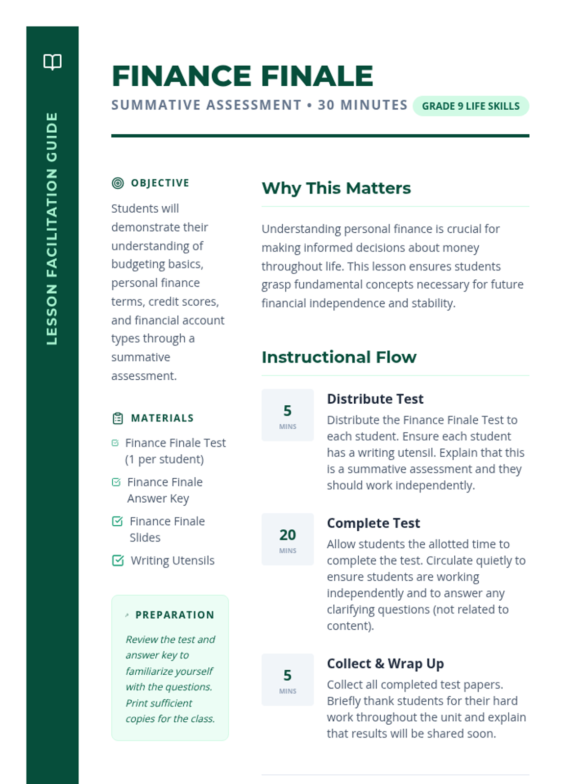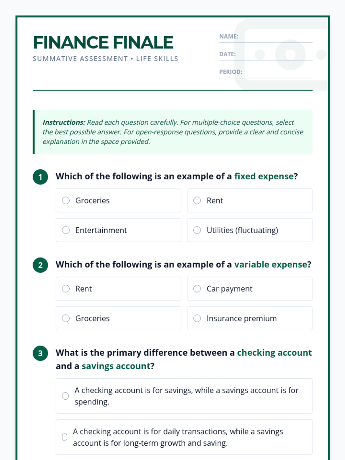 A 30-minute summative assessment for 9th-grade Life Skills students covering budgeting, financial terms, credit, and types of accounts.