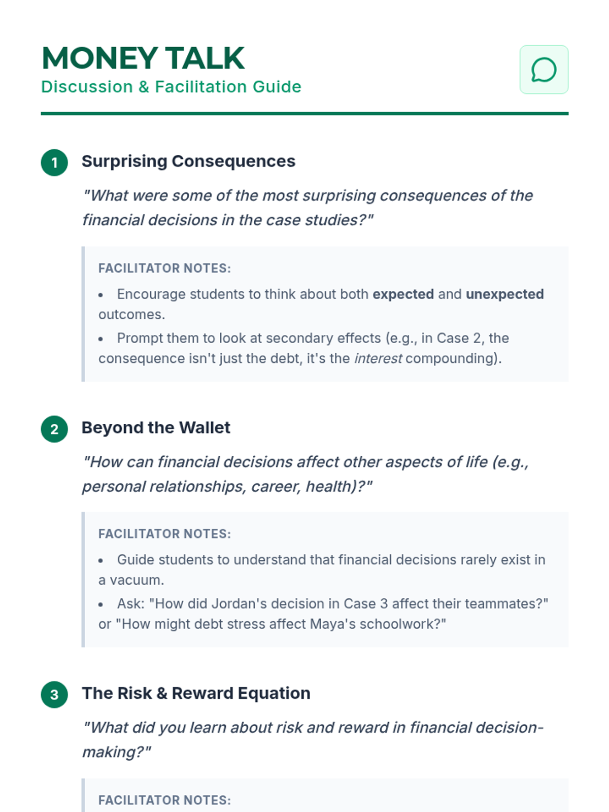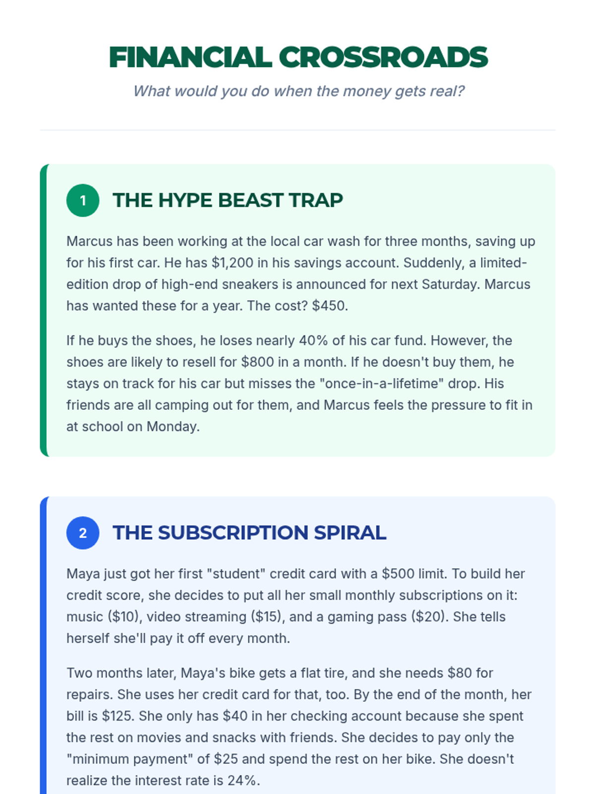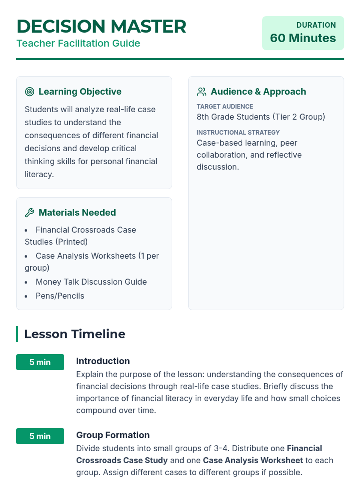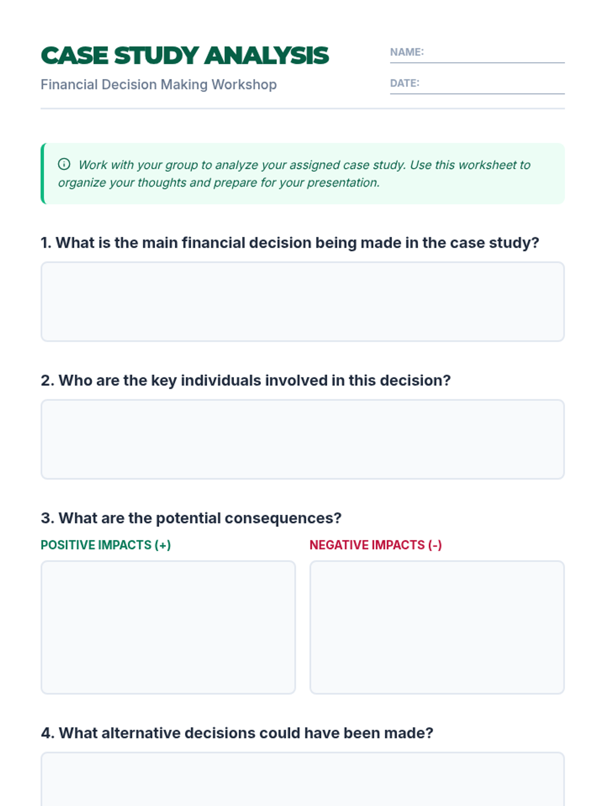 Students analyze real-life case studies to understand the consequences of financial decisions, developing critical thinking and literacy skills through group discussion and presentation.