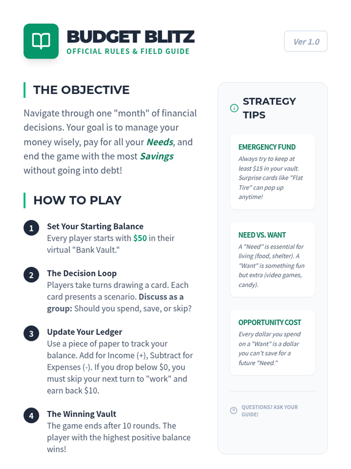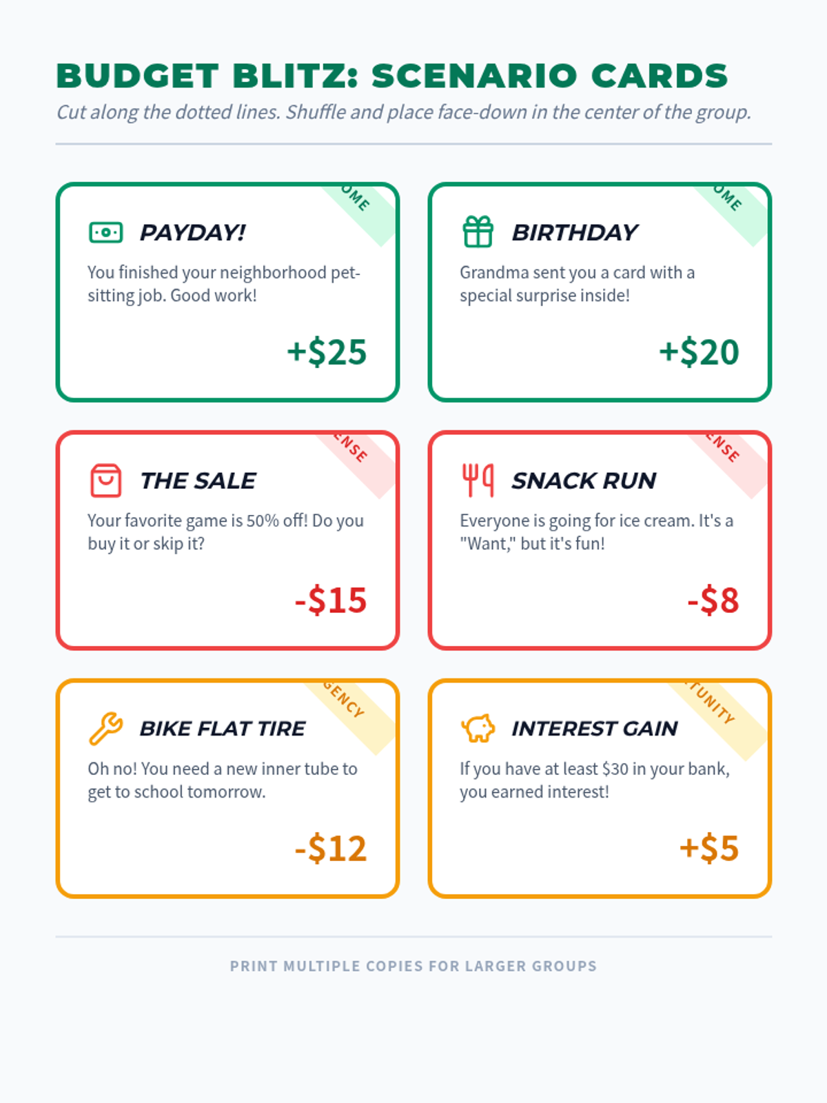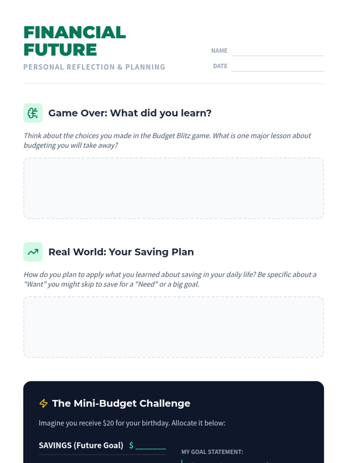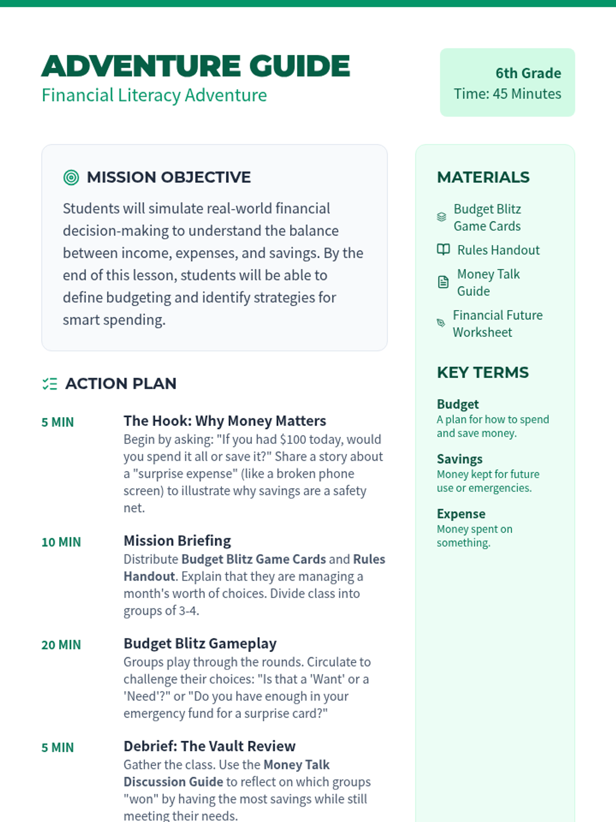 An interactive 6th-grade lesson that teaches budgeting, saving, and smart spending through a hands-on simulation game called Budget Blitz.