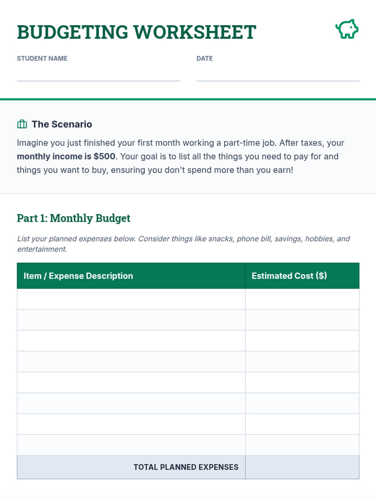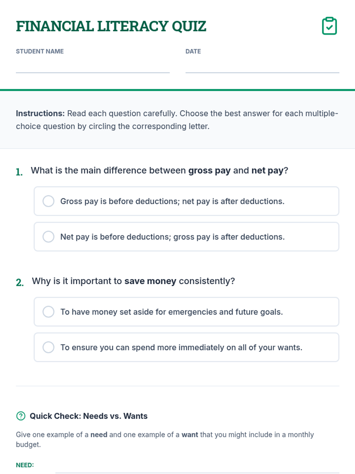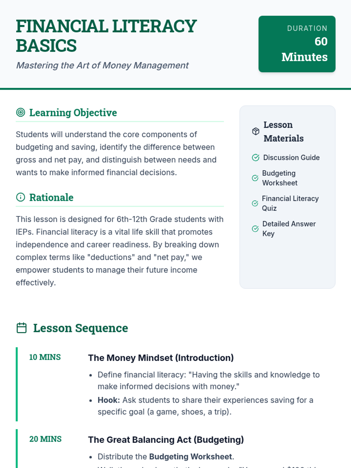 This lesson introduces students to essential financial literacy concepts, focusing on budgeting, saving, and understanding paychecks. These skills are crucial for career readiness and personal financial management.