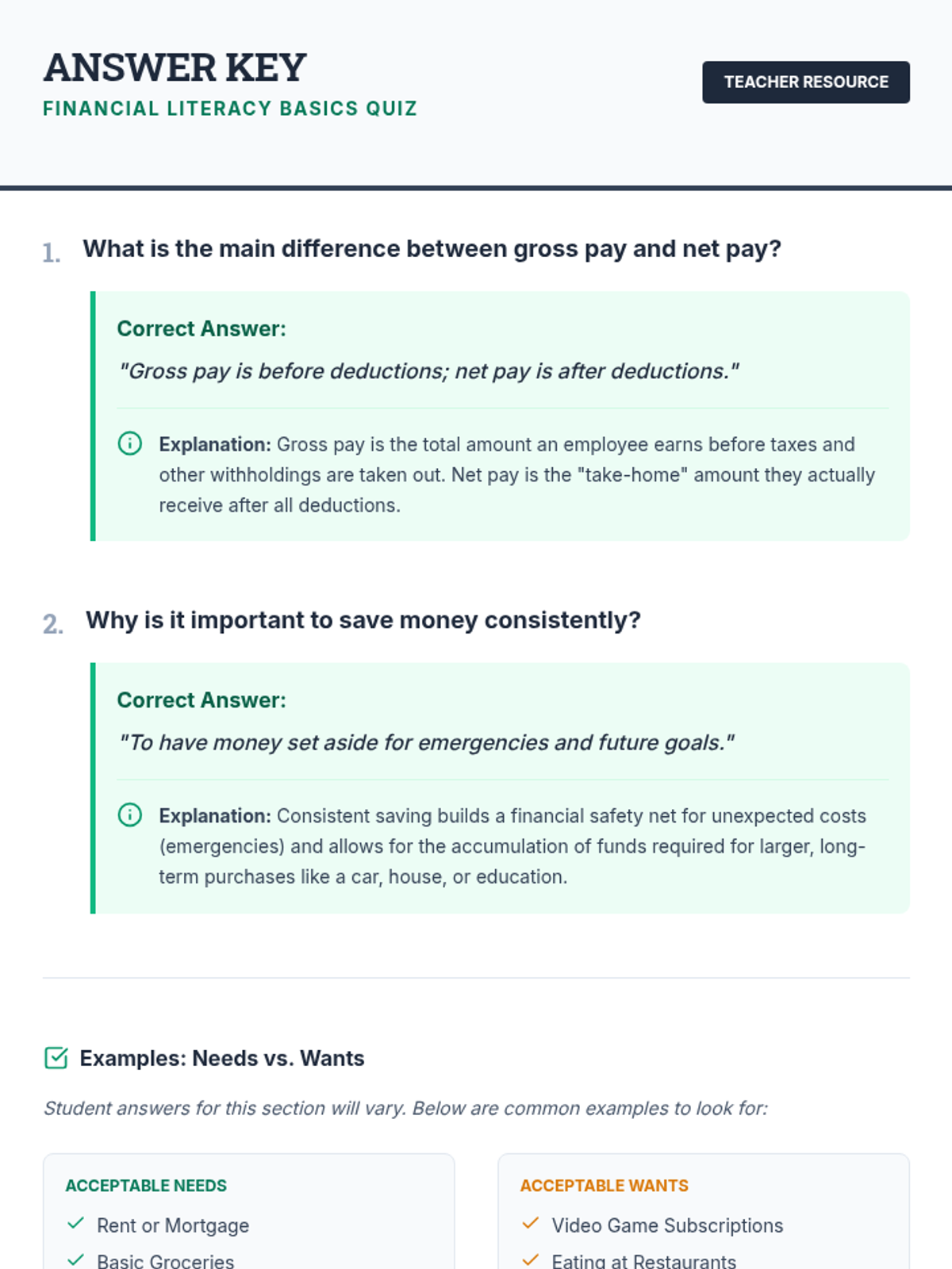 A comprehensive guide to understanding paychecks, including gross vs. net pay, tax deductions, and the anatomy of a pay stub. Students will learn how to read their earnings statements and manage their direct deposit information.