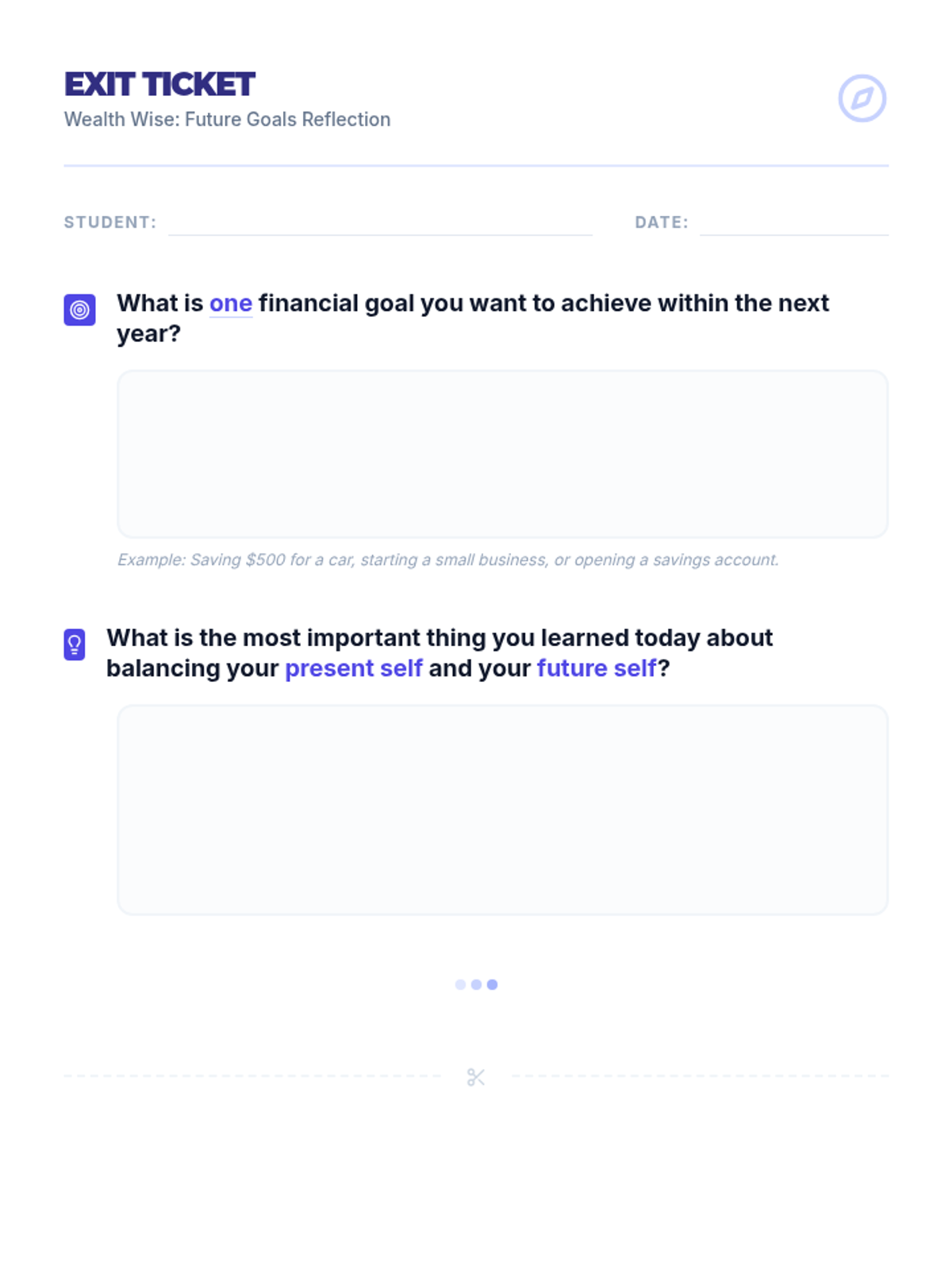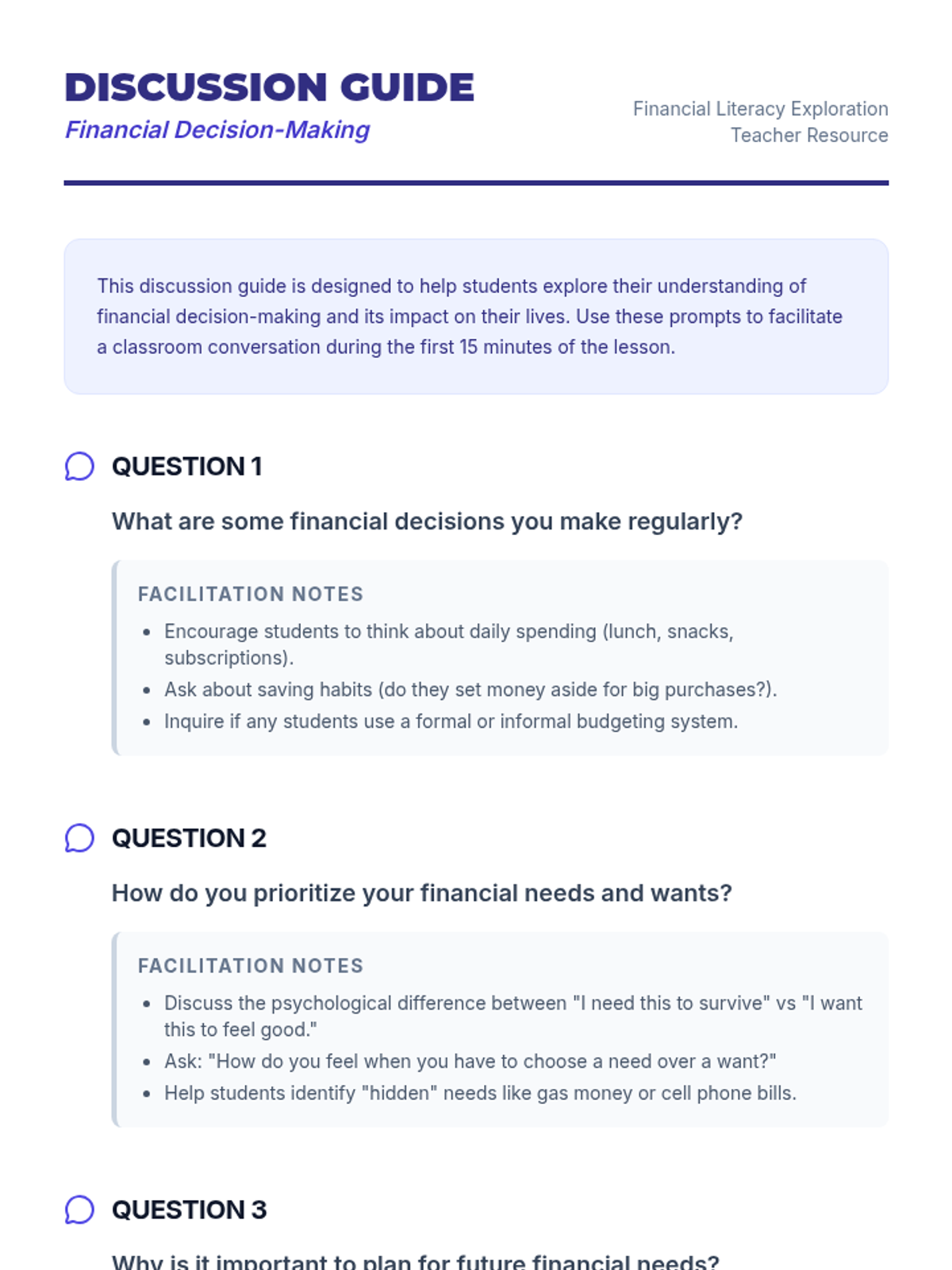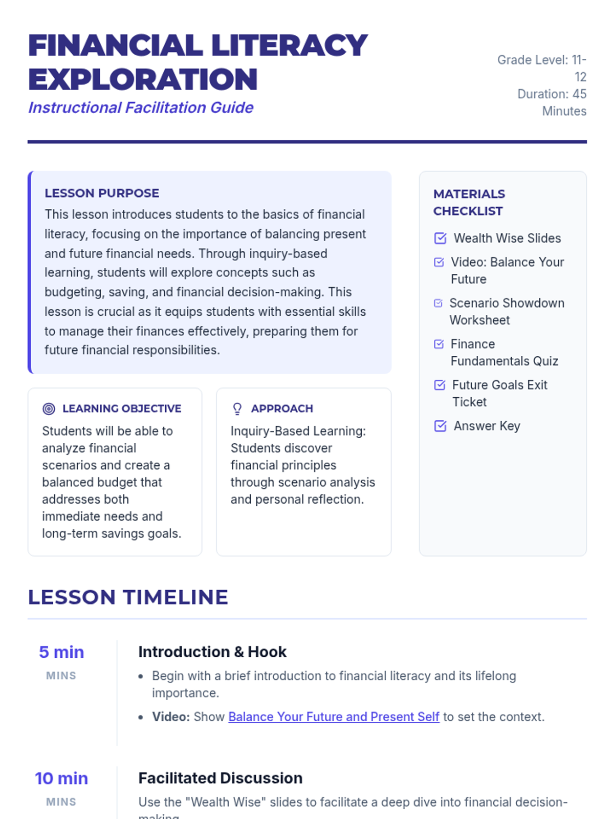 This lesson introduces high school students to financial literacy, focusing on the balance between present needs and future goals through budgeting, saving, and decision-making scenarios.