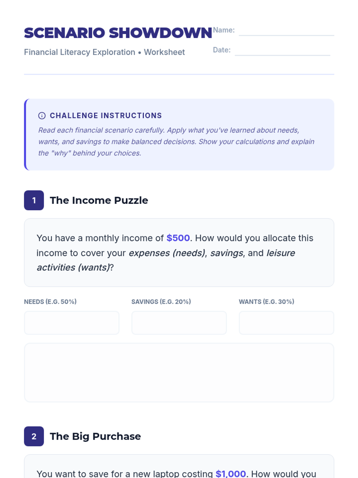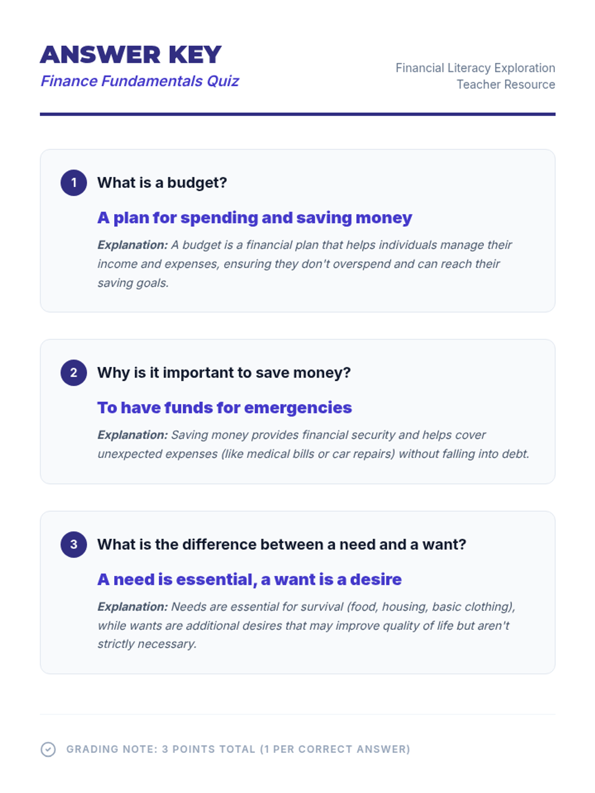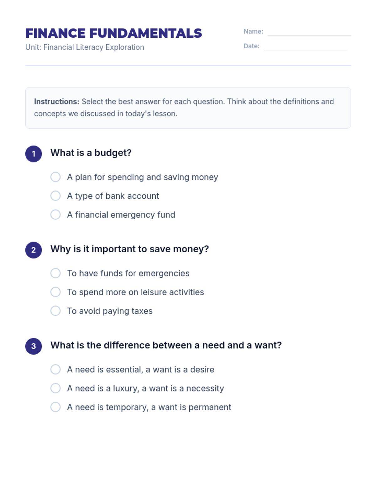 This lesson introduces high school students to financial literacy, focusing on the balance between present needs and future goals through budgeting, saving, and decision-making scenarios.