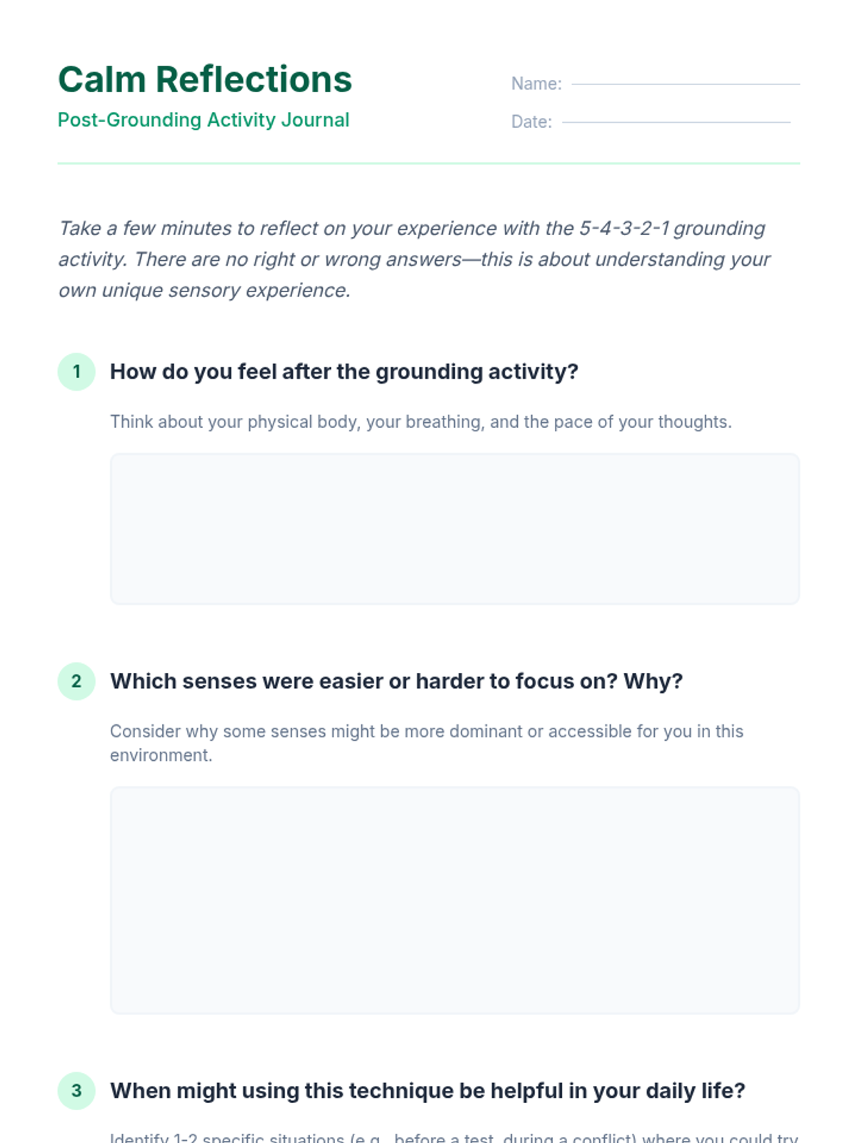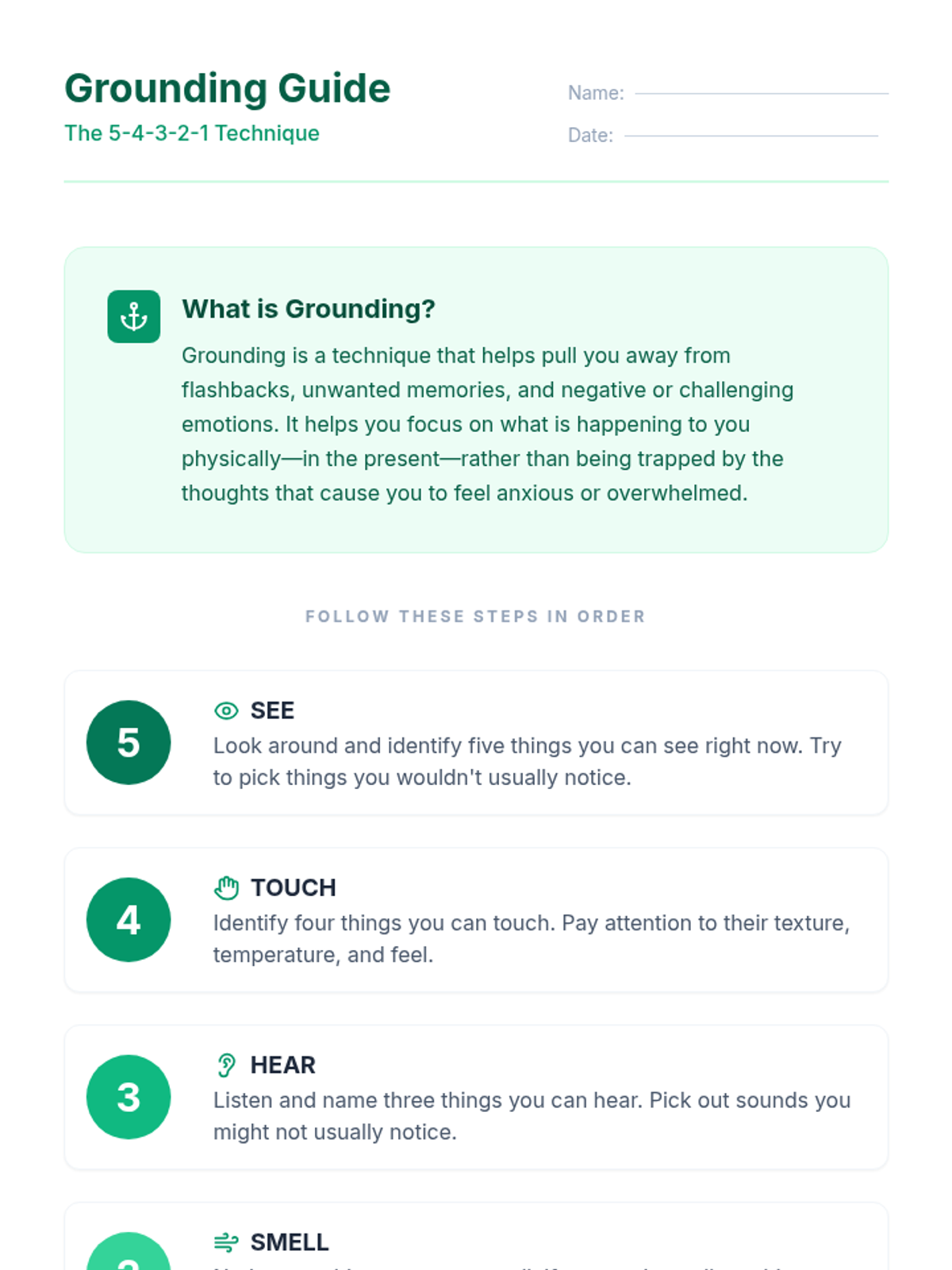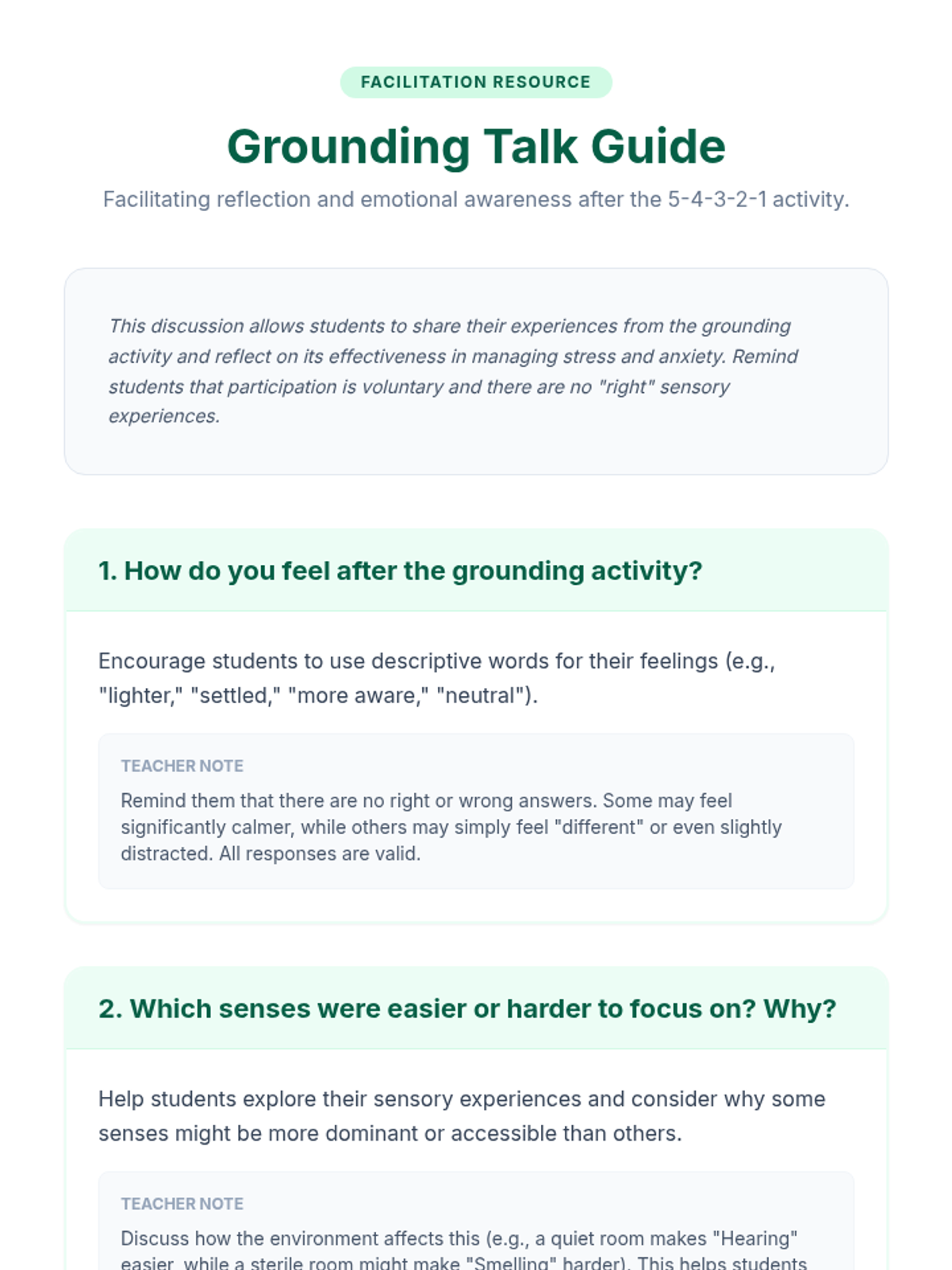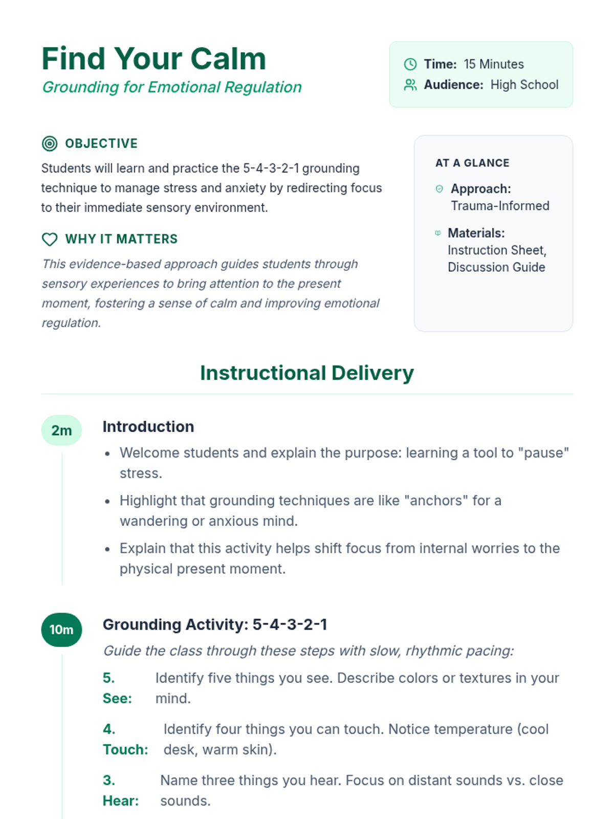 A 15-minute Tier 1 classroom lesson teaching high school students the evidence-based 5-4-3-2-1 grounding technique to manage stress and anxiety through sensory awareness.