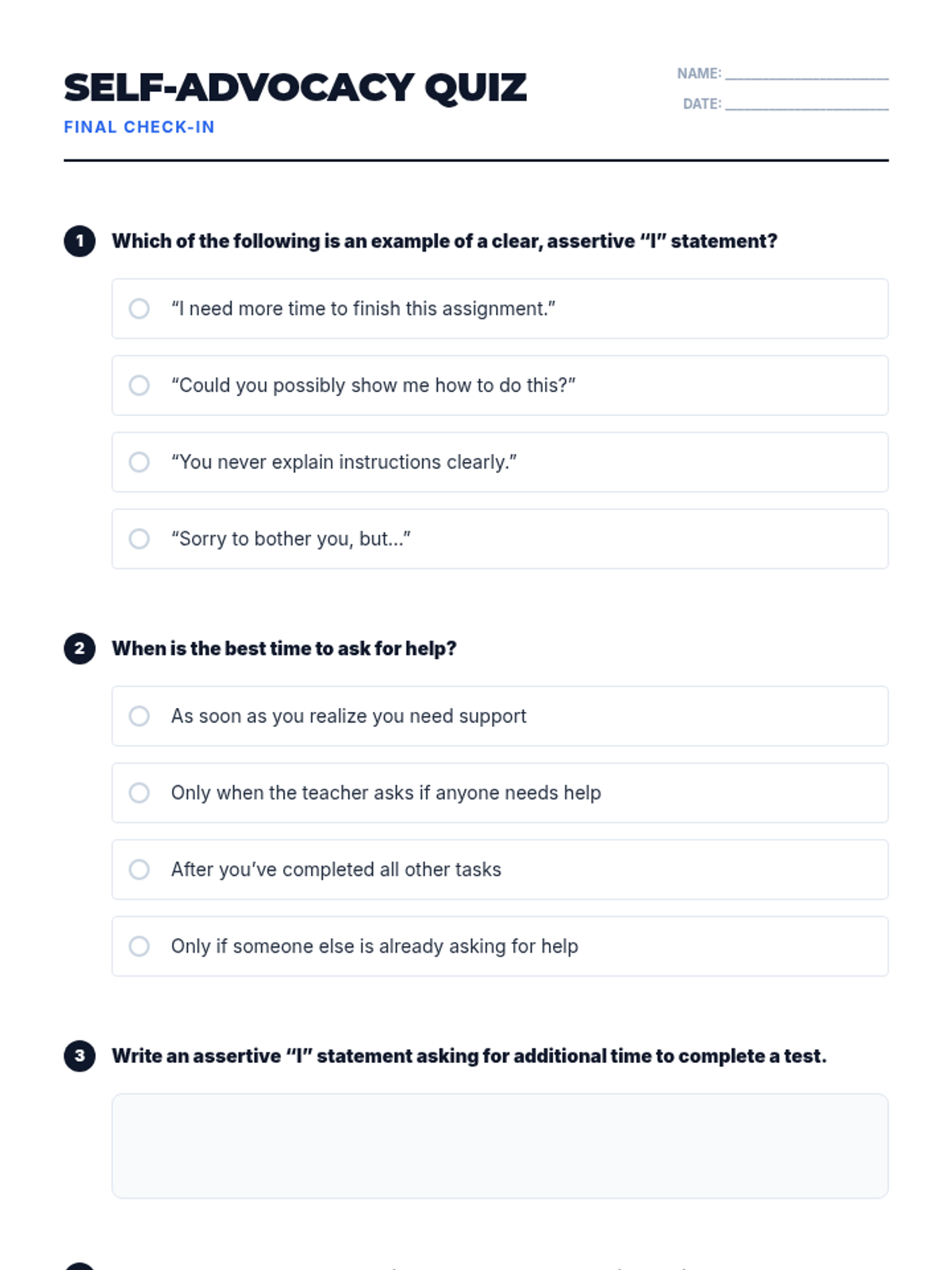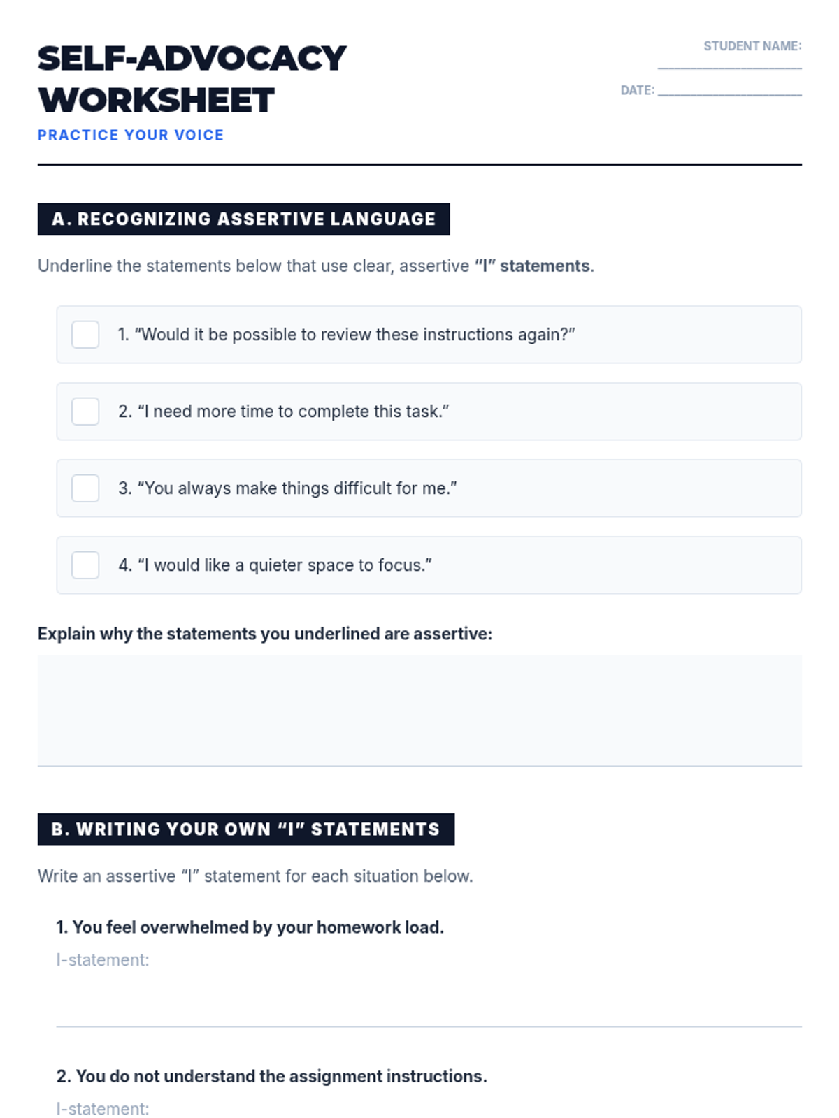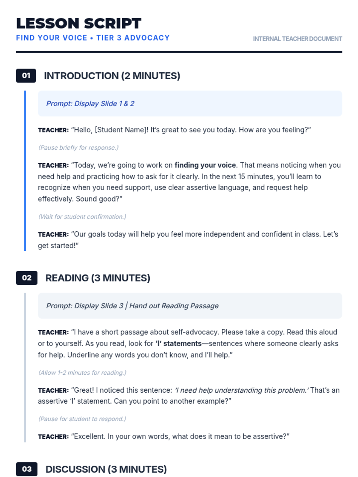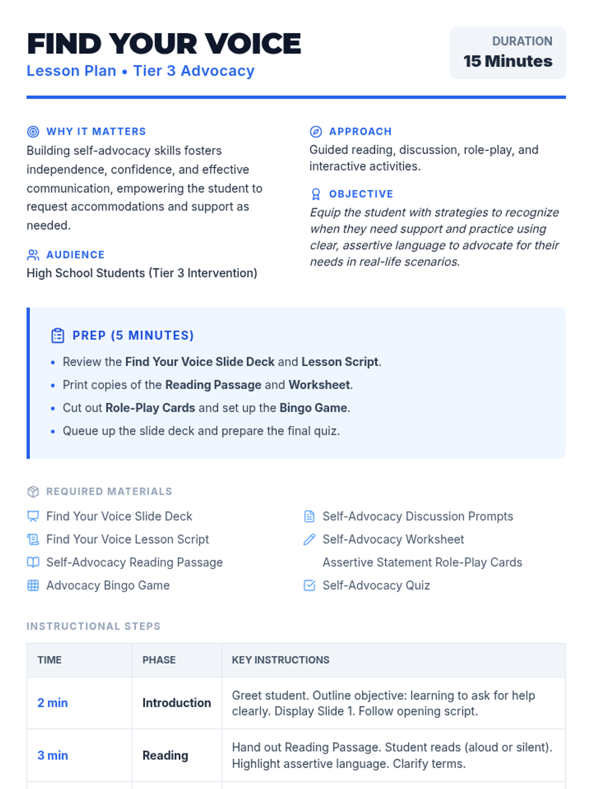 A concise 15-minute Tier 3 session designed for a 17-year-old male student with autism to build self-advocacy skills. This lesson equips the student with strategies to express needs and request support effectively, fostering independence and confidence.