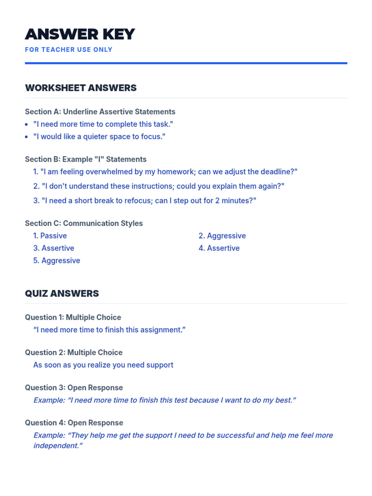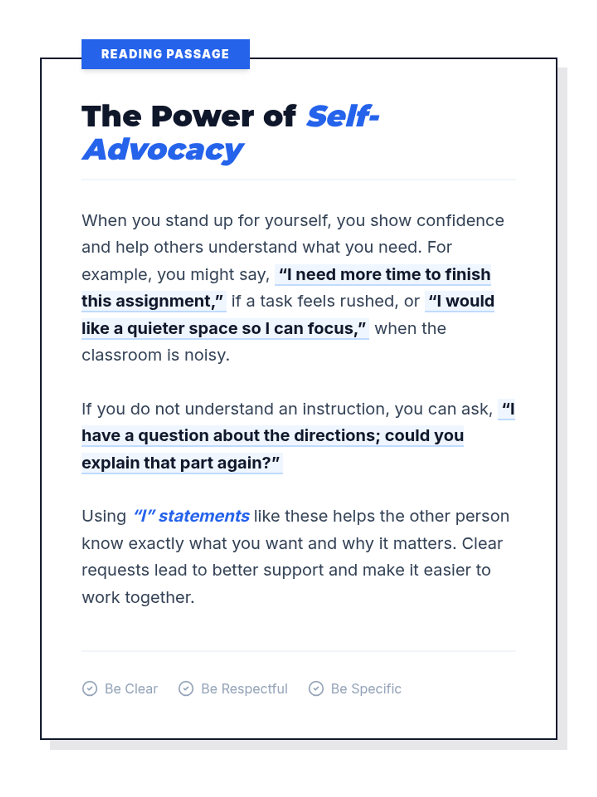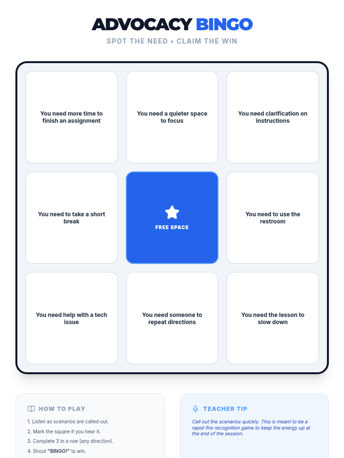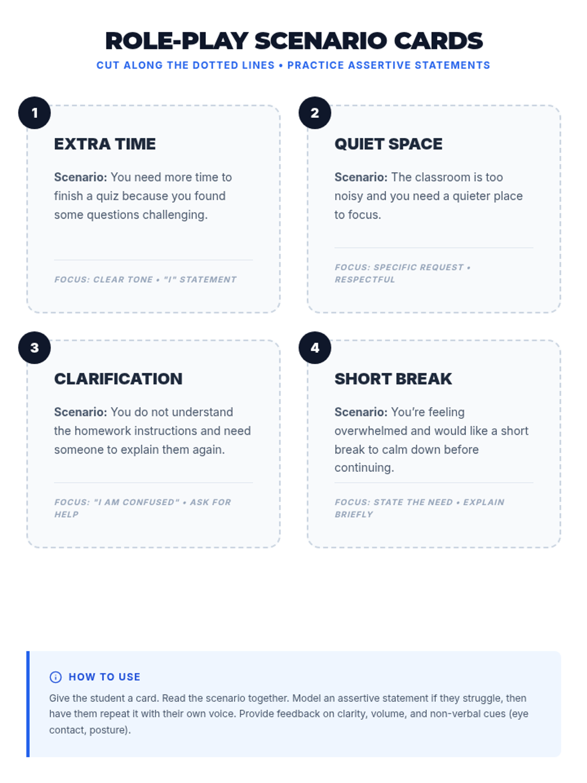 A concise 15-minute Tier 3 session designed for a 17-year-old male student with autism to build self-advocacy skills. This lesson equips the student with strategies to express needs and request support effectively, fostering independence and confidence.