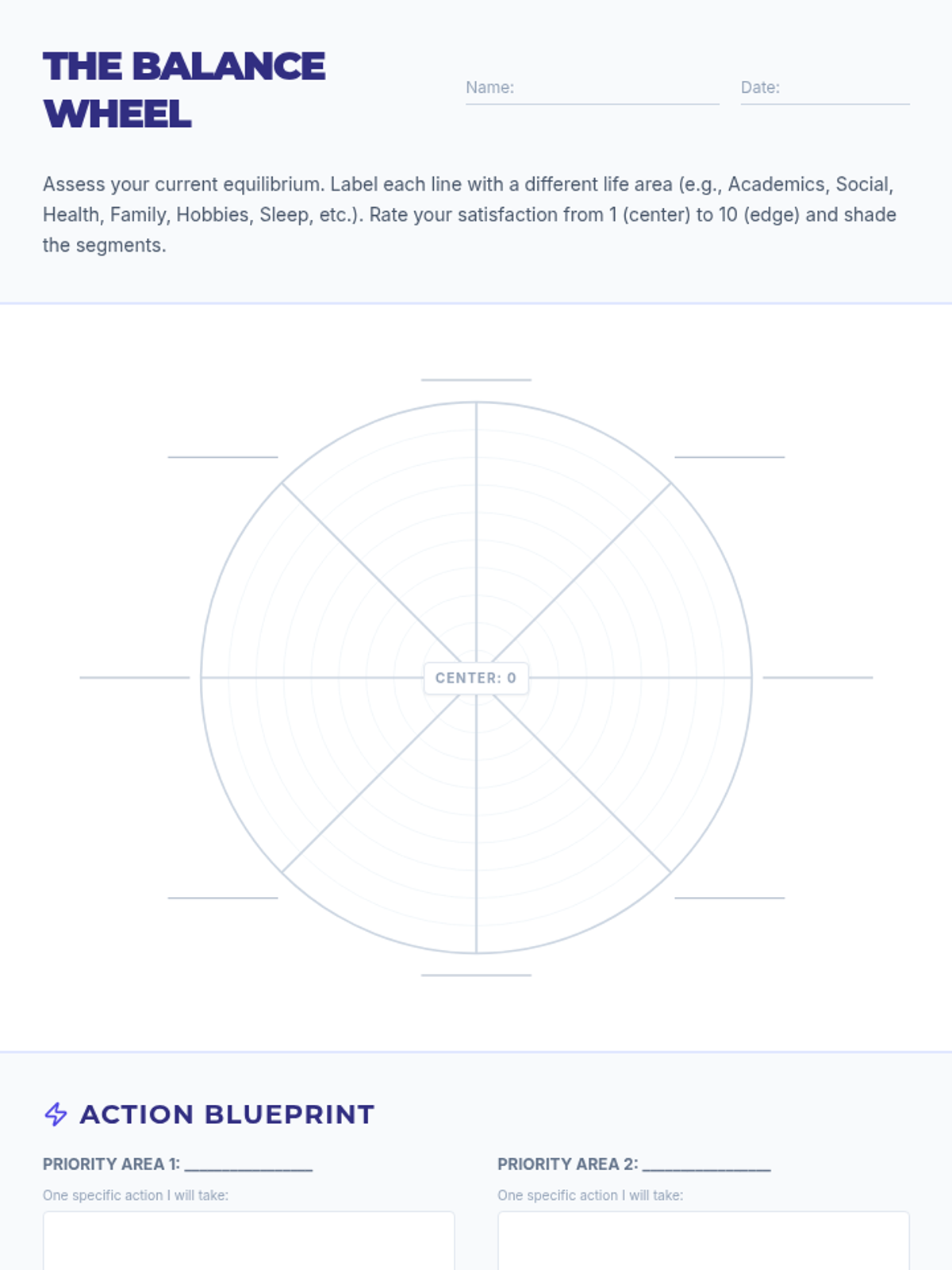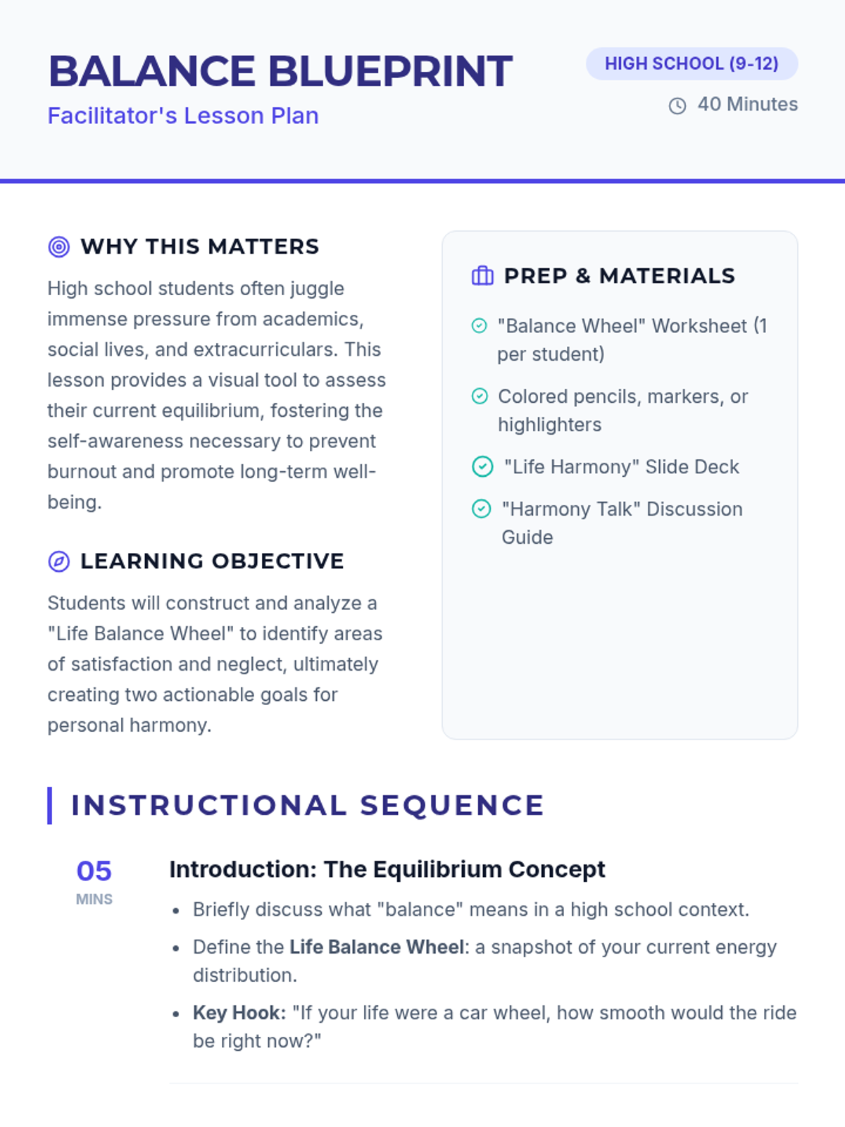 A lesson where high school students visualize their current life balance using a wheel model, fostering self-awareness and actionable goal-setting for personal harmony.