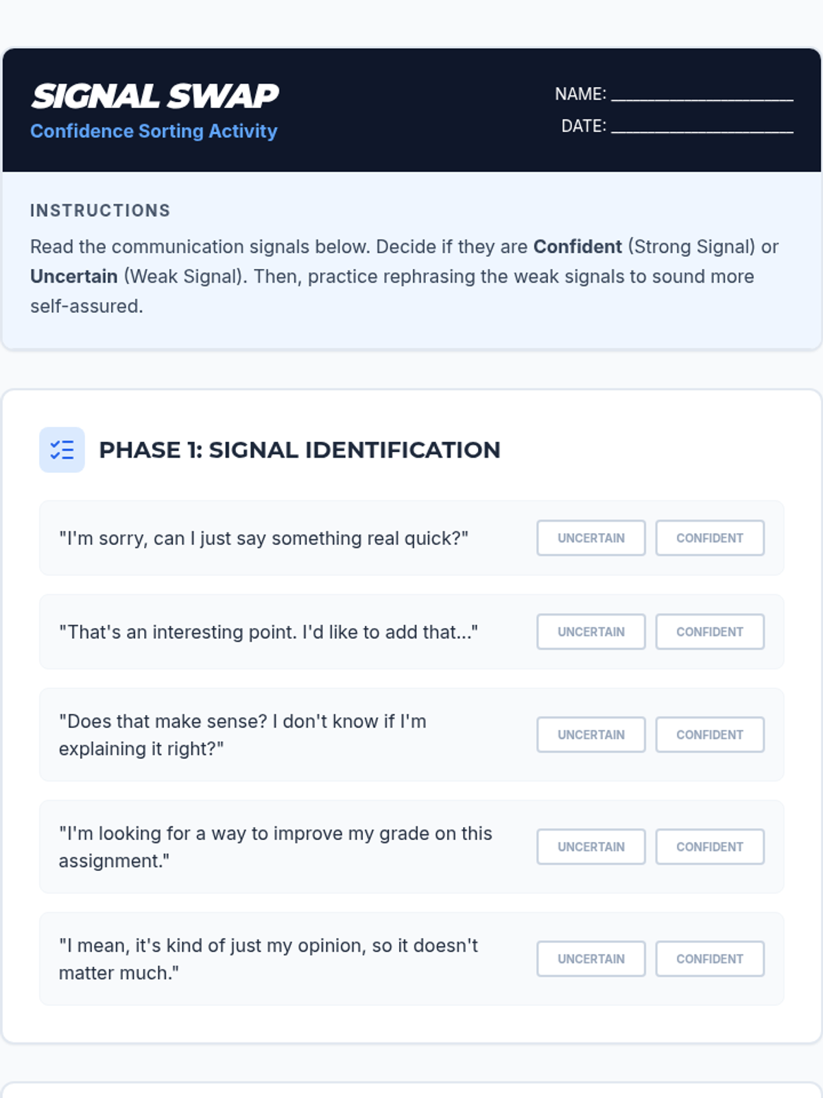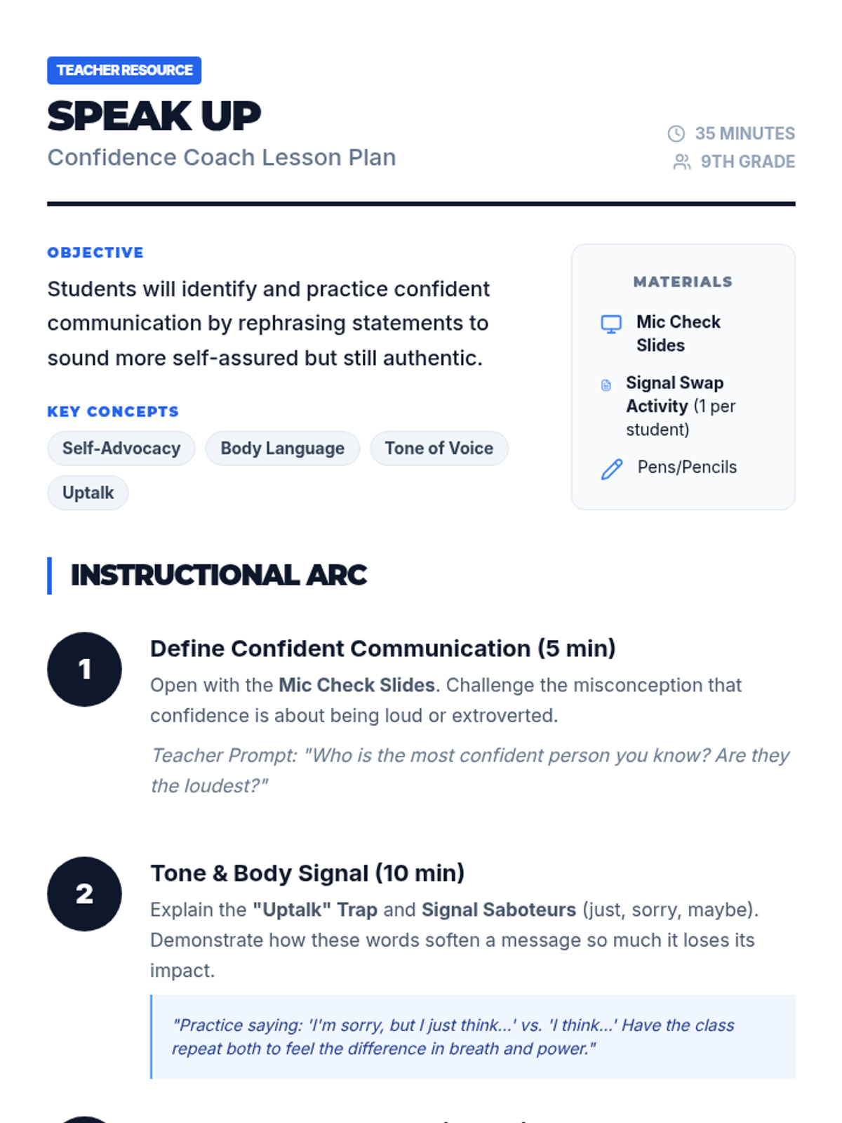 A 35-minute workshop for 9th graders focused on identifying confident vs. uncertain communication and practicing self-assured rephrasing.