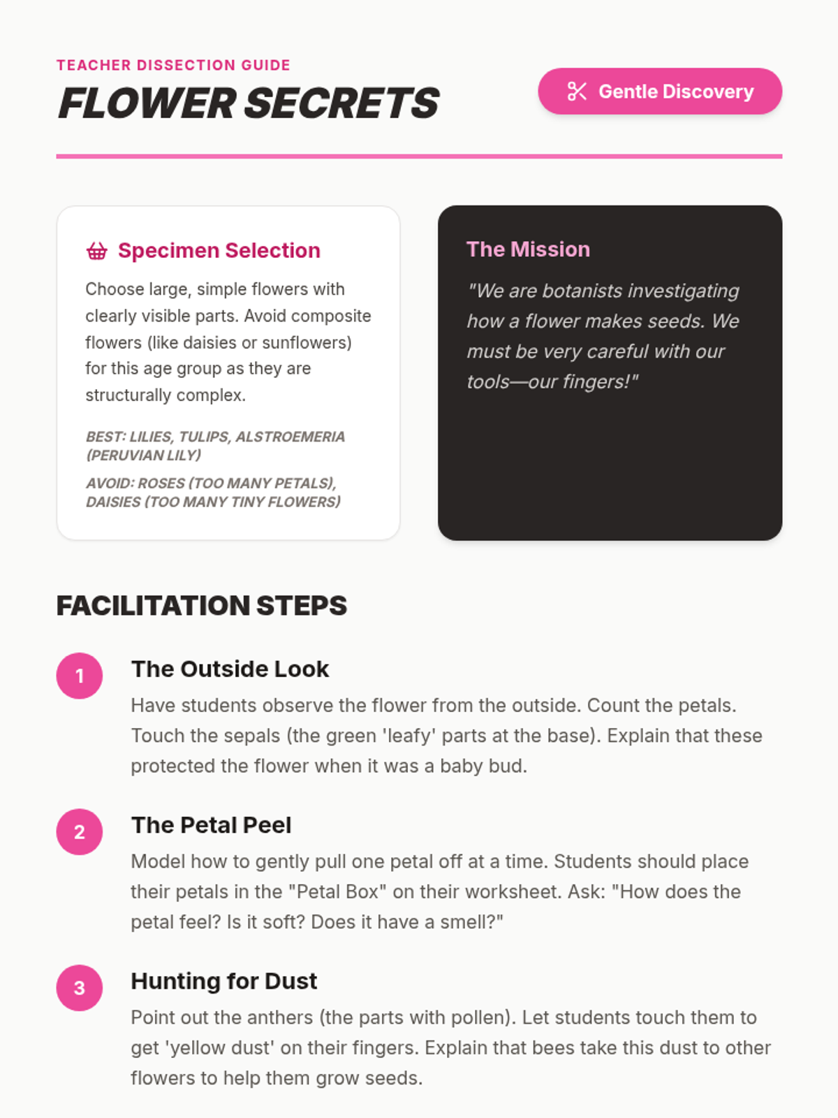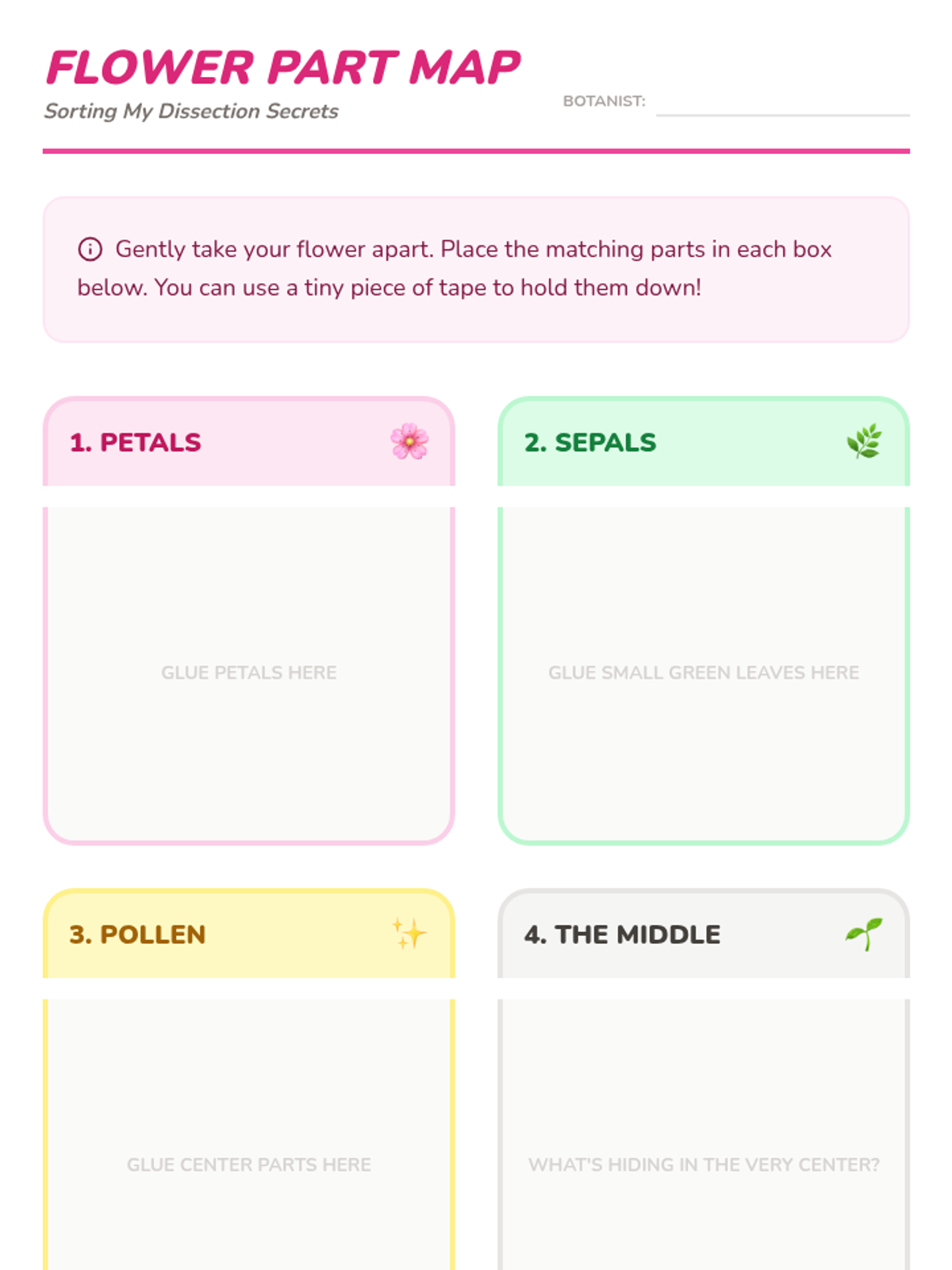 An introduction to flowers and their role in making seeds. Students perform a gentle dissection of a flower to identify its colorful parts and center.