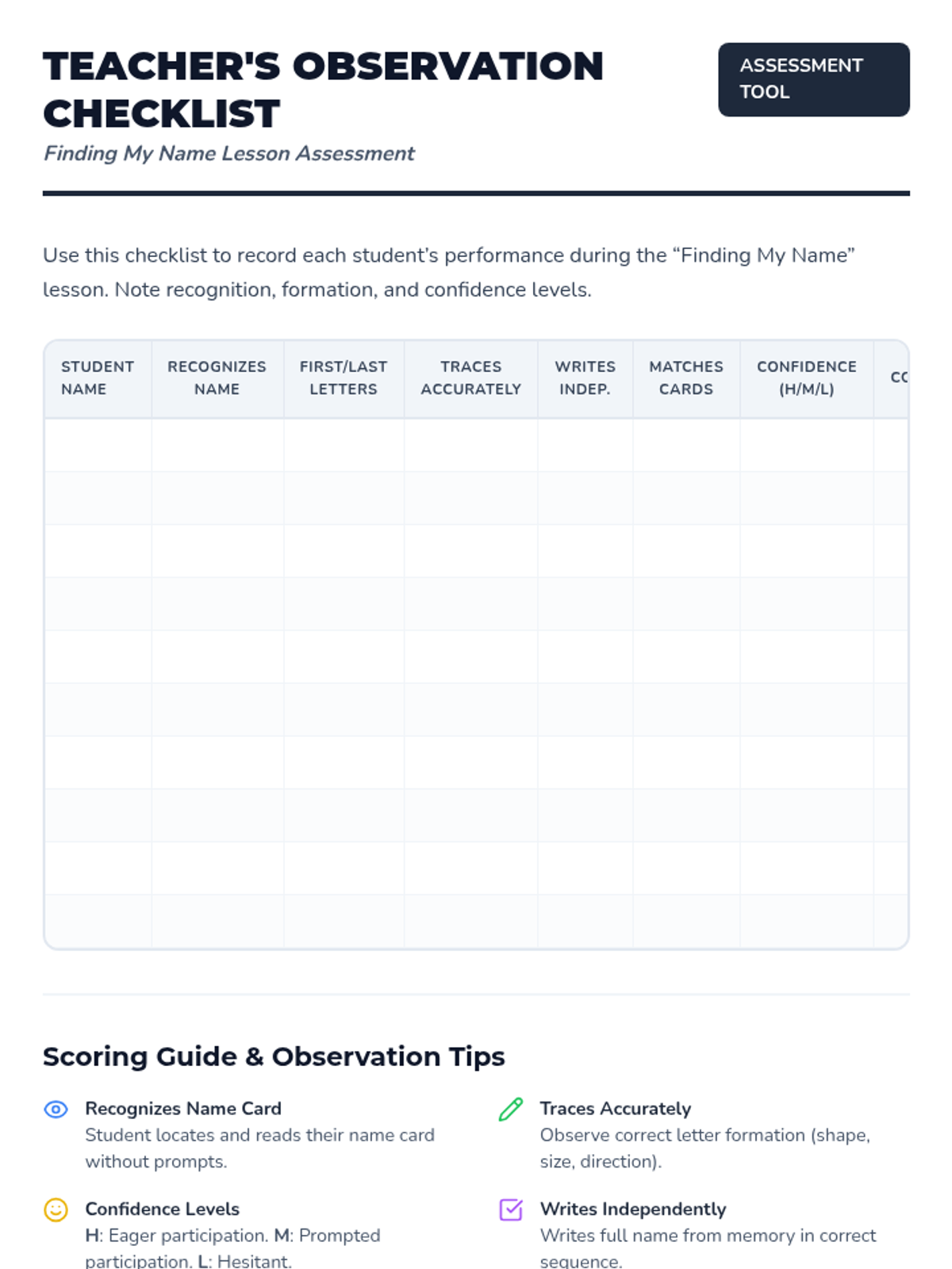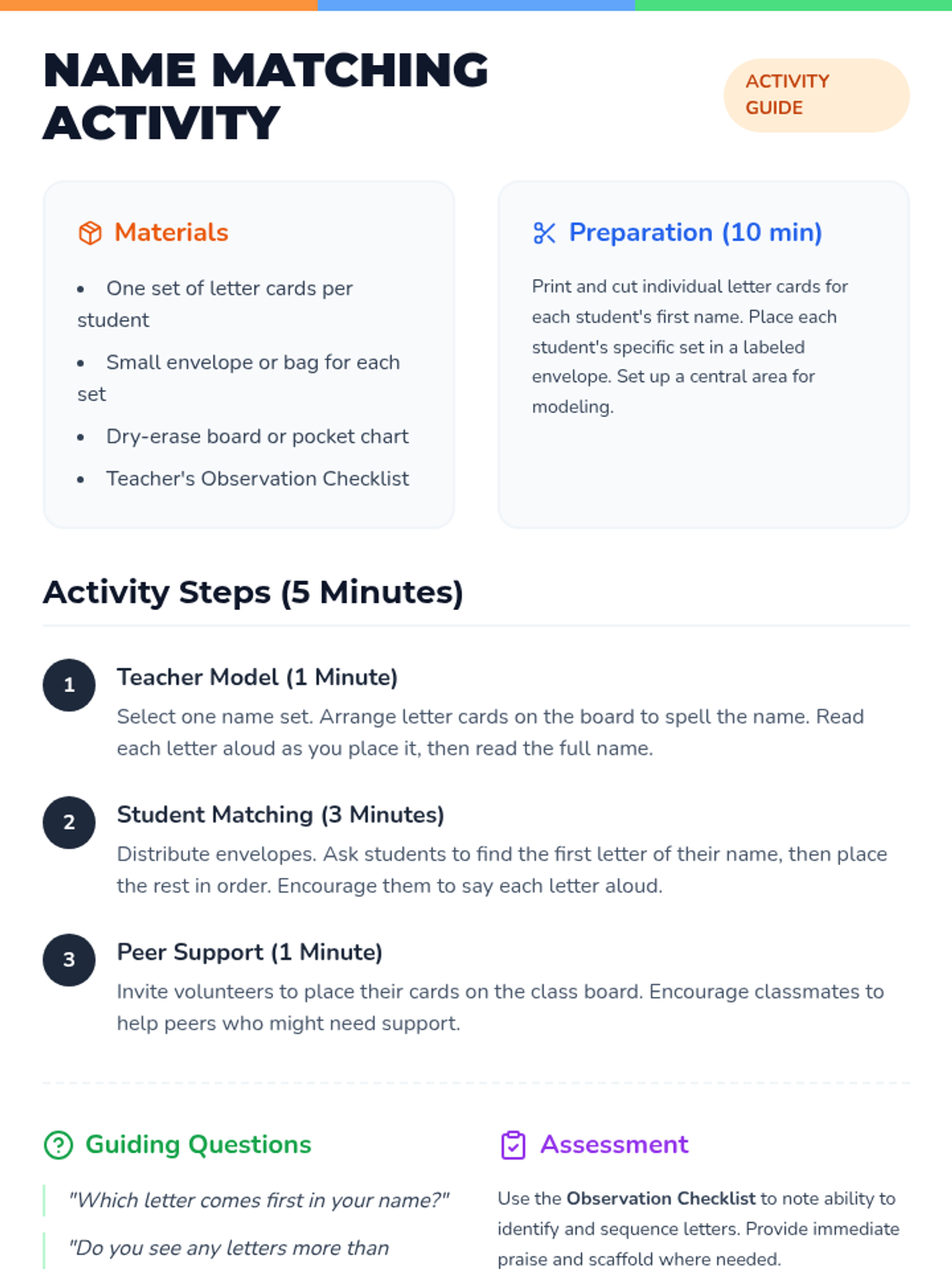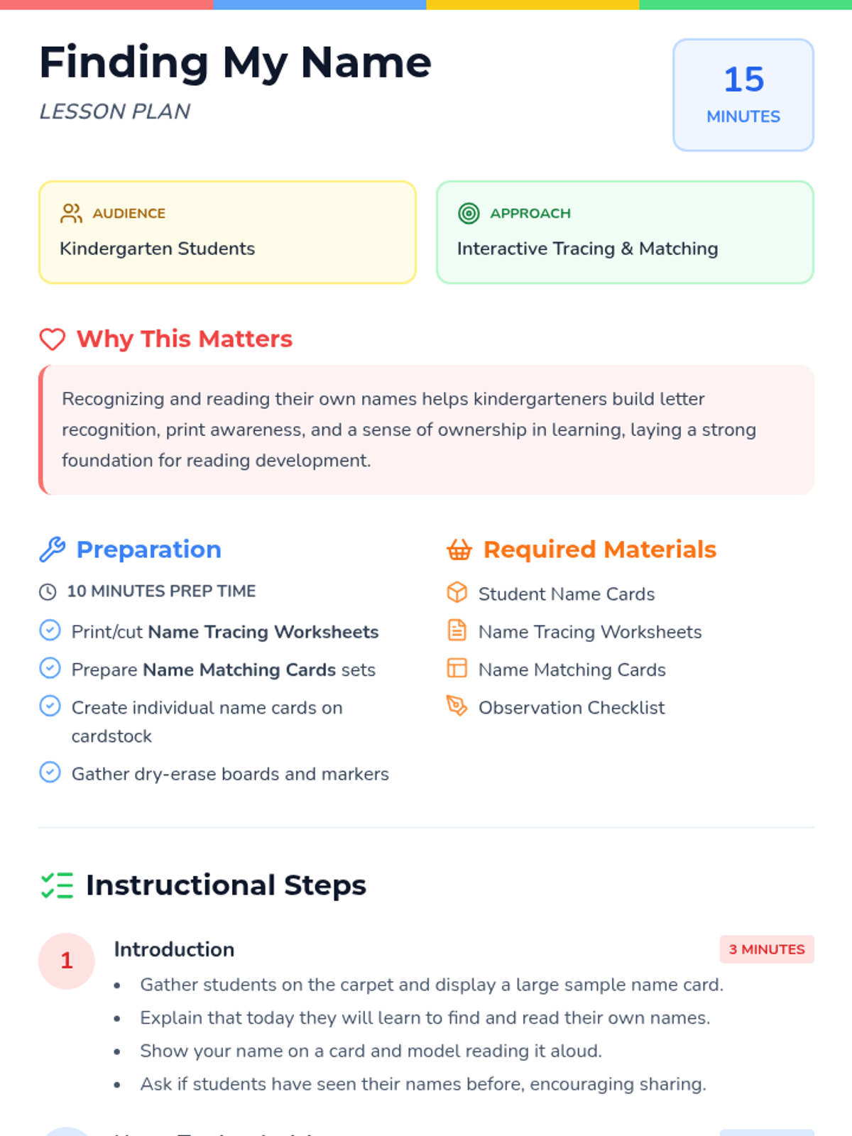 A 15-minute kindergarten lesson focused on name recognition, tracing, and letter matching to build early literacy confidence.