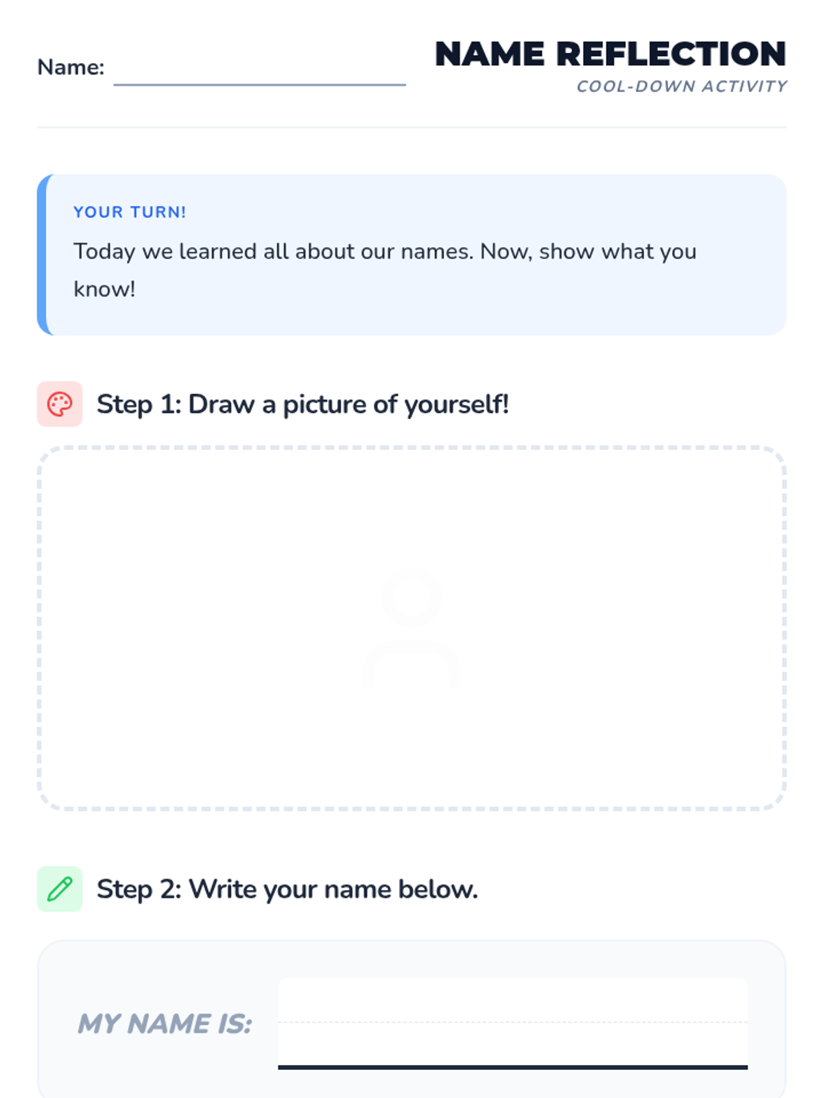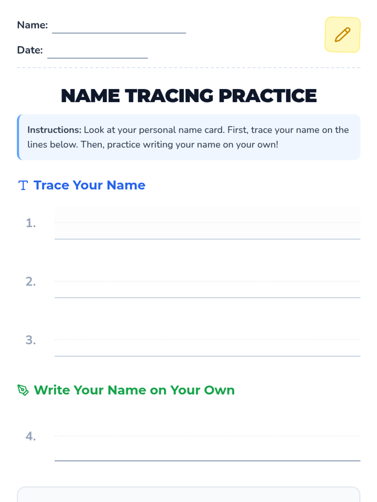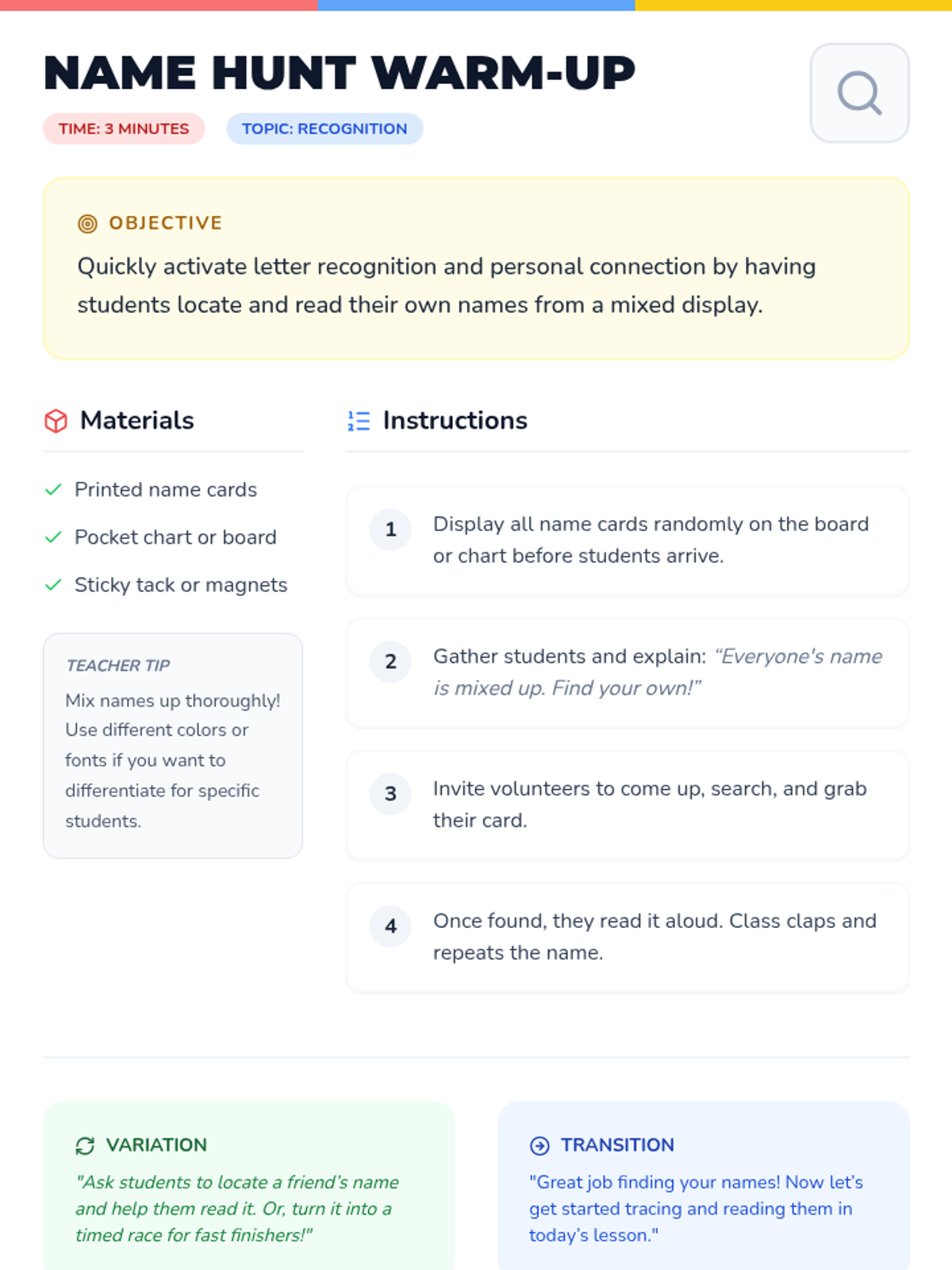 A 15-minute kindergarten lesson focused on name recognition, tracing, and letter matching to build early literacy confidence.