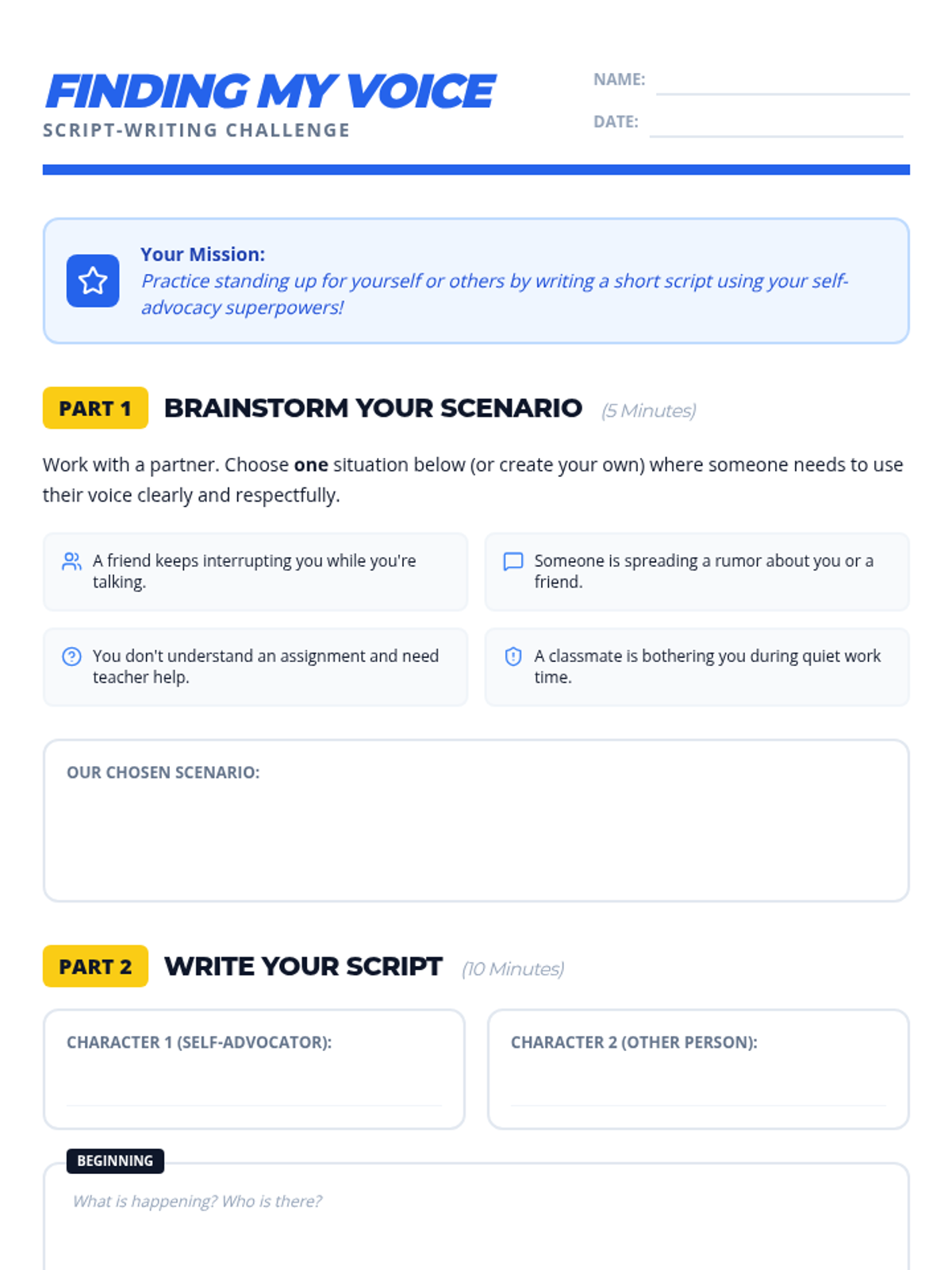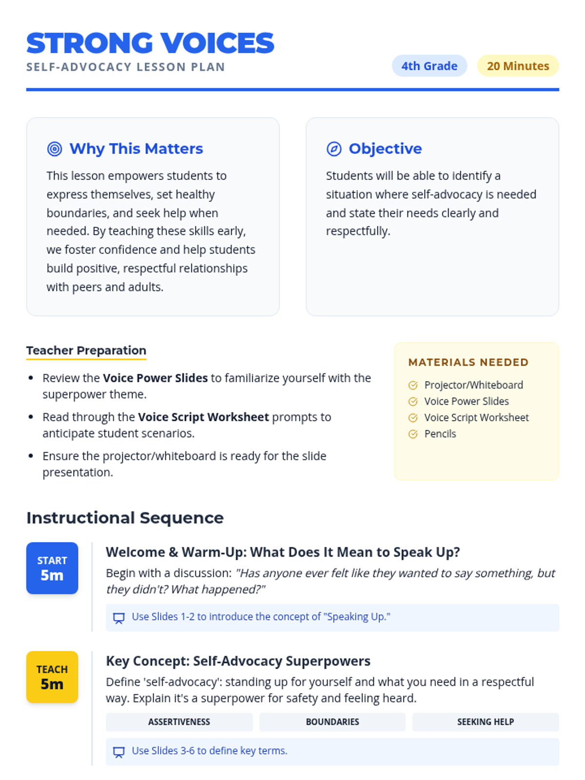 A 20-minute lesson for 4th graders on self-advocacy, teaching them to identify situations where they need to speak up and practice expressing their needs clearly and respectfully.