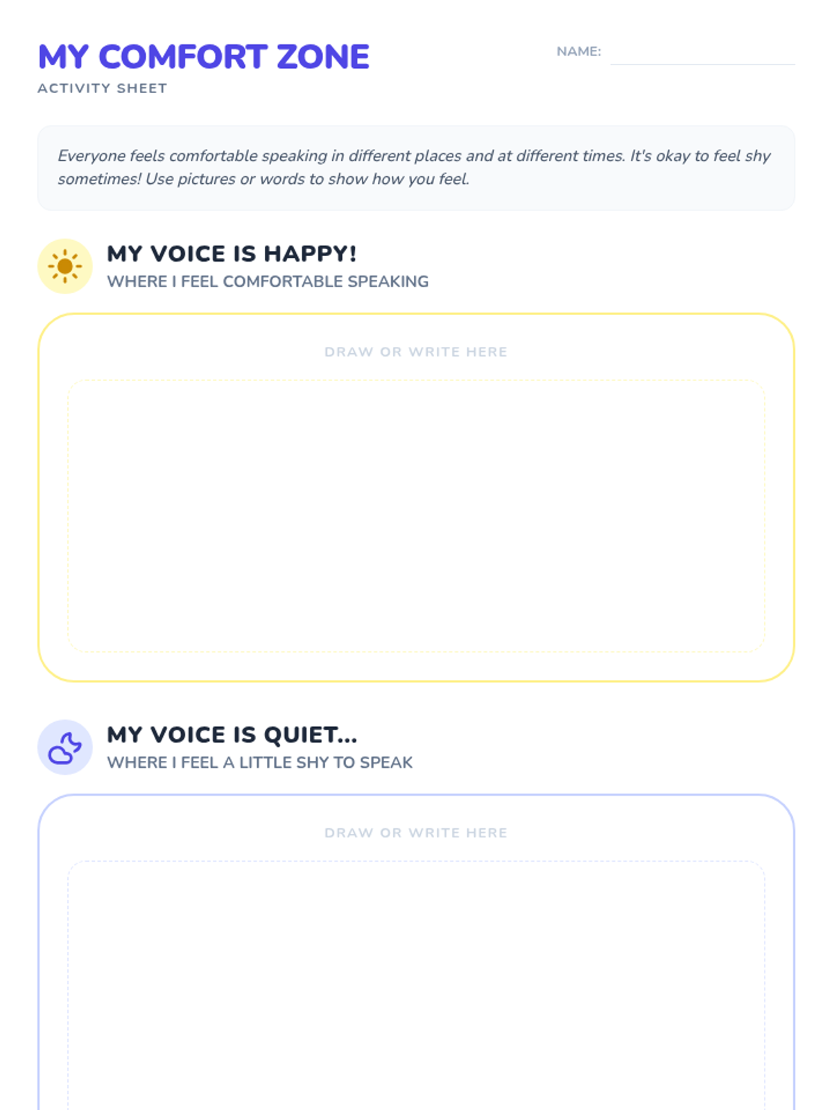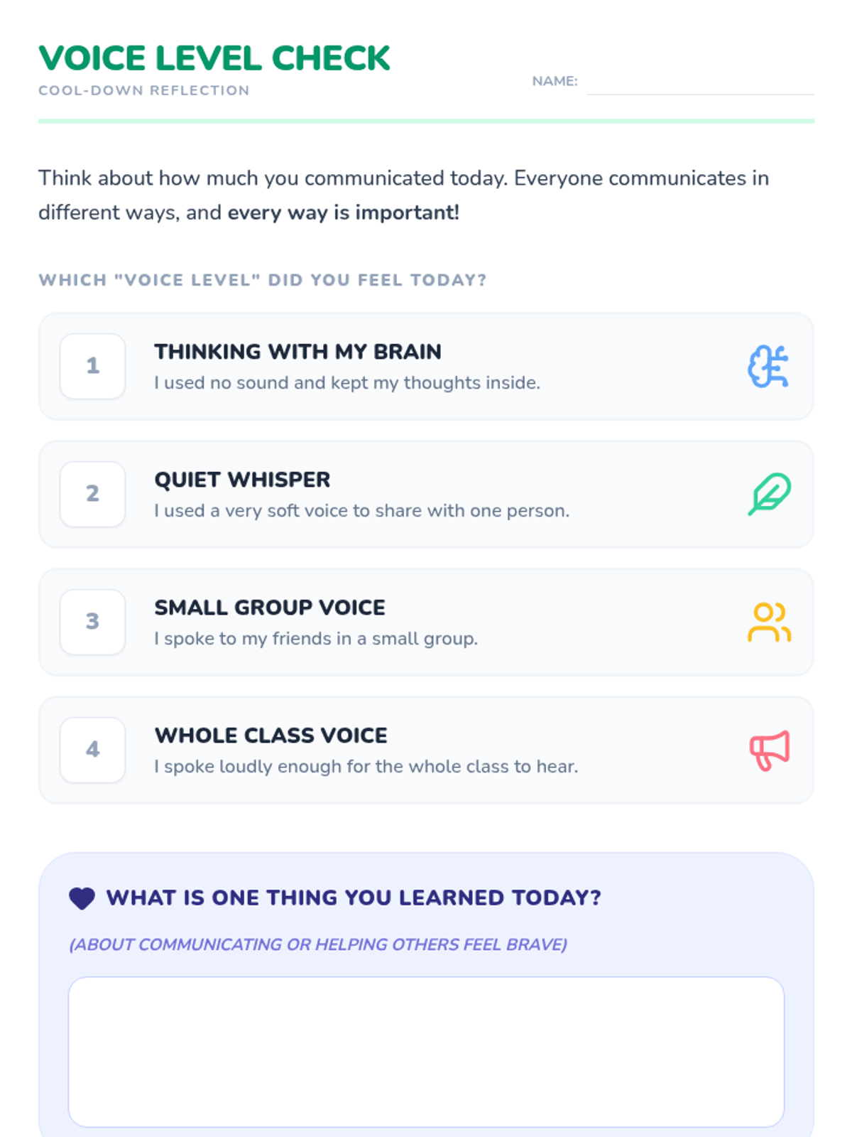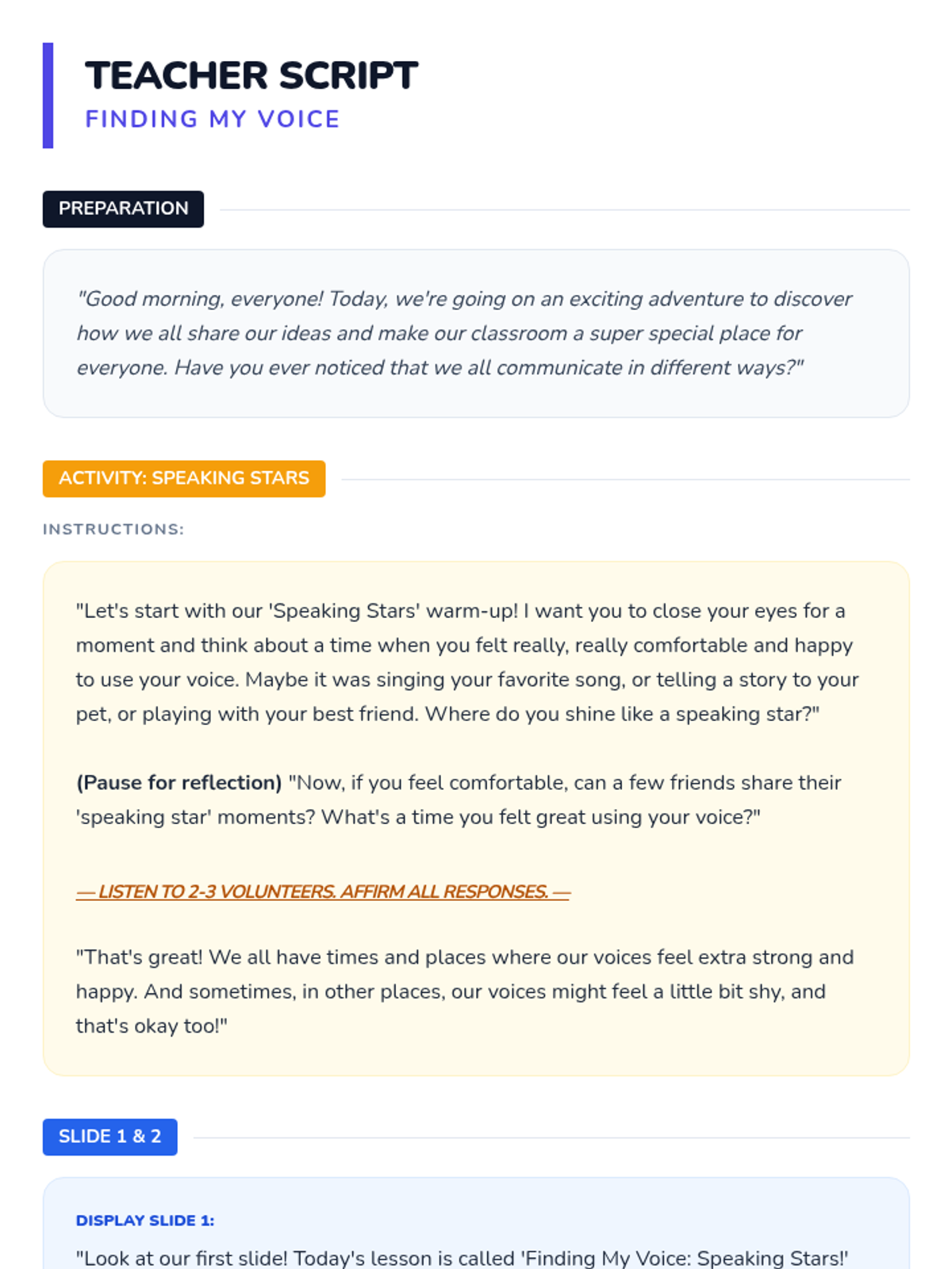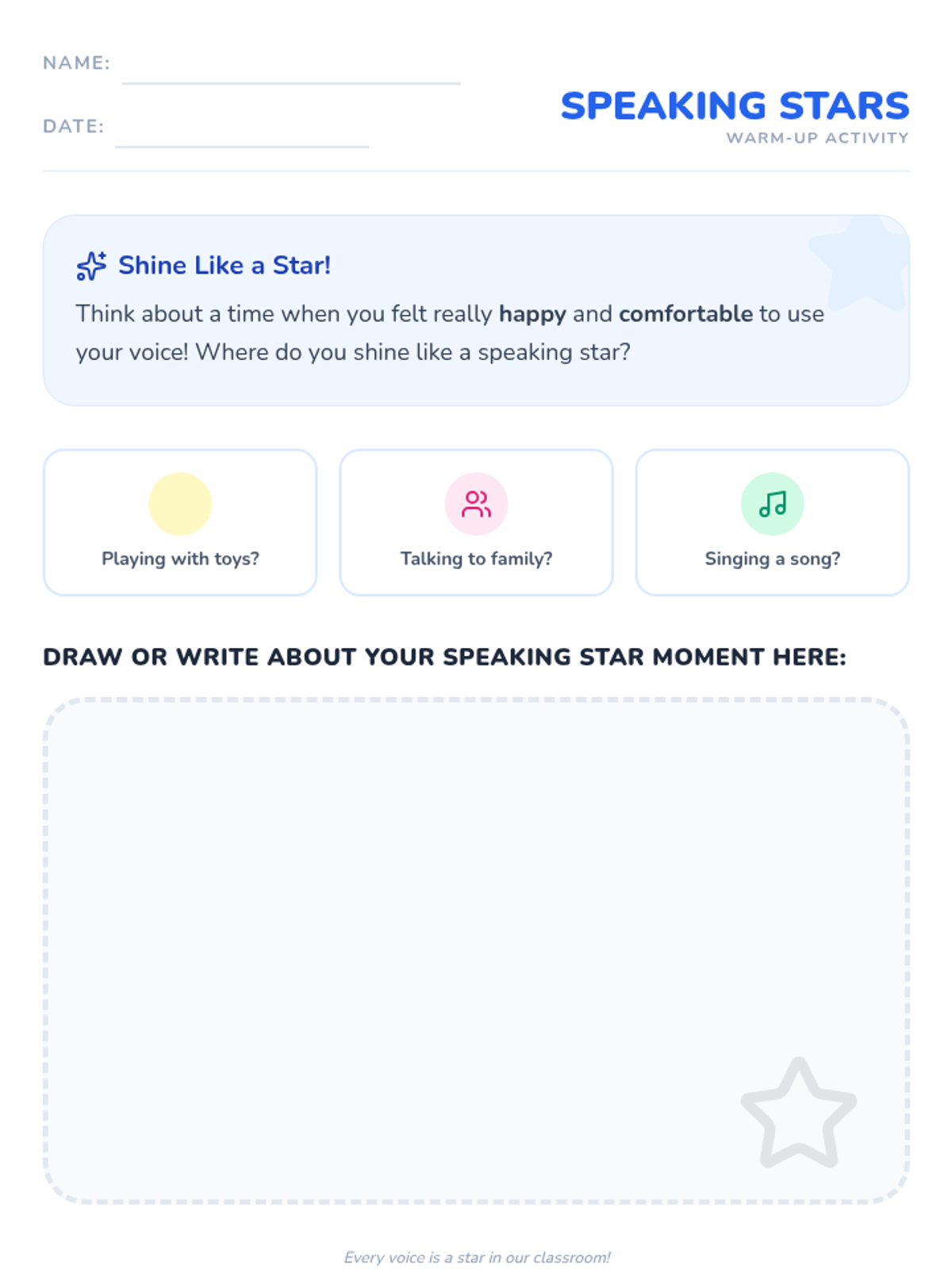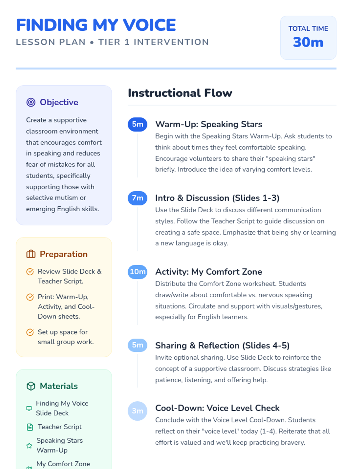 A 30-minute Tier 1 classroom intervention plan for 1st grade focusing on communication comfort levels and building a supportive environment for students with selective mutism or emerging English skills.