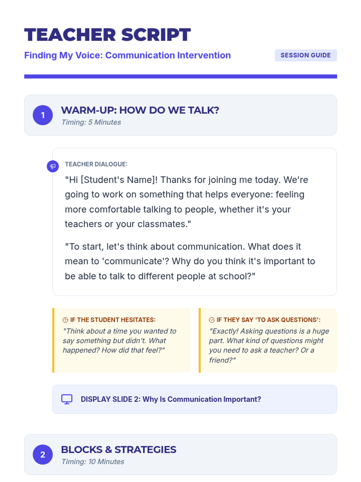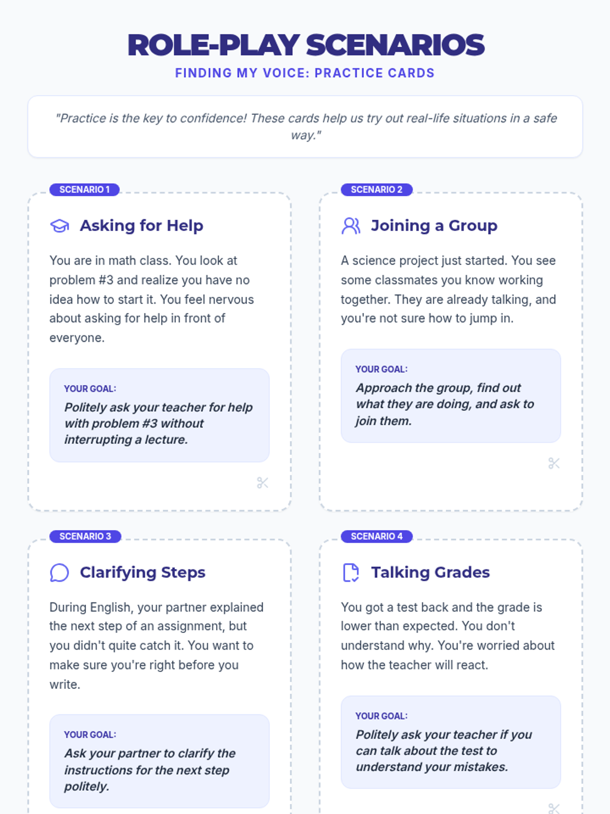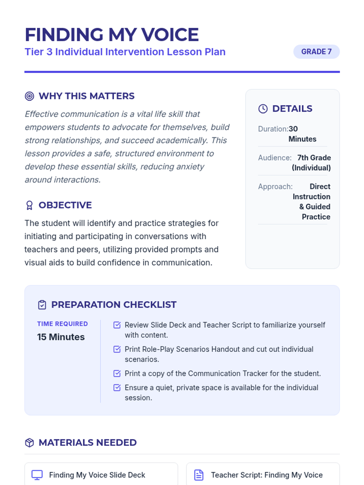 A 30-minute Tier 3 intervention for 7th graders focusing on self-advocacy and social communication through structured practice and role-play.
