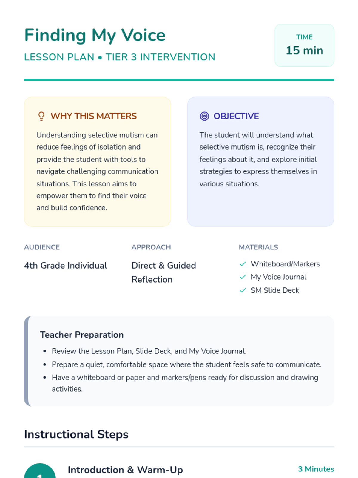 A 15-minute Tier 3 intervention for 4th-grade students to understand selective mutism and explore non-verbal communication strategies in a safe, supportive environment.