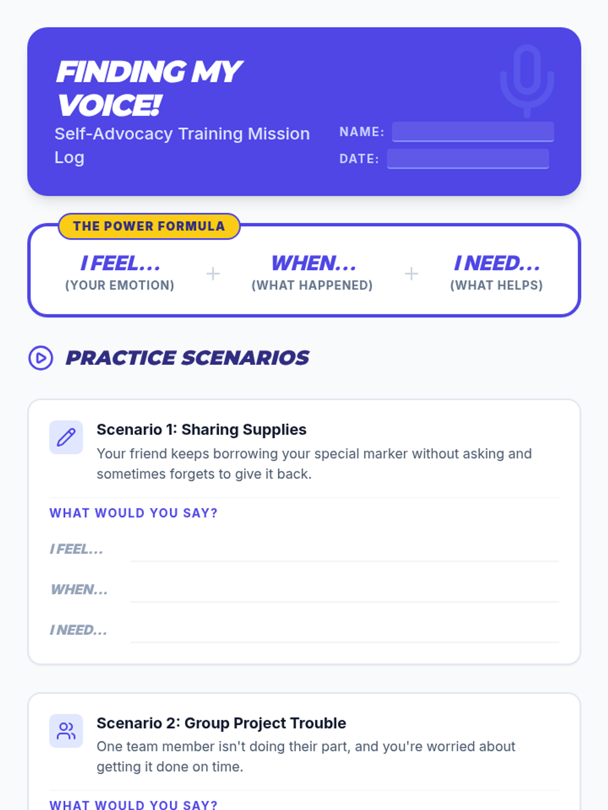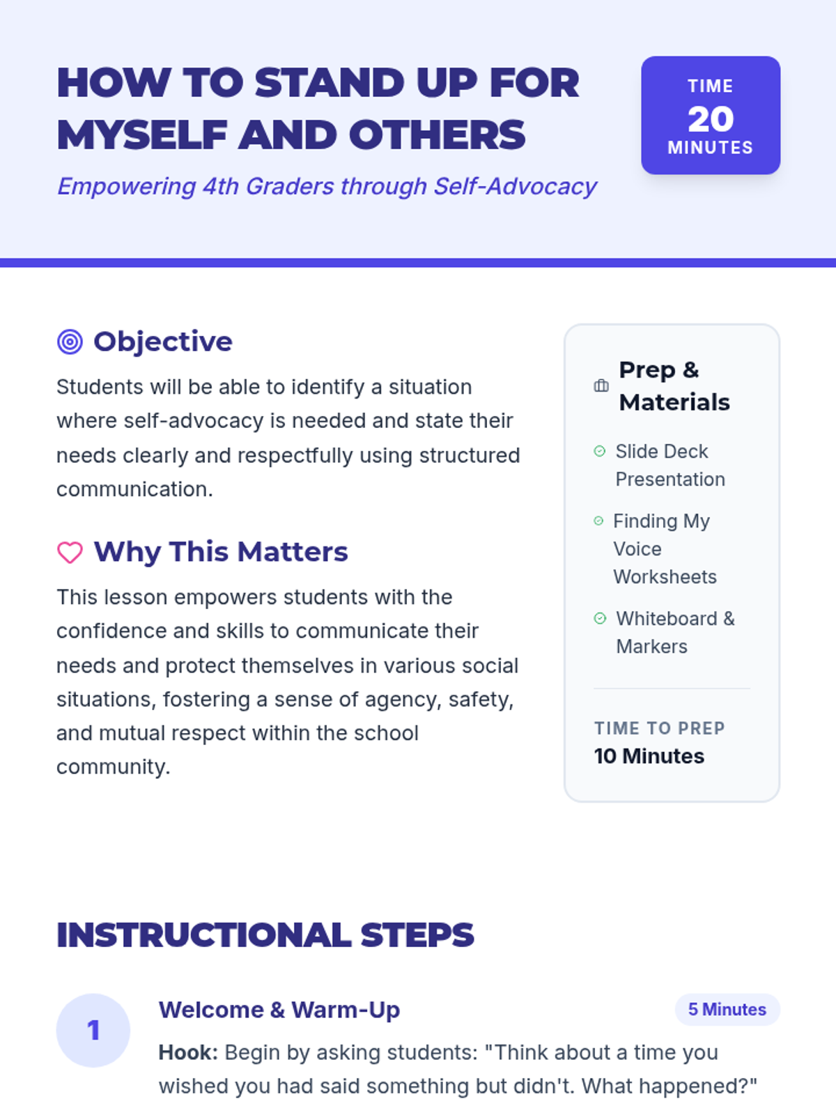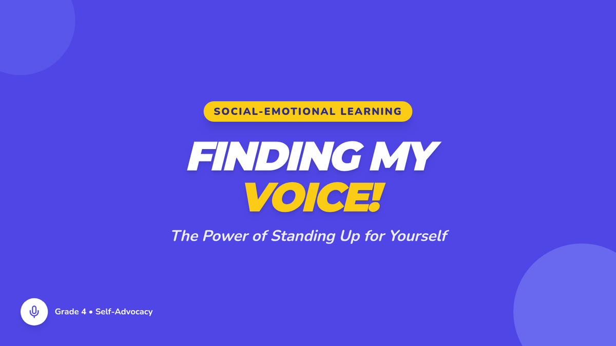 A 20-minute lesson for 4th-grade students on the power of self-advocacy, teaching them to use 'I feel... when... I need...' statements to communicate their needs respectfully.