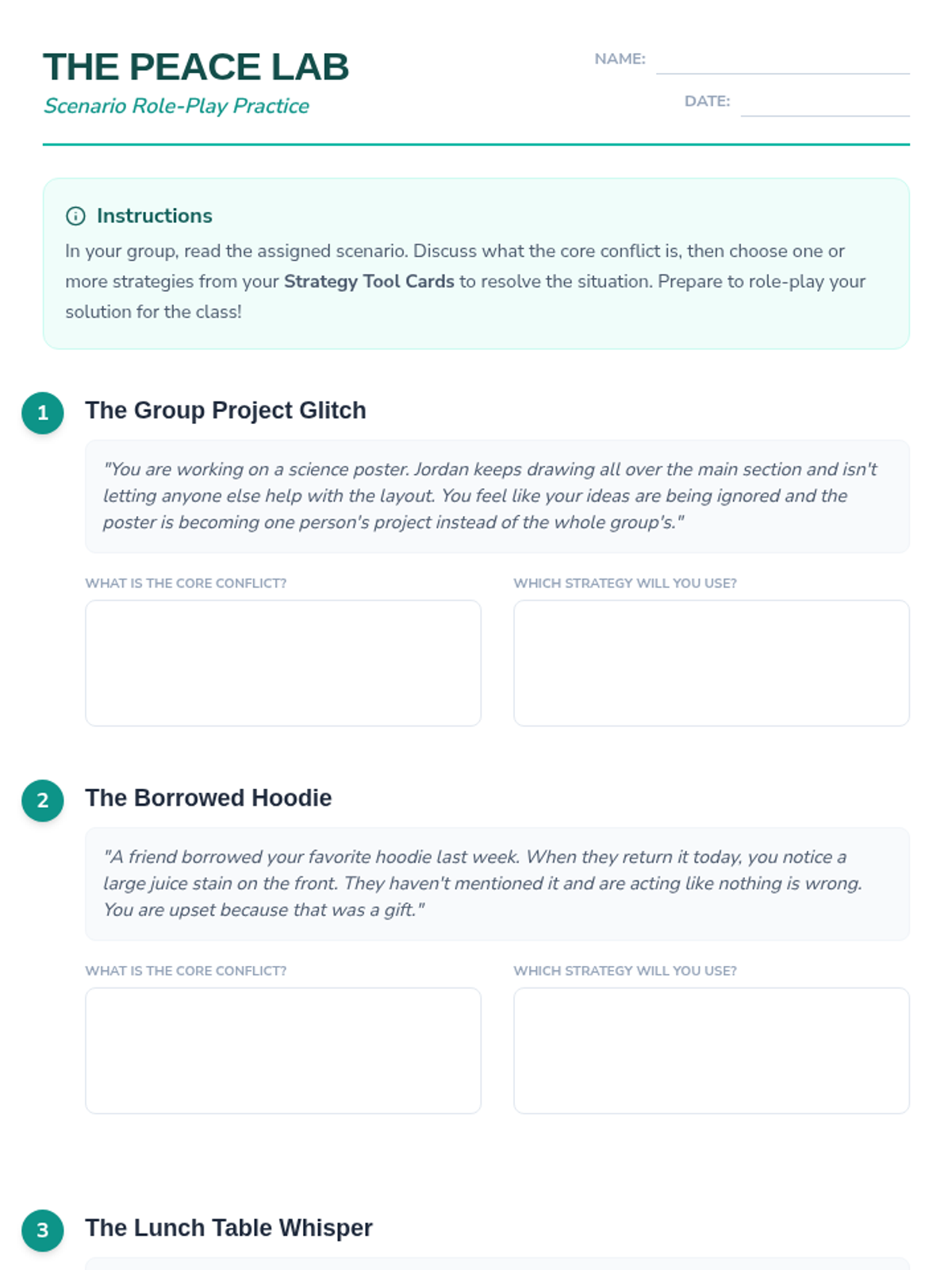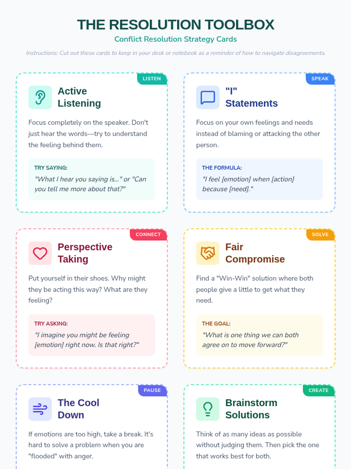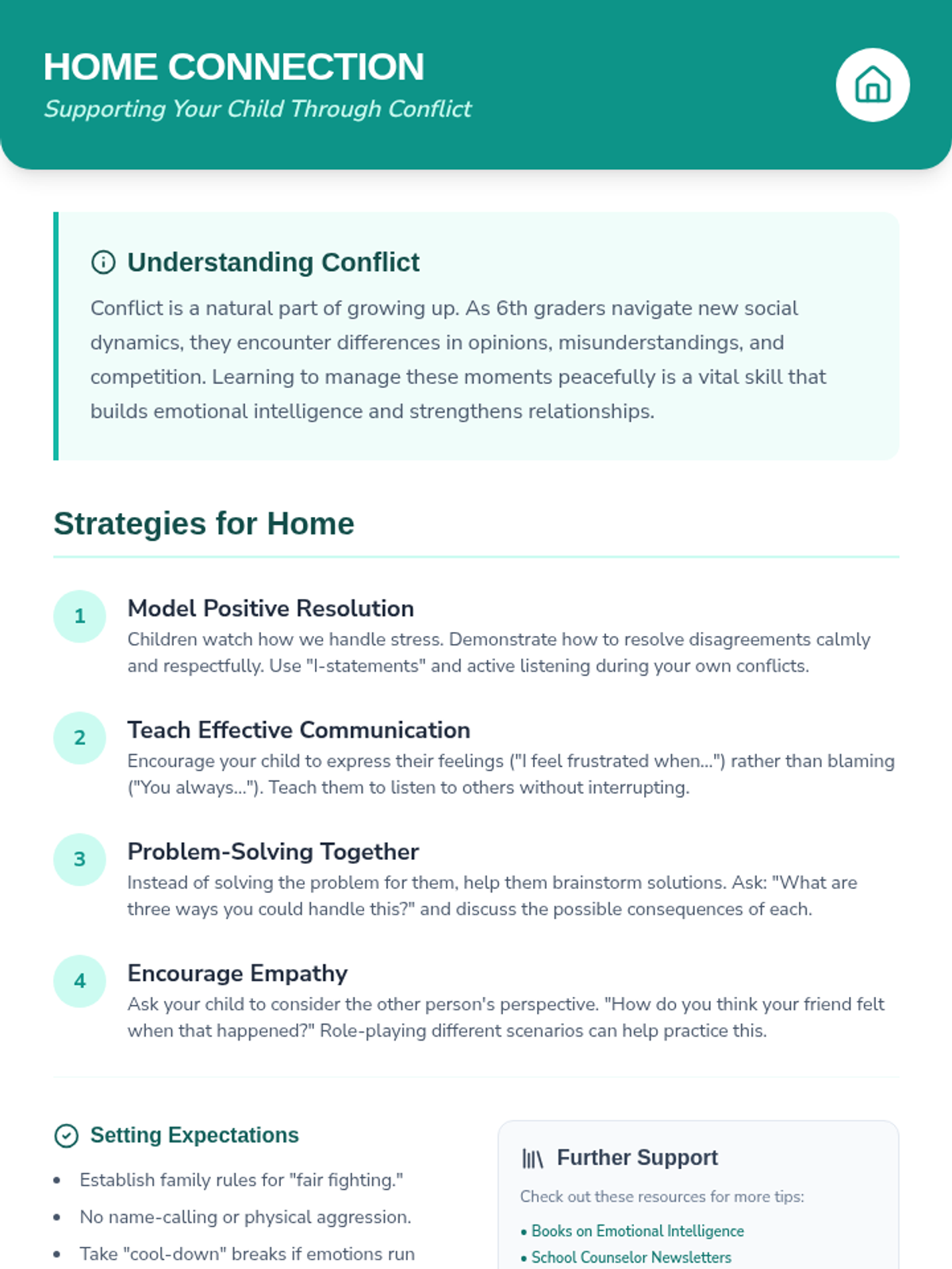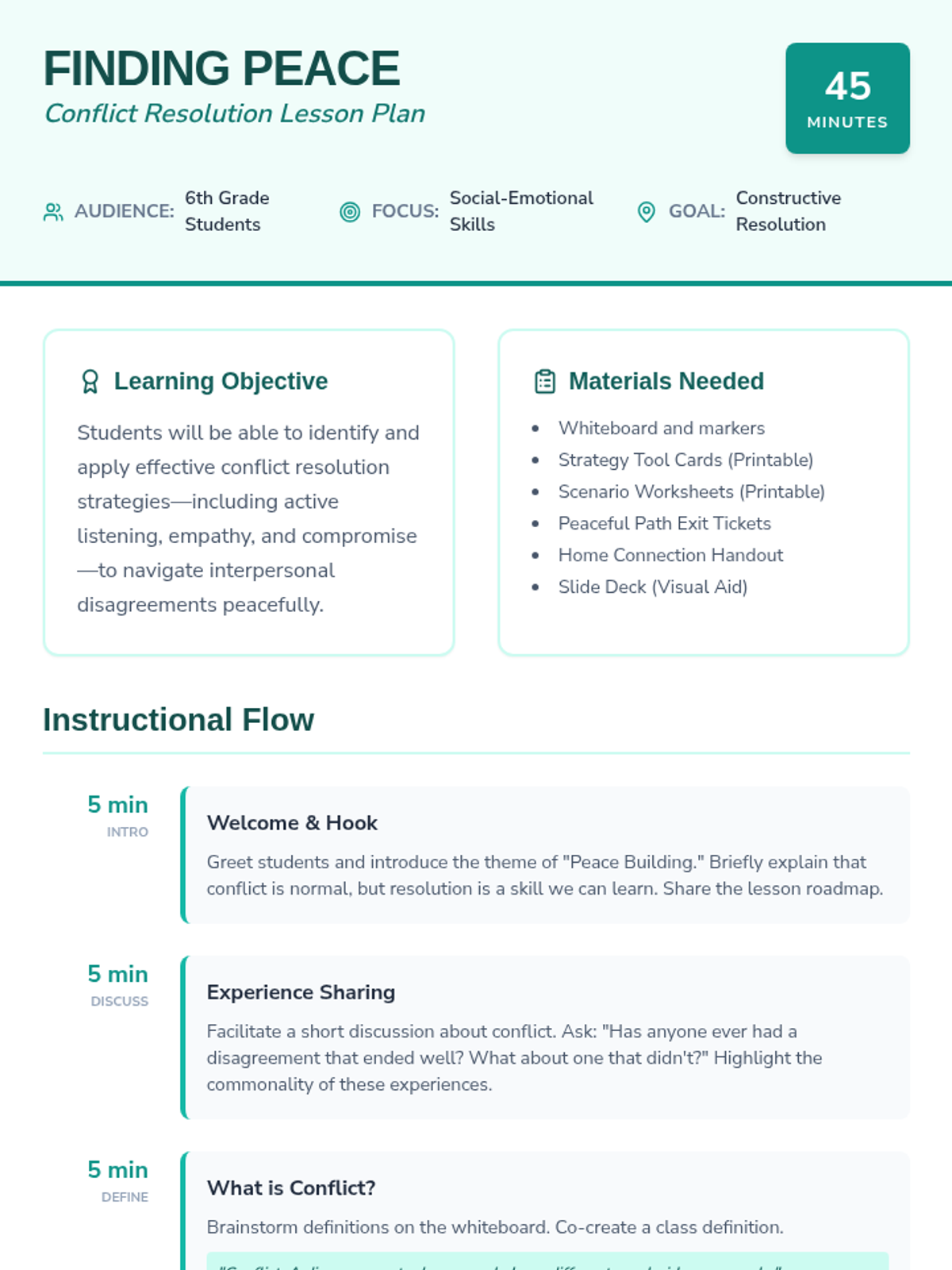 This lesson introduces 6th-grade students to effective strategies for resolving conflicts peacefully. Through discussion, role-playing, and reflection, students develop essential social-emotional skills for personal and academic success.