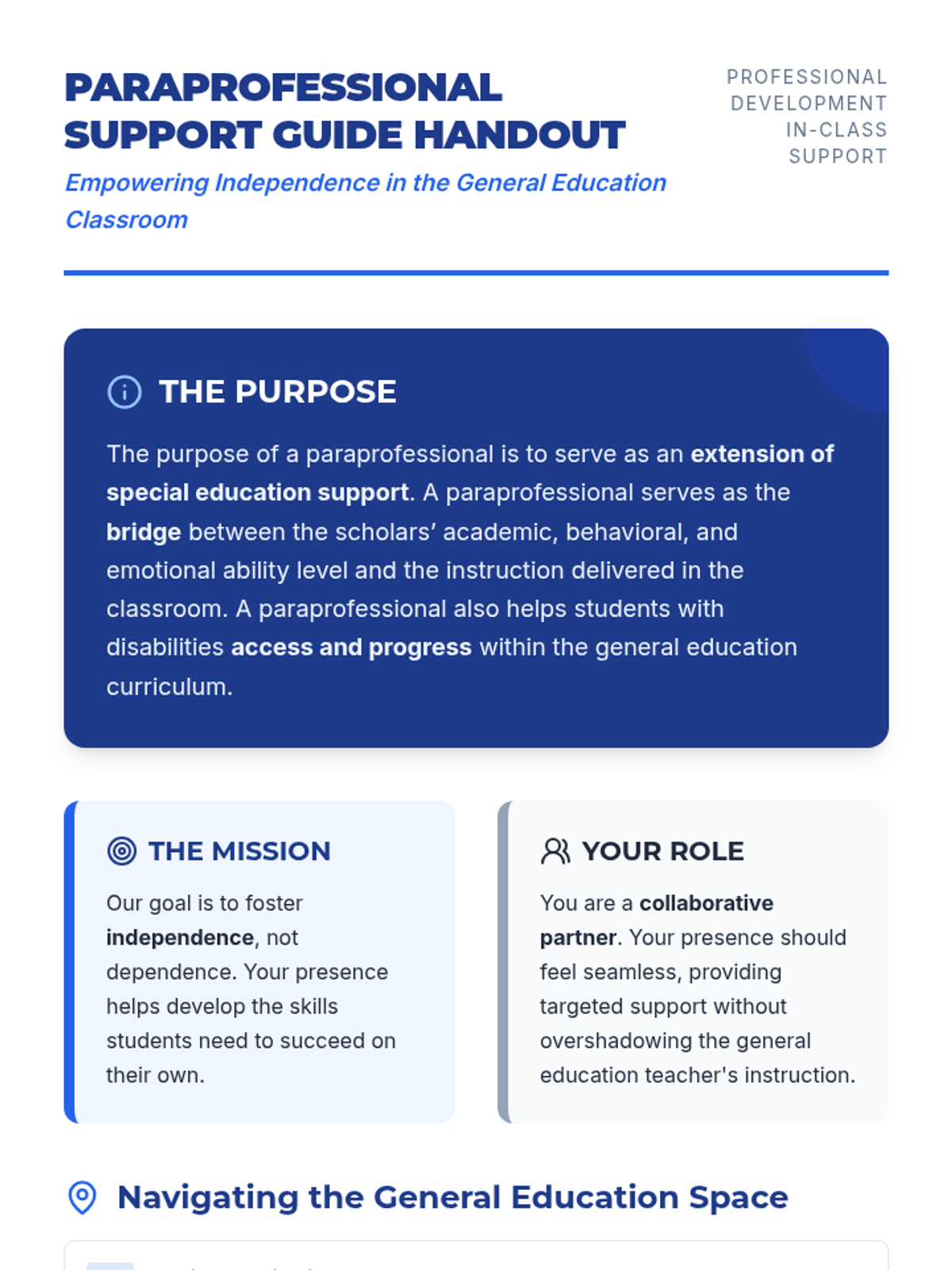 A professional development resource designed to clarify roles and expectations for paraprofessionals supporting students in inclusive general education settings.