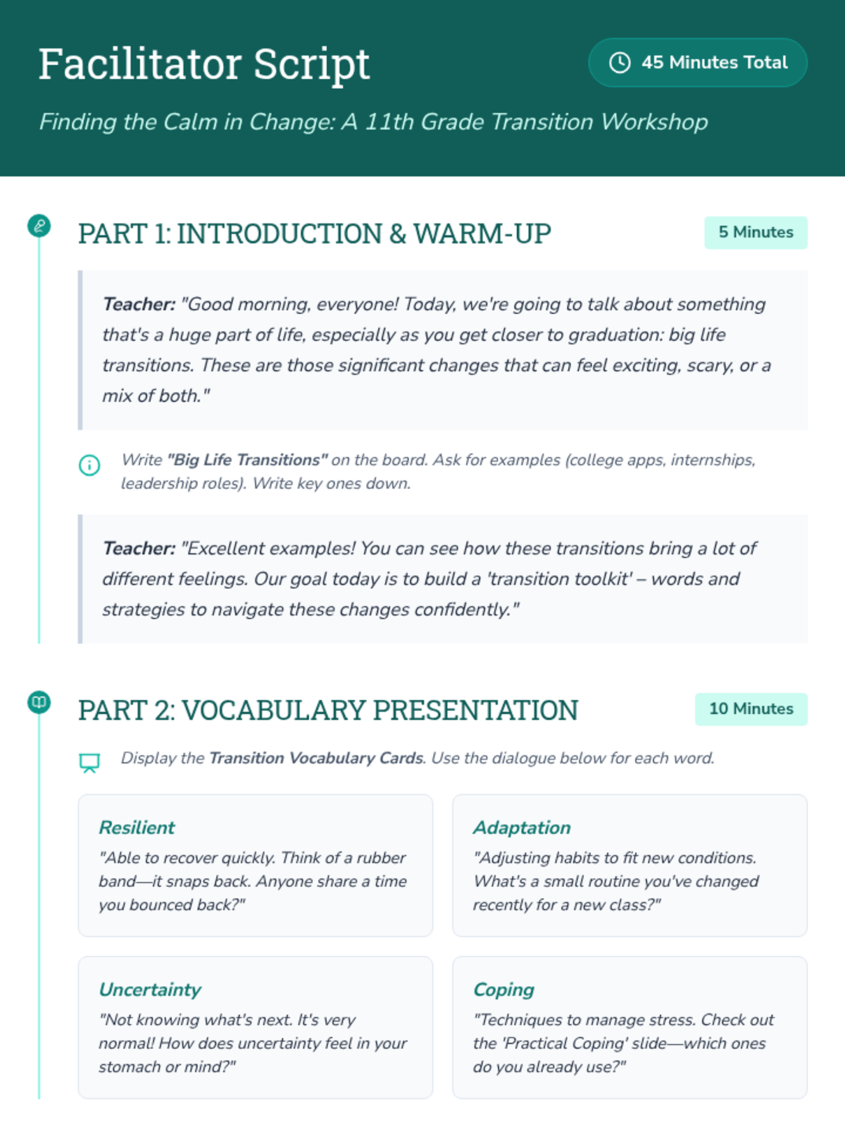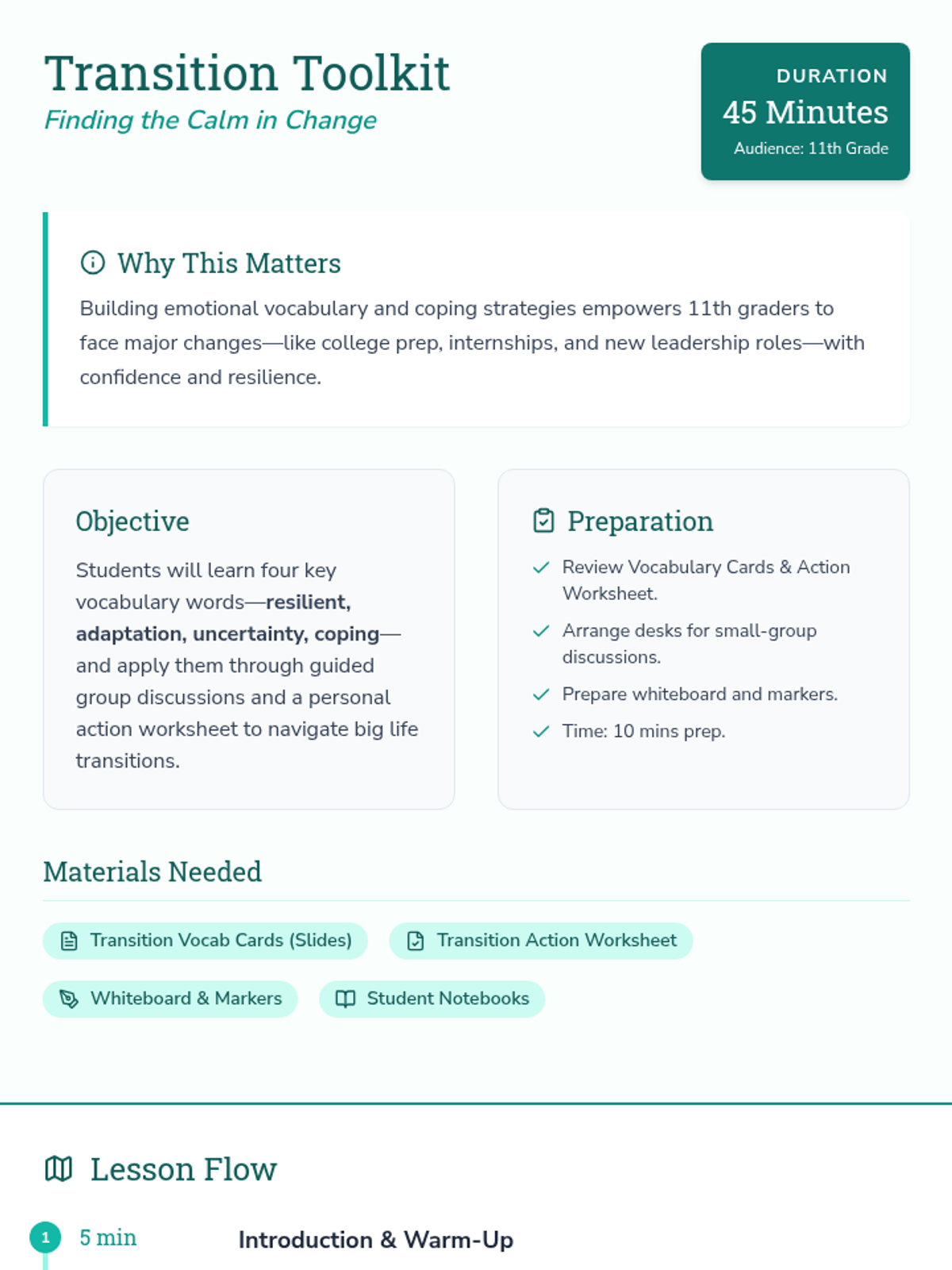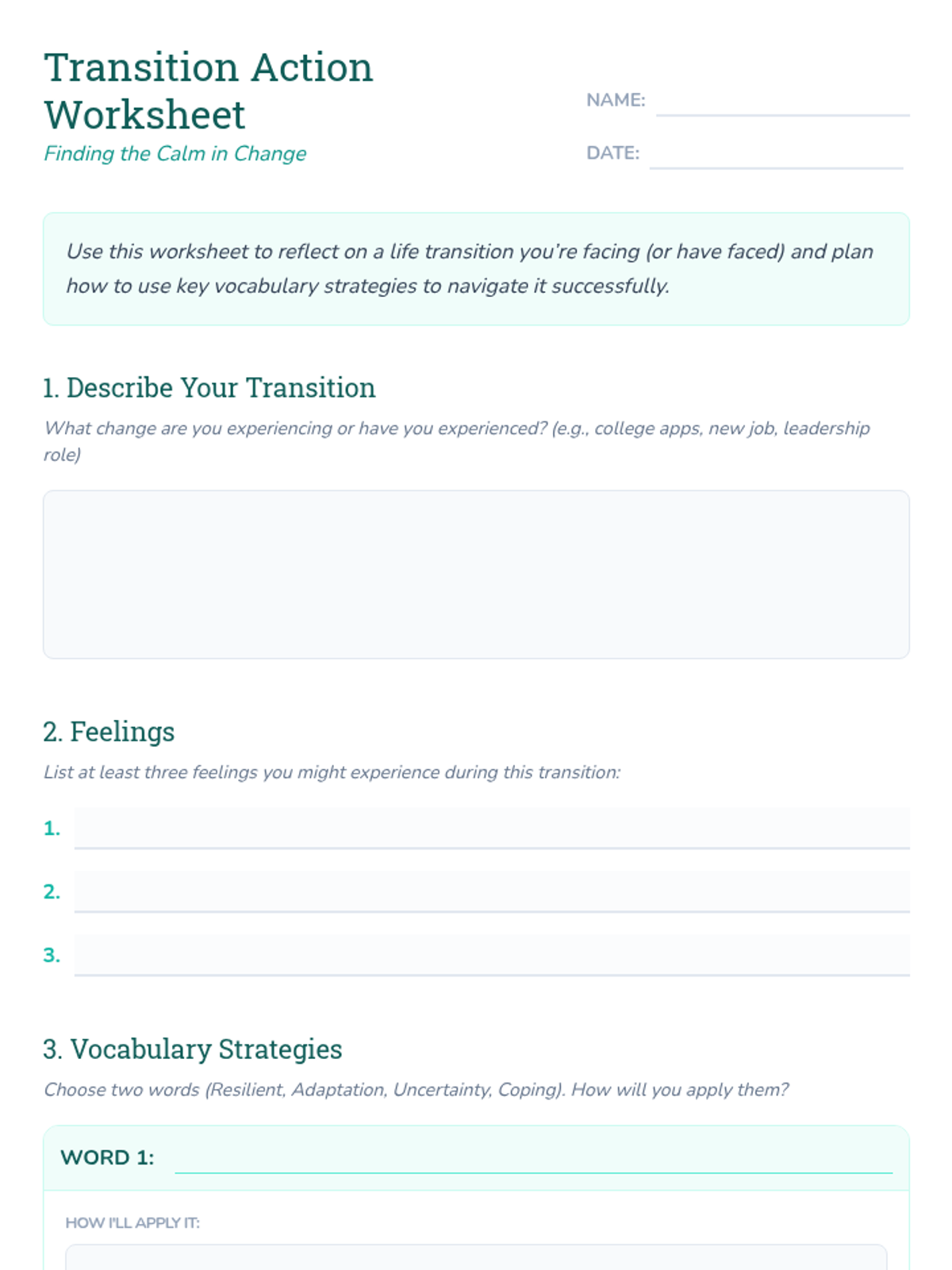In this 45-minute lesson, 11th graders learn four key vocabulary words related to coping with big life transitions and apply them through discussion and a personal action worksheet. This prepares students for challenges like college applications, internships, and new leadership roles.