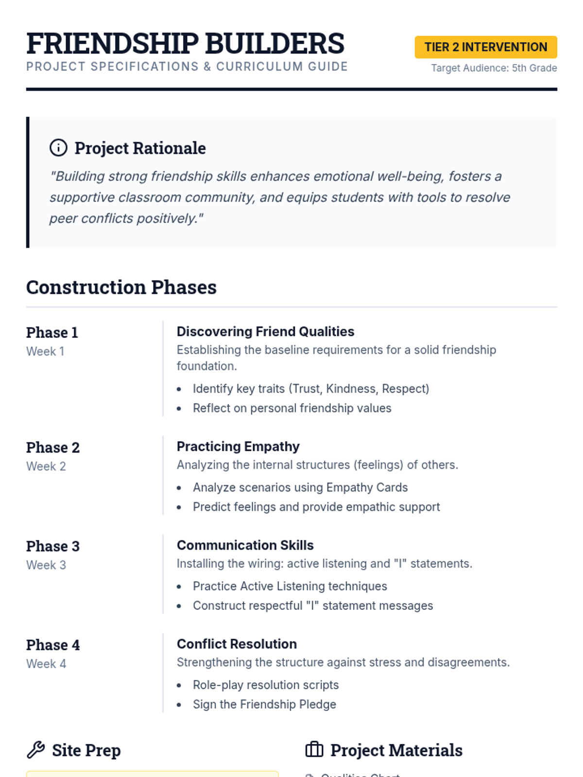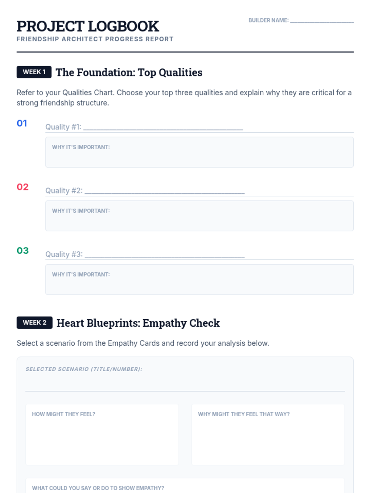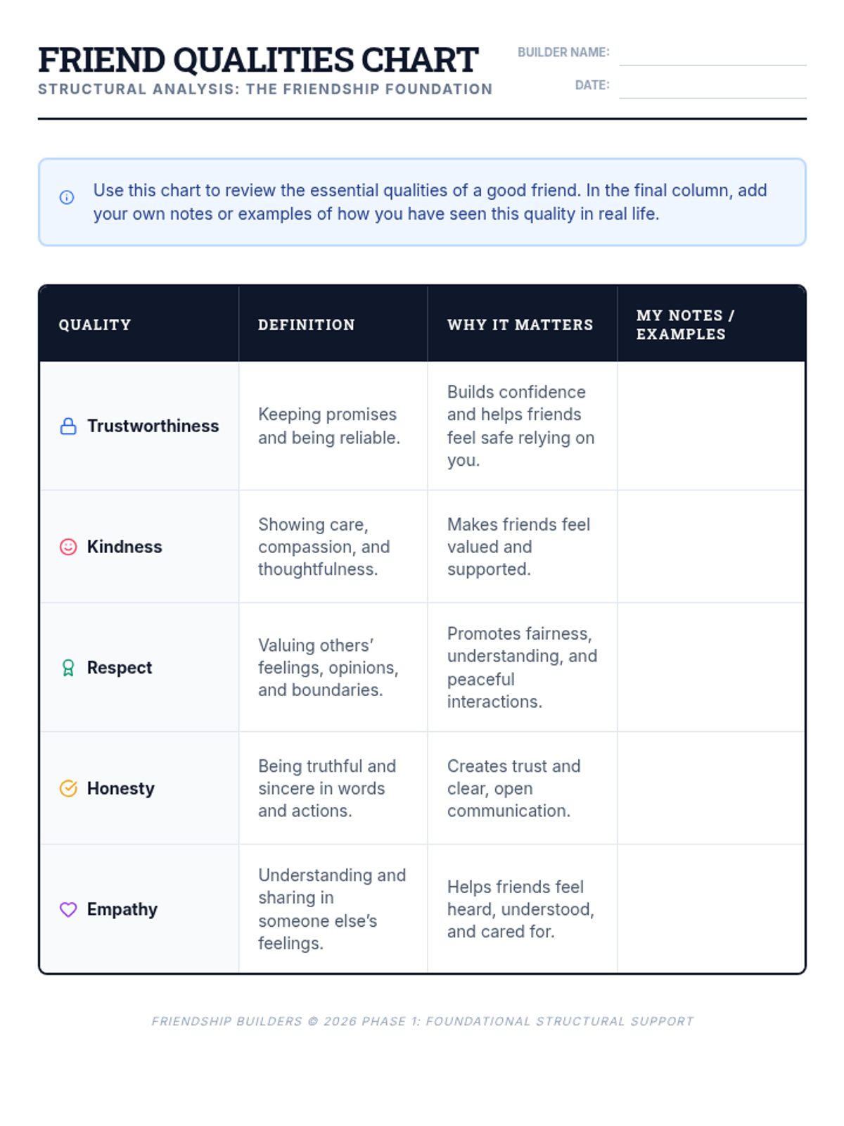 Students identify and explore the essential qualities that form the foundation of a strong friendship using a structured chart and reflection worksheet.