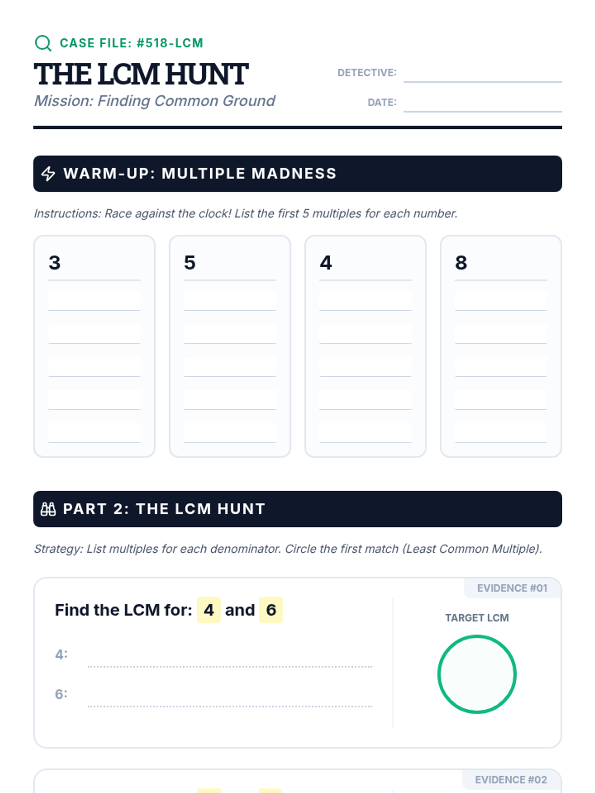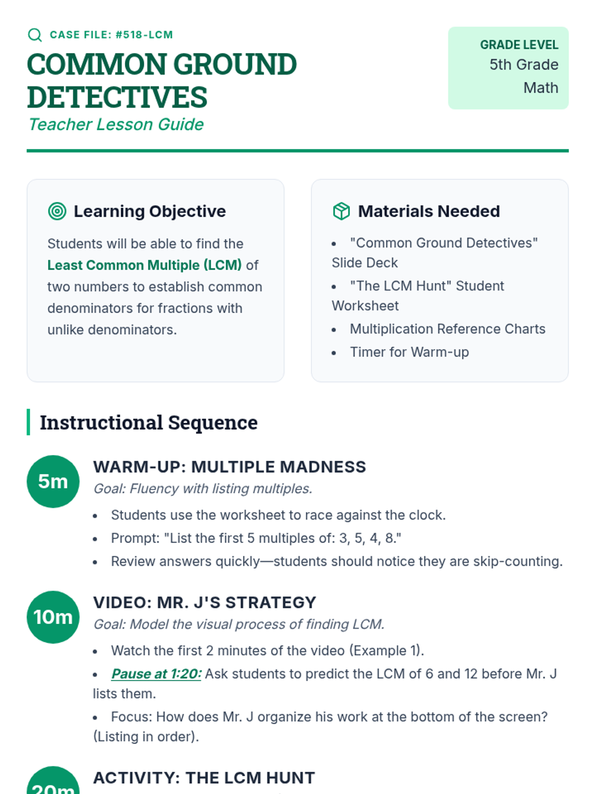 Students will learn how to find the Least Common Multiple (LCM) to create common denominators for fractions with unlike denominators, featuring a video-based demonstration and a hands-on 'hunt' activity.